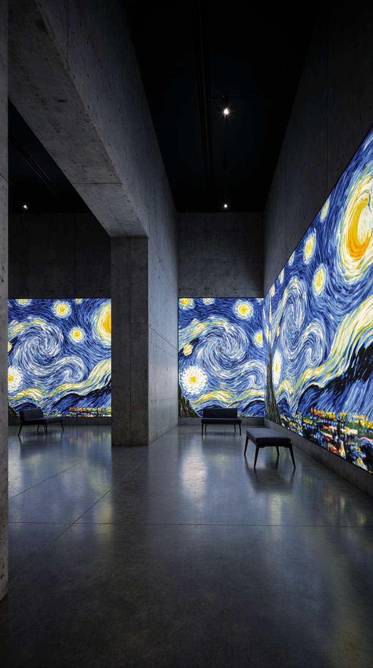 high-end futuristic tower gallery interior, exposed concrete walls, immersive digital art projections inspired by Van Gogh’s swirling night skies, soft ambient lighting, minimal seating, sleek modern atmosphere, aesthetic harmony between architecture and projection art, cinematic wide shot