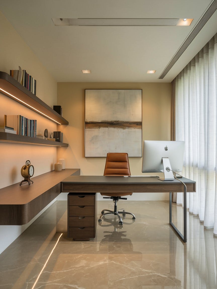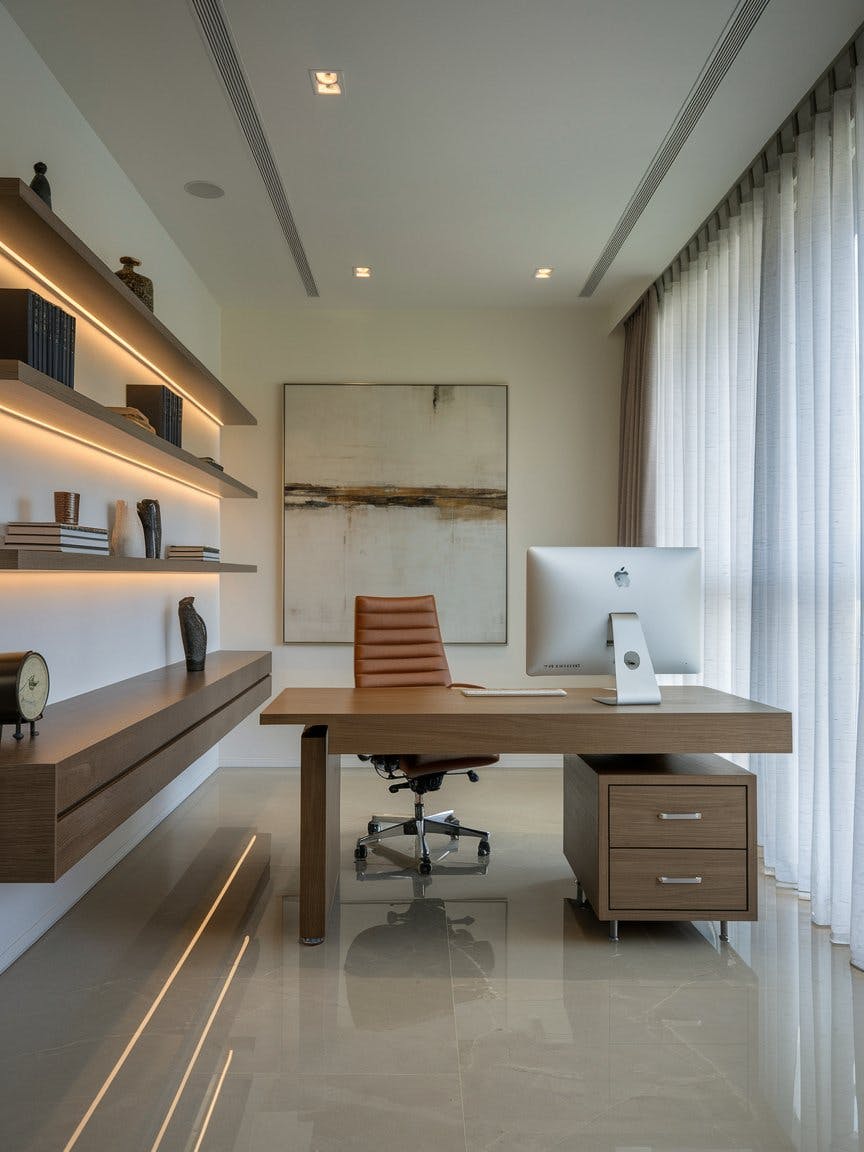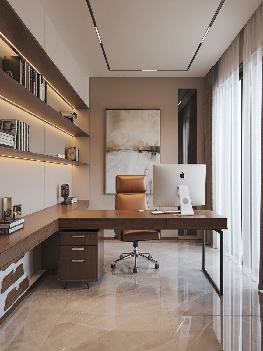A modern home office with a minimalist design, featuring a sleek wooden desk with an integrated drawer unit, a comfortable brown leather swivel chair, and a large iMac computer. The floating wooden shelves with built-in LED lighting hold neatly arranged books, decorative pieces, and a small vintage clock. A large abstract painting with neutral tones adorns the wall, complementing the warm beige and brown color palette. The space is illuminated by recessed ceiling lights and natural light filtering through sheer curtains covering a floor-to-ceiling window. The glossy marble flooring adds a touch of elegance, while the overall ambiance exudes sophistication and productivity.