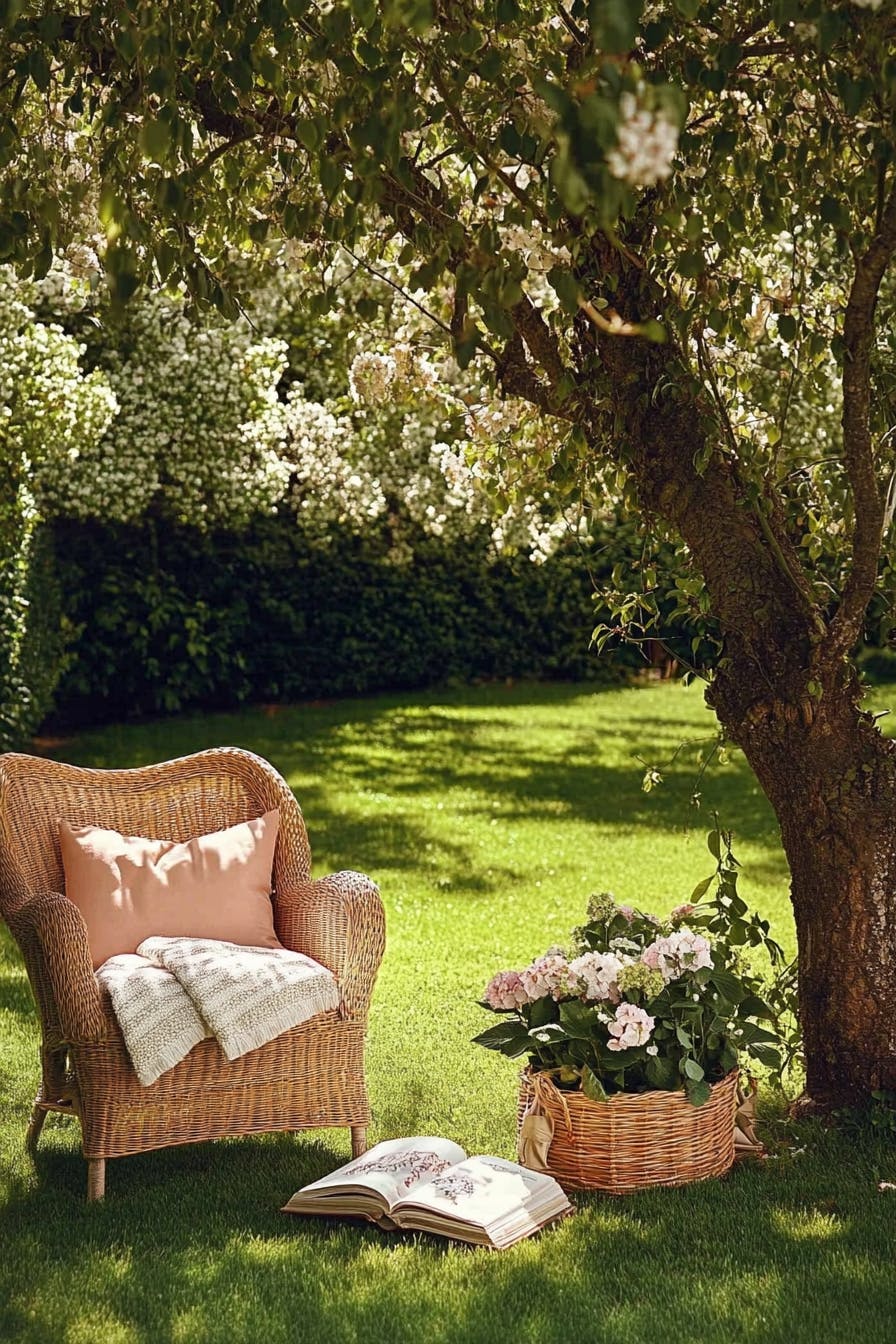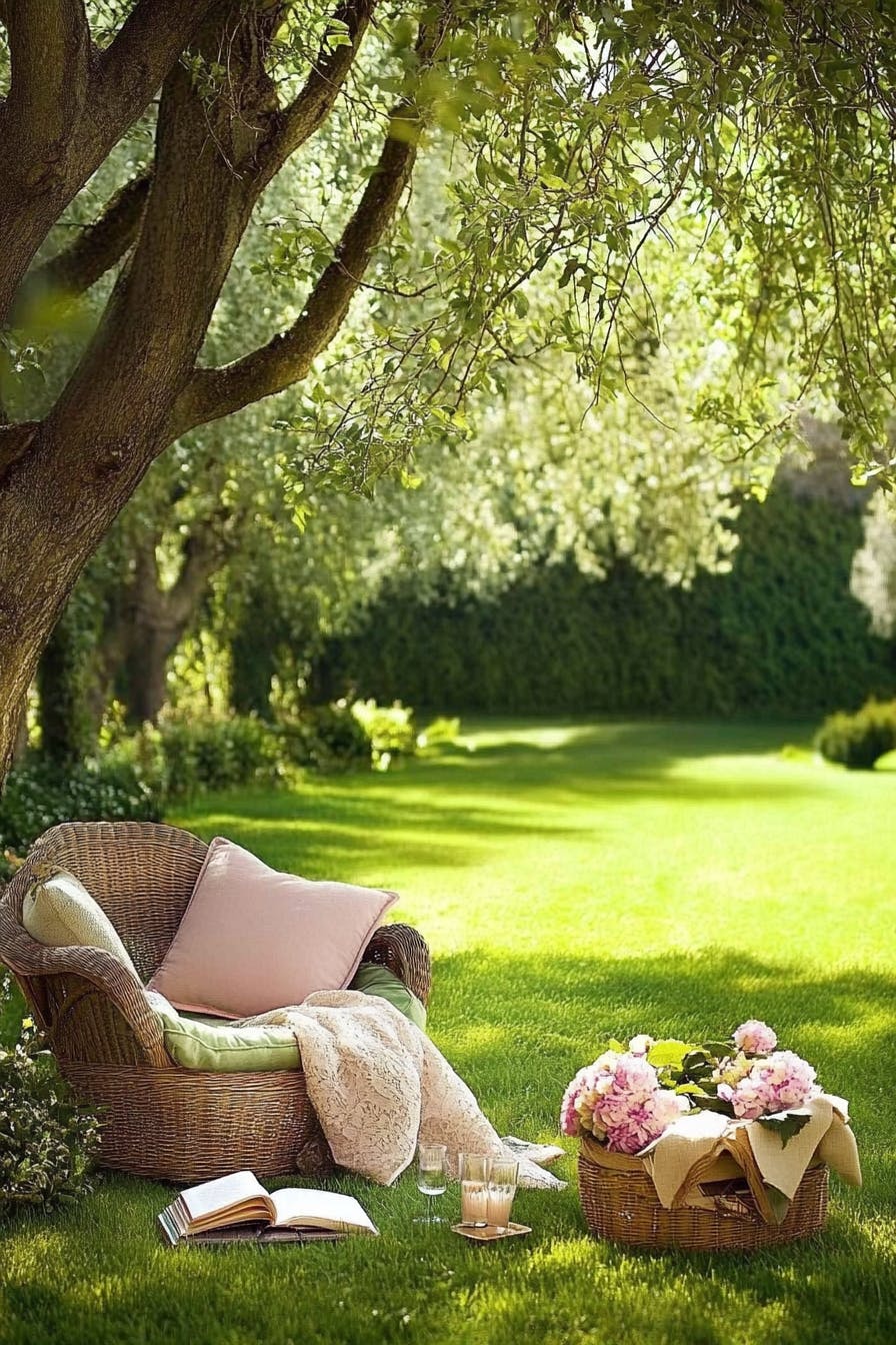 https://s.mj.run/_G0XX8-XEo4 Sunny garden retreat, dappled sunlight filtering through lush green trees, a cozy wicker chair with soft pastel pink cushions, a picnic basket with fresh flowers resting nearby, a plush pillow and an open book on vibrant green grass, tranquil and inviting atmosphere, Pinterest aesthetic, warm vintage filters, serene outdoor relaxation vibes. --chaos 10 --ar 2:3
