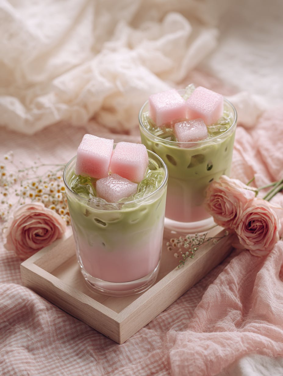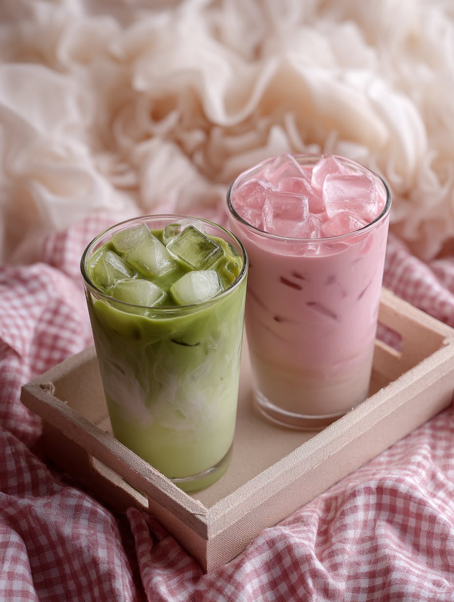 Iced pink and green matcha drinks in clear glasses, layered strawberry milk and matcha, large rose-colored ice cubes, aesthetic drink presentation, placed in a beige cardboard drink tray, soft pastel tones, cozy and cute café vibes, retro pink gingham cloth beneath, ruffled cream fabric in the background, top-down view, dreamy lighting, minimal and sweet style, kawaii beverage aesthetic, vibrant color contrast, photorealistic detail, soft textures