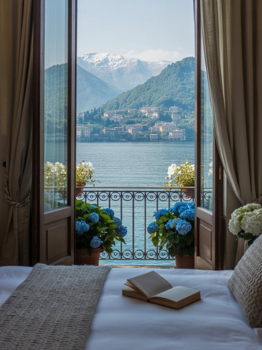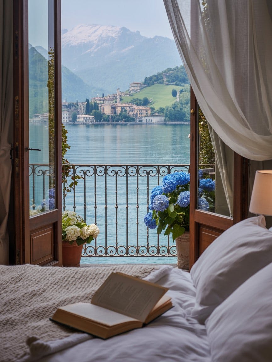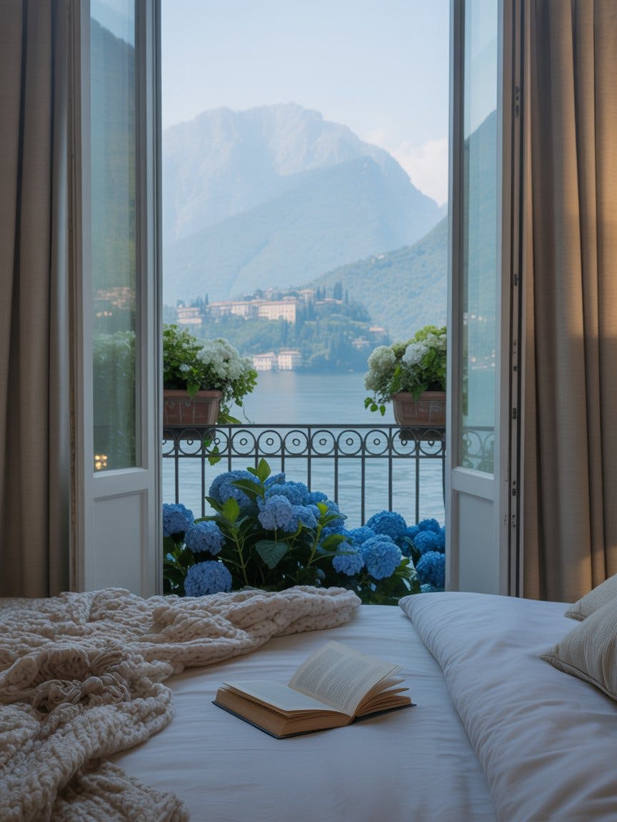Cozy lakeside bedroom with open balcony doors, serene lake view with calm water, distant Italian villas nestled in green hills, majestic mountains in the background with snow-capped peaks, elegant wrought-iron balcony railing, soft natural light streaming in, fluffy white bedding with textured knit throws, open book resting on bed, vibrant blue hydrangeas in the foreground, potted white flowers on balcony, peaceful and romantic atmosphere, refined luxury, relaxed vacation mood, high-resolution photo-realism, natural color palette, soft focus background, gentle breeze implied through light curtain movement, cinematic composition, Lake Como aesthetic, ultra-detailed textures, dreamy lighting