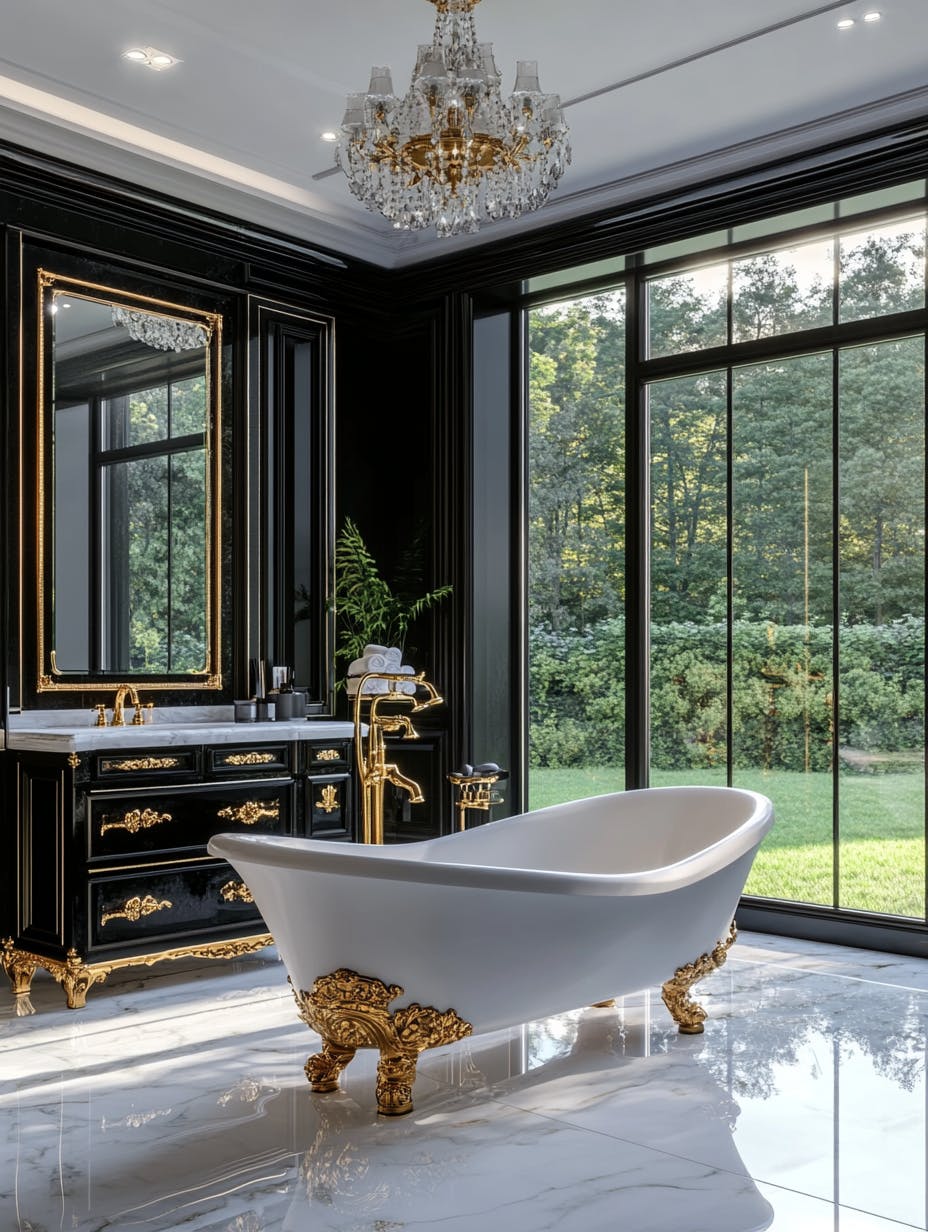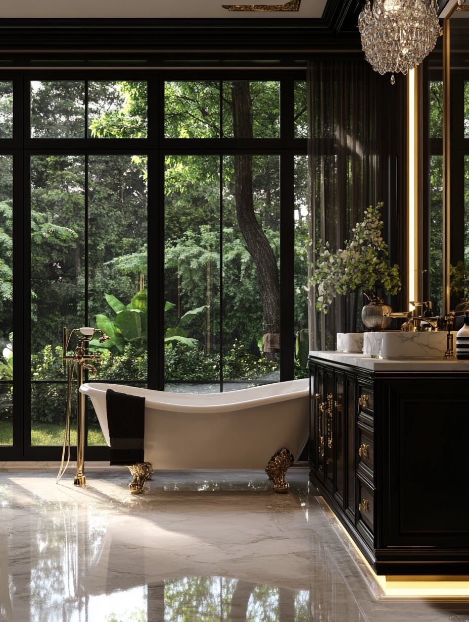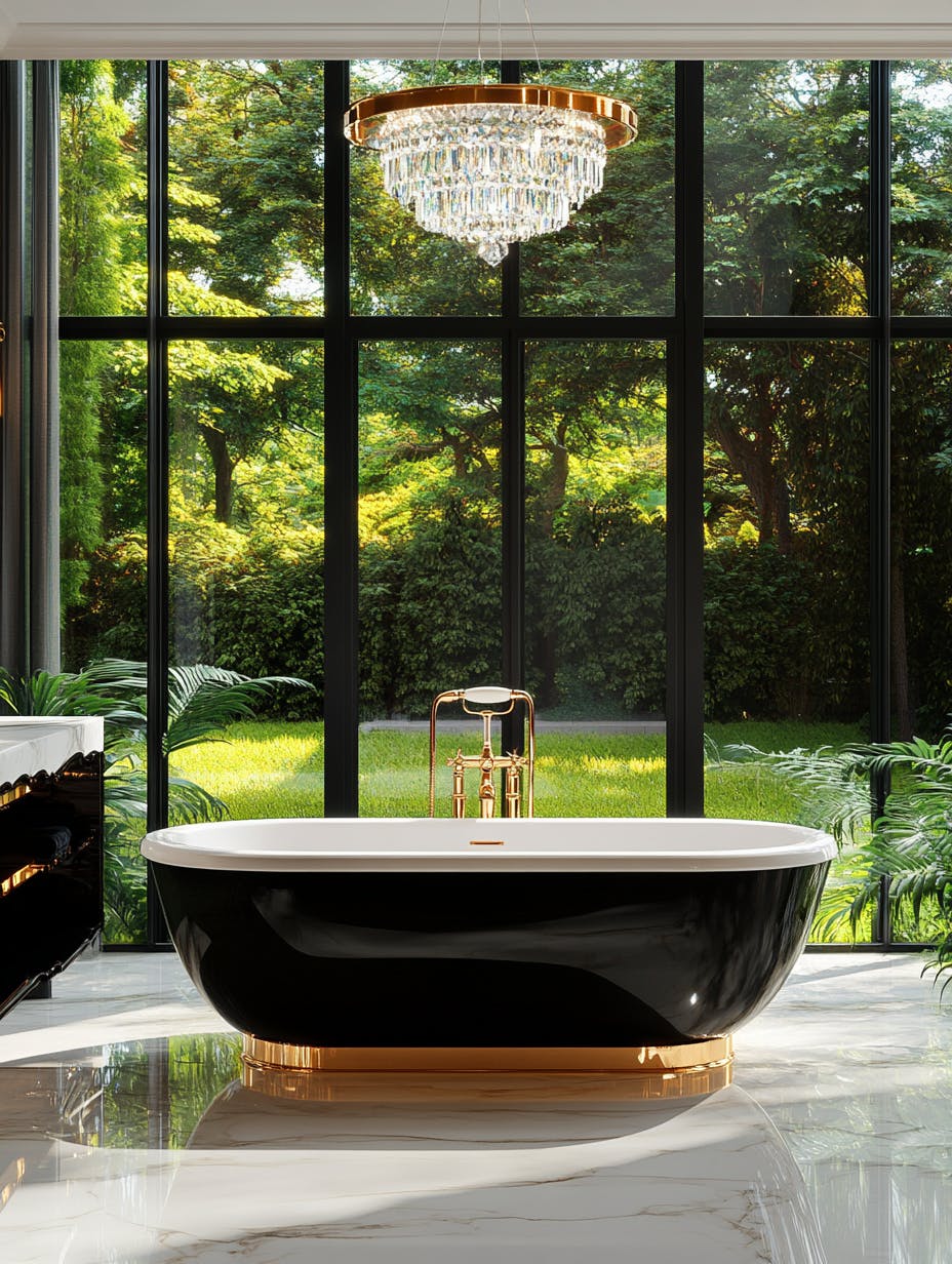 Luxurious bathroom, elegant marble bathtub, floor-to-ceiling black-framed windows, natural daylight streaming in, lush green garden view, high-gloss marble flooring, black and gold vanity with white marble countertop, crystal chandelier, modern classic interior, sophisticated ambiance, high-end spa aesthetic, serene and opulent atmosphere. --ar 3:4
