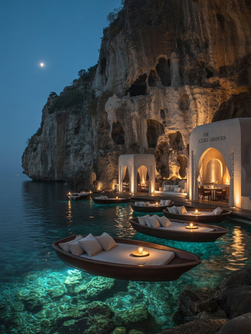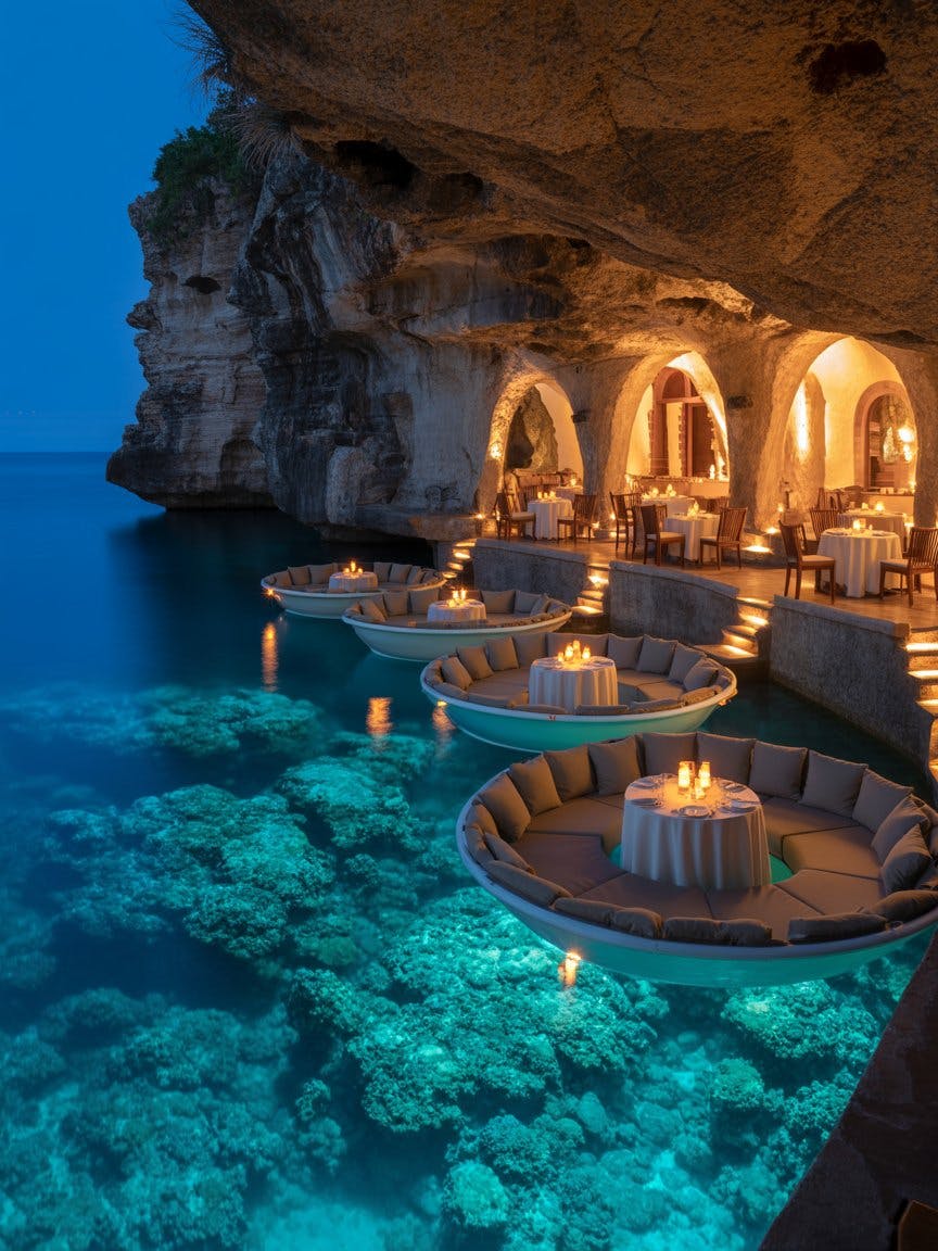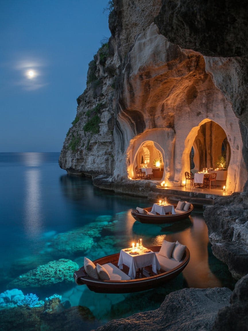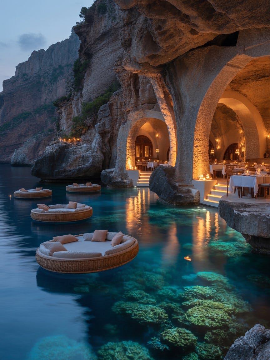 Luxurious cave restaurant by the sea, glowing candlelit ambiance, floating round boats with plush cushions, crystal-clear turquoise water revealing coral below, romantic and serene atmosphere, soft golden lighting from cave interiors, cliffside carved arches opening into elegant dining spaces, moonlit evening setting, dreamy and magical vibe, cozy and intimate design, gentle reflections on water, high-end coastal retreat, ethereal and enchanting mood, inspired by Mediterranean elegance