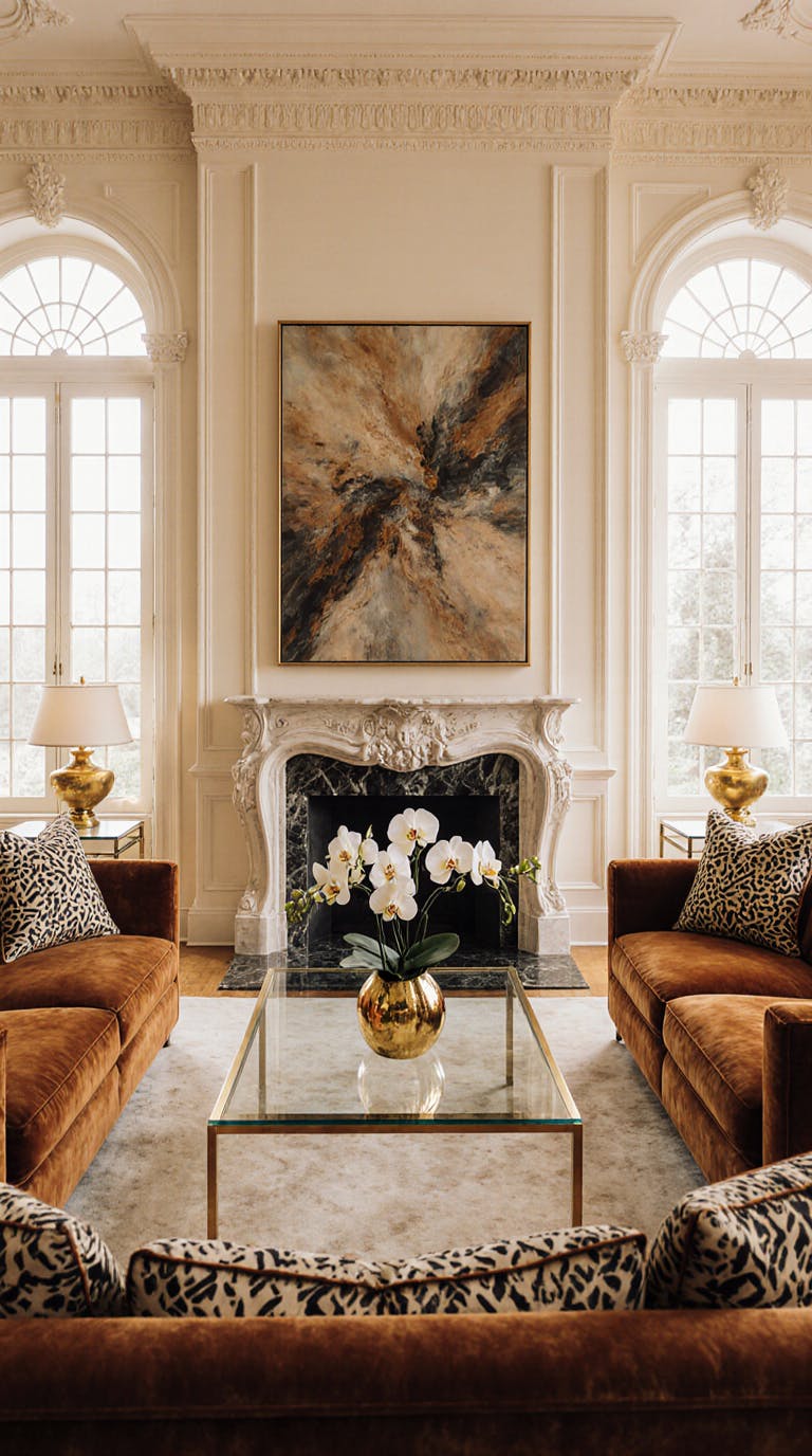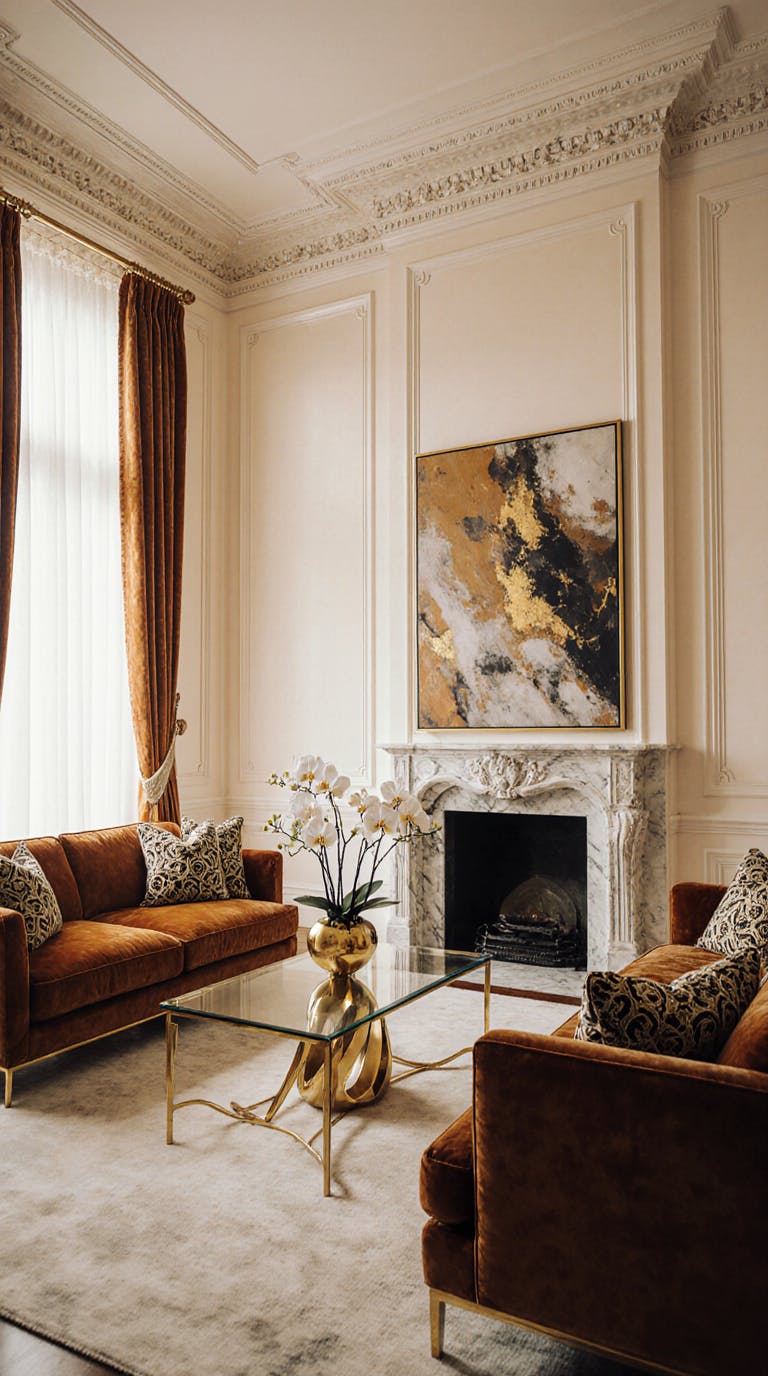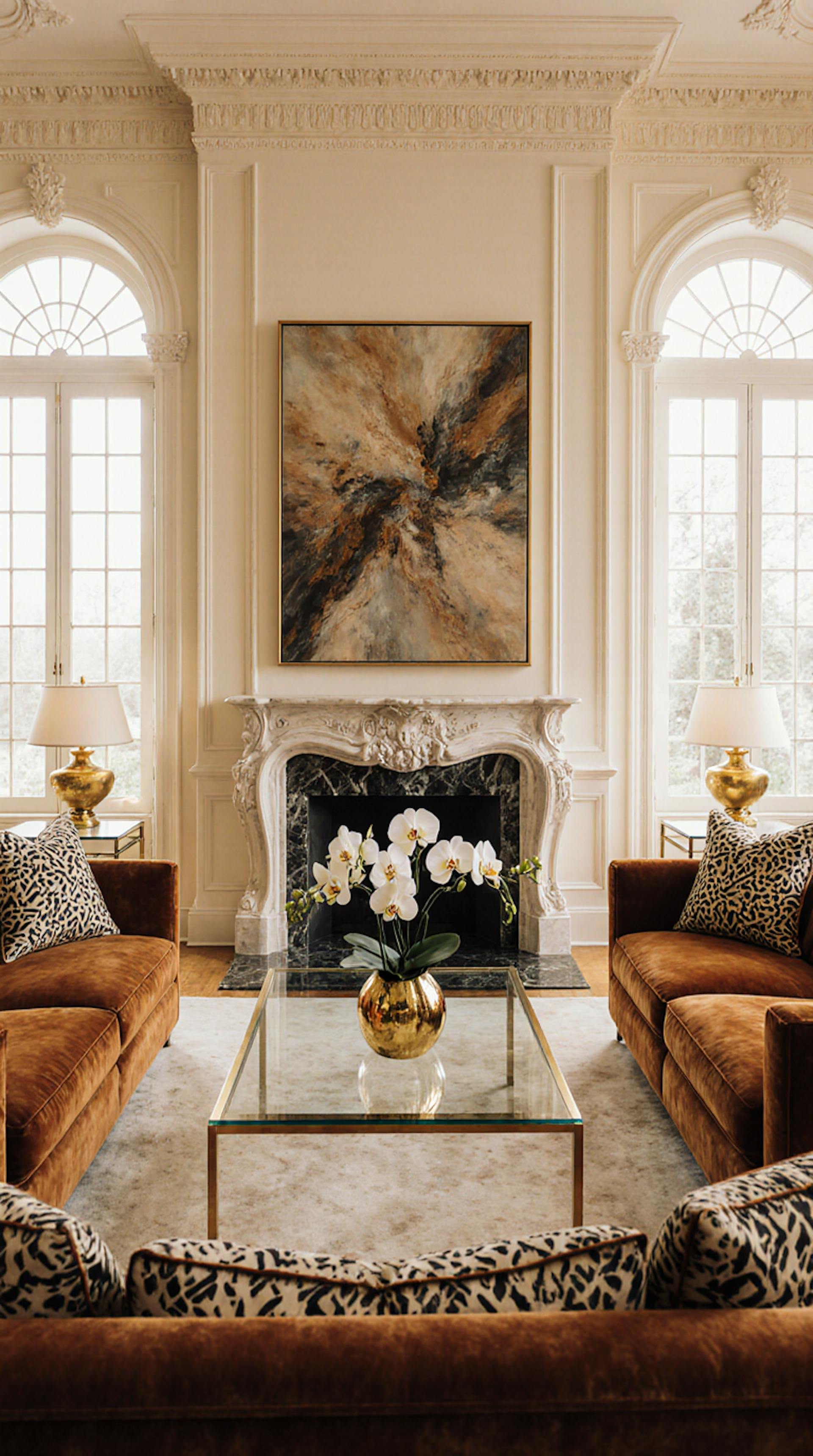luxurious grand living room, terracotta velvet sofas with patterned cushions, gold and brass accents, marble fireplace centerpiece, large modern abstract painting, tall ceilings with ornate molding, warm ivory walls, symmetrical layout, soft natural light through tall windows, glass coffee table with sculptural base, orchids in a golden vase, editorial interior photography
