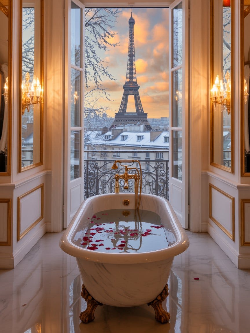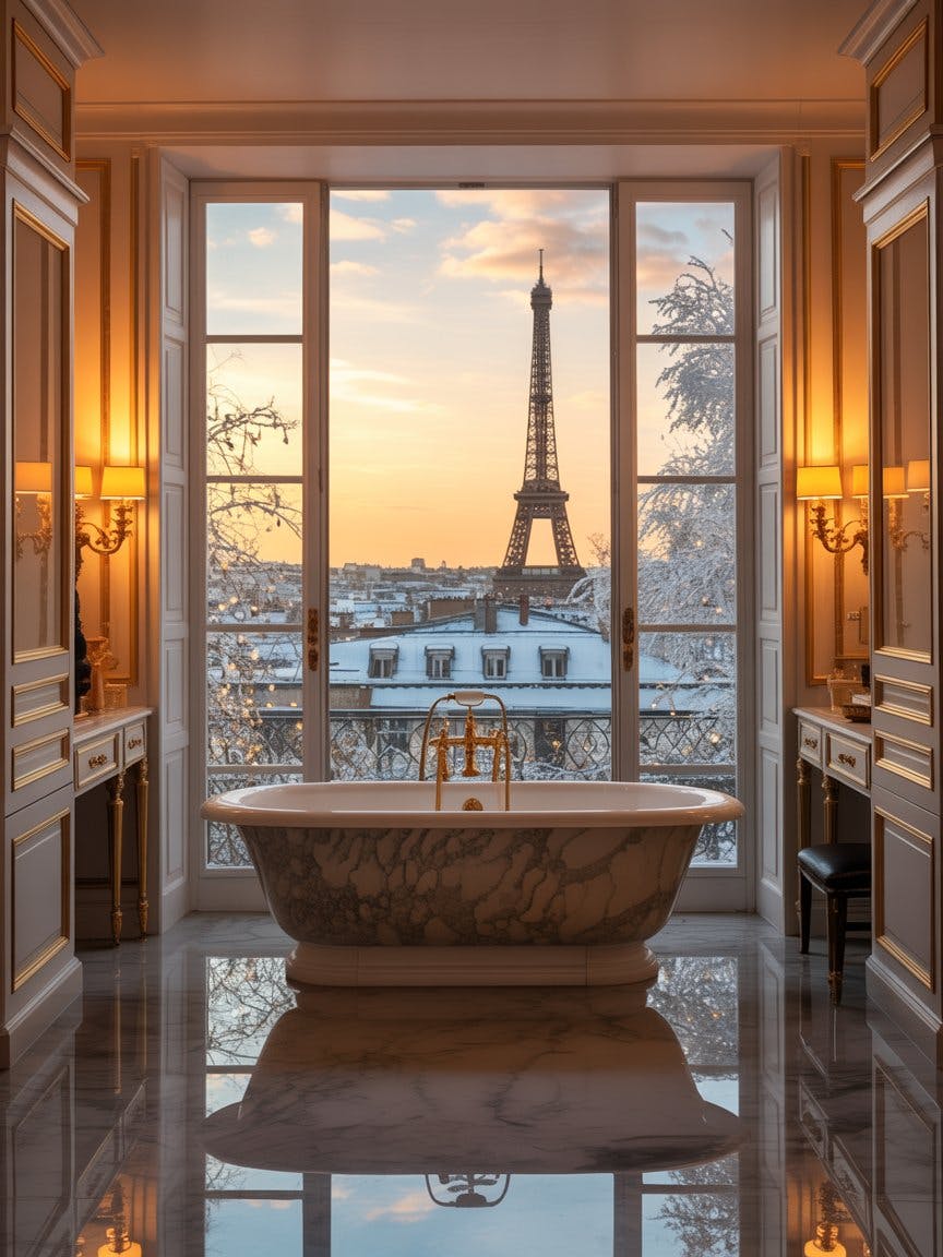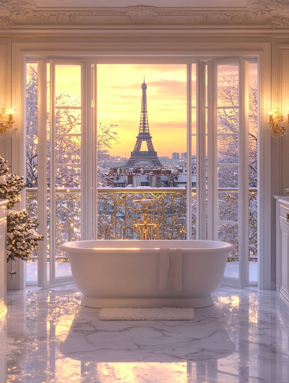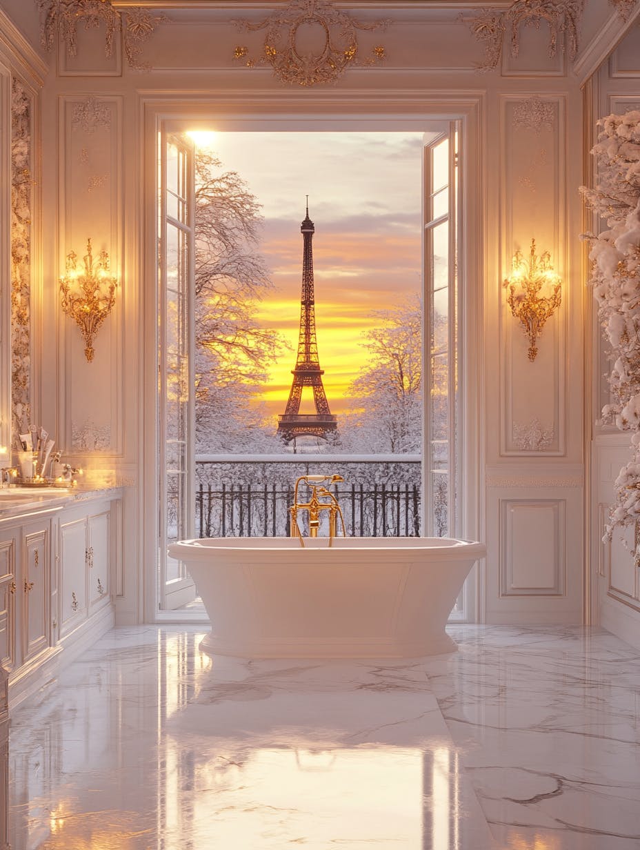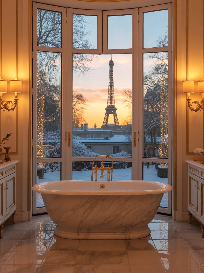 Luxurious Parisian bathroom, opulent marble bathtub centered in front of tall French doors, golden hour sunset casting warm light, Eiffel Tower framed perfectly in the distance, snow-covered trees and rooftops outside, golden wall sconces glowing softly, elegant white and gold paneled cabinetry, polished marble floors with reflections of light, classic Haussmann-style architecture, ornate details, romantic ambiance, high-end hotel or penthouse suite aesthetic, cozy winter atmosphere, cinematic composition, refined Paris luxury, dreamy golden-orange sky, soft fairy lights outside, ultra-realistic, rich textures, elegant interior design, serene and sophisticated mood.