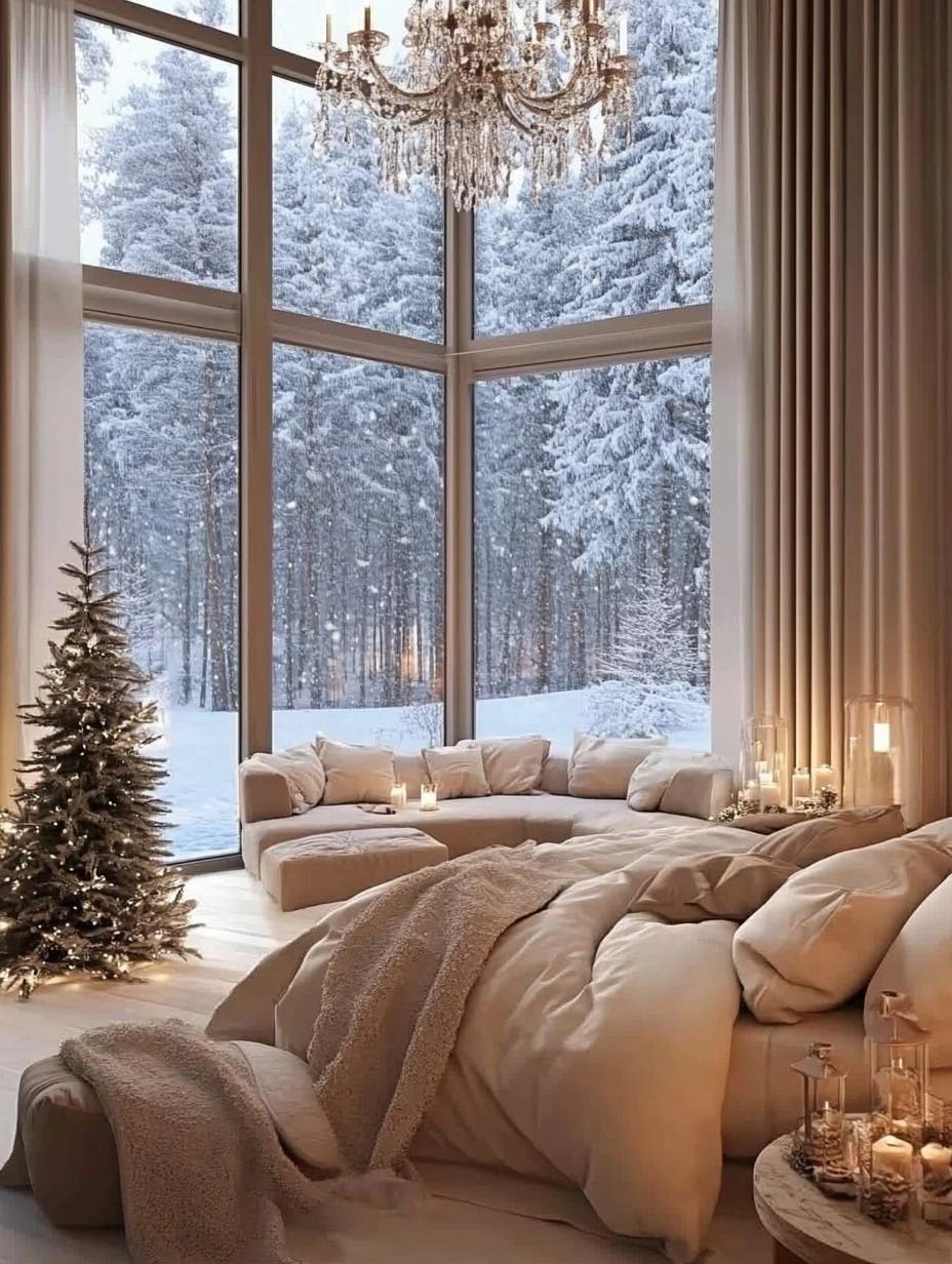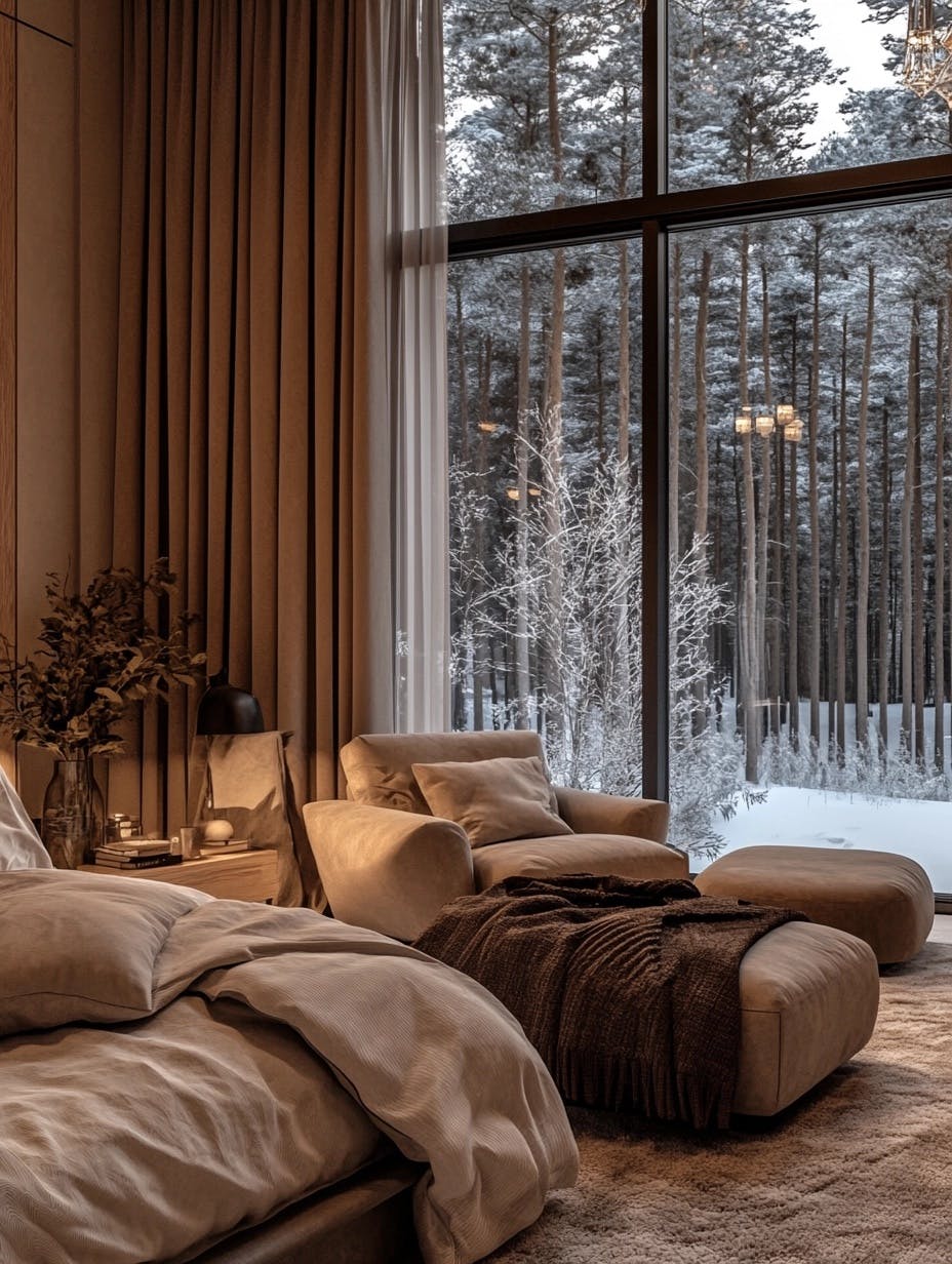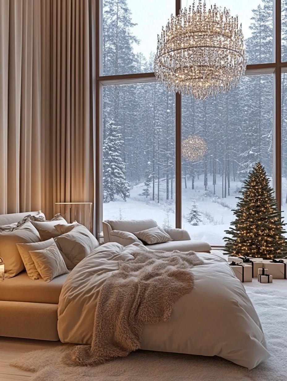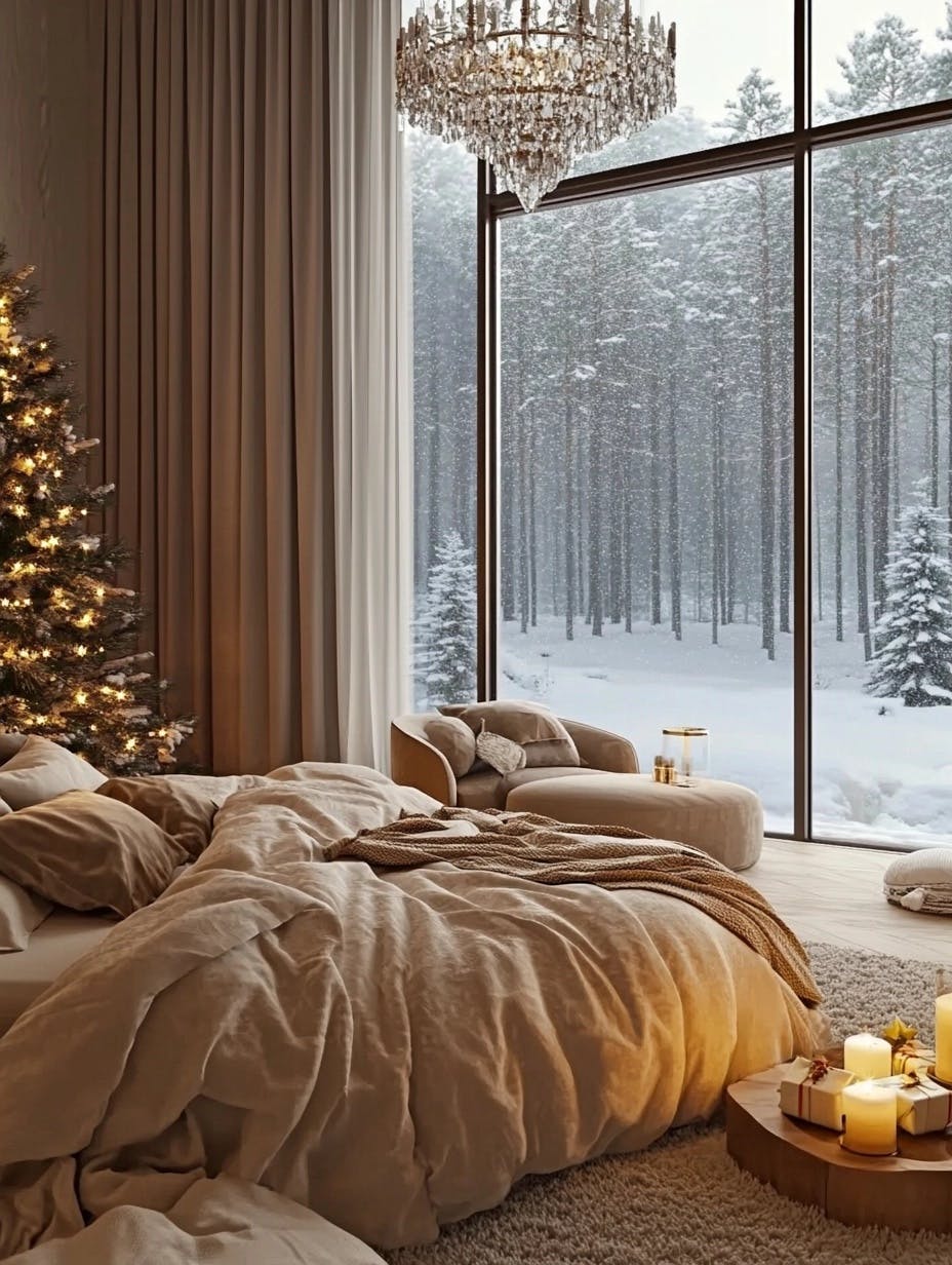 Luxurious winter retreat bedroom, floor-to-ceiling glass windows showcasing a serene snow-covered forest, soft snowfall visible outside, high vaulted ceilings, elegant cream and beige tones throughout, plush bedding with layered blankets and pillows, cozy modern furniture, minimalist armchairs arranged around a soft ottoman, neutral area rug complementing the warm palette, ambient lighting with sleek table lamps, a grand crystal chandelier hanging from the ceiling, layered sheer and blackout curtains framing the windows, delicate frosted tree branches as decor, natural wood and soft upholstery details, serene and warm ambiance, perfect for a tranquil winter evening, high-resolution and intricate textures. --chaos 10 --ar 3:4 --v 6.1