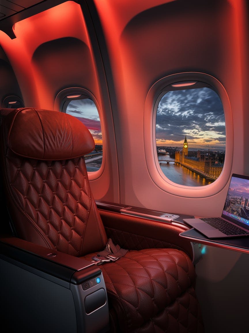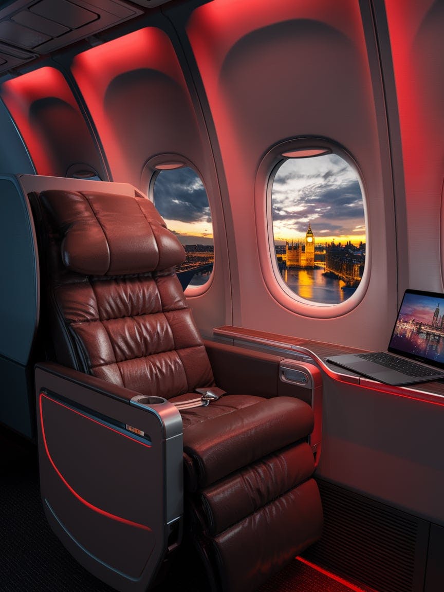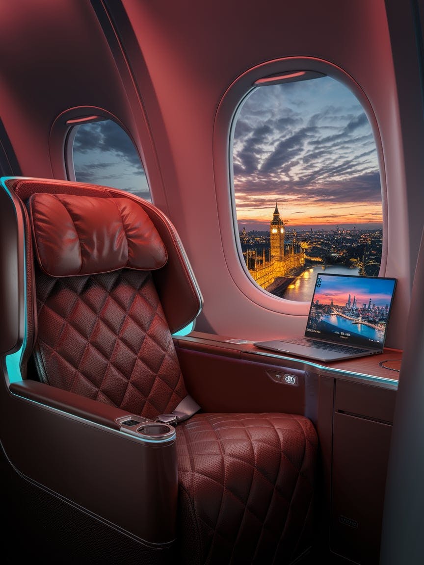 Luxury airplane window seat, brown plush leather reclining chair, ambient cabin lighting, sleek modern design, a laptop on the side table displaying a vibrant cityscape, breathtaking aerial view of London at sunset, Big Ben and the River Thames illuminated by golden city lights, dramatic twilight sky with scattered clouds, ultra-realistic, cinematic lighting, high detail, cozy yet futuristic atmosphere, immersive travel experience