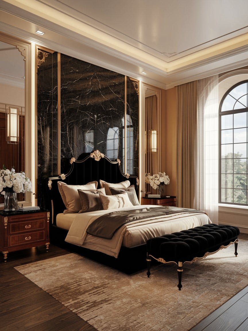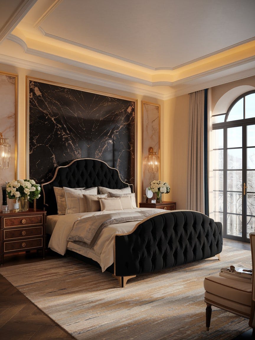 Luxury bedroom interior, grand upholstered bed in black velvet, elegant bedding with plush pillows, dramatic black marble accent wall with gold trim, soft ambient lighting, classic European-style paneling, floor-to-ceiling arched window letting in natural light, rich wooden nightstands with gold detailing, fresh white floral arrangement in a glass vase, warm beige and cream tones, cozy textured area rug, high-end hotel aesthetic, ultra-realistic, 8K, cinematic lighting, refined and sophisticated ambiance
