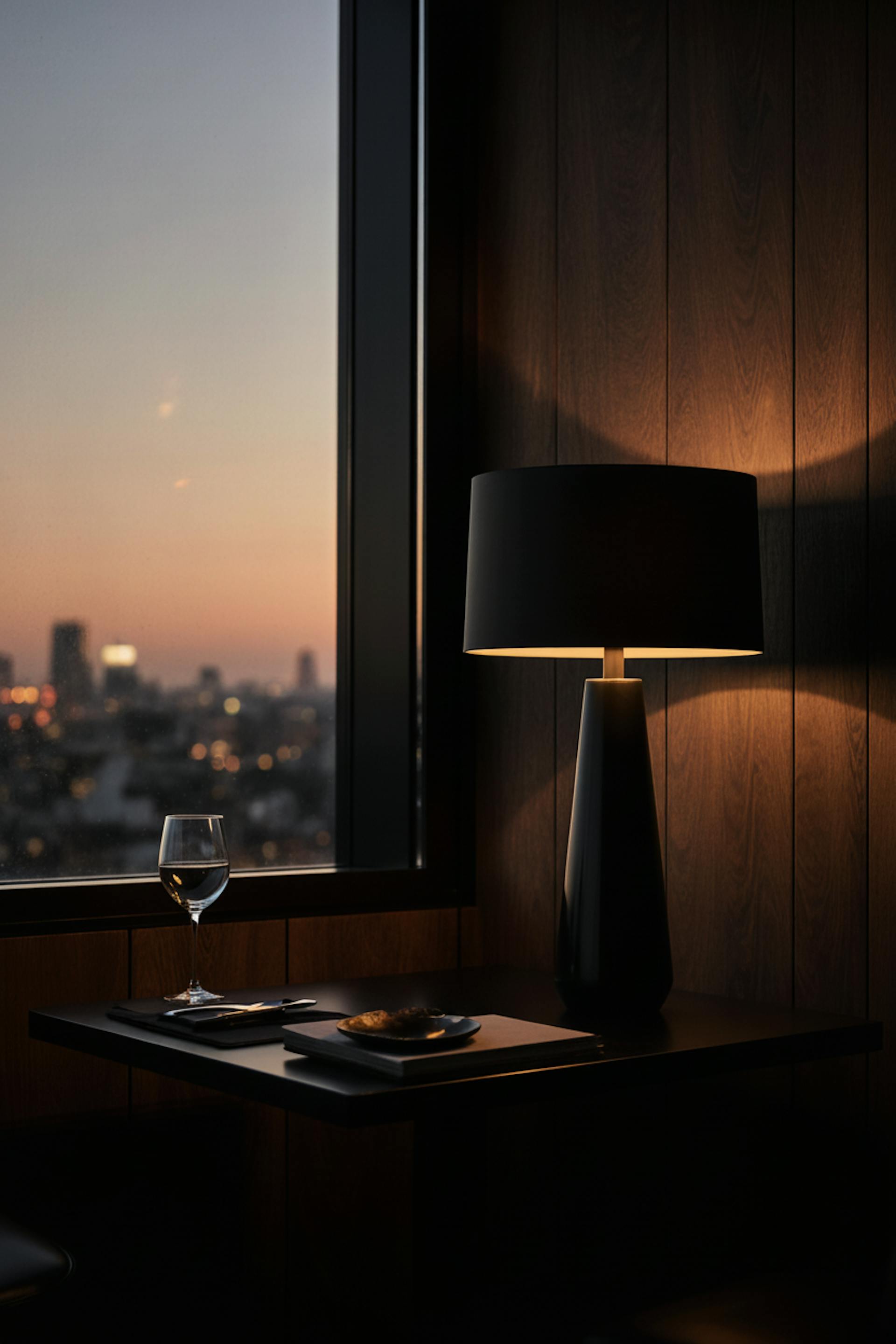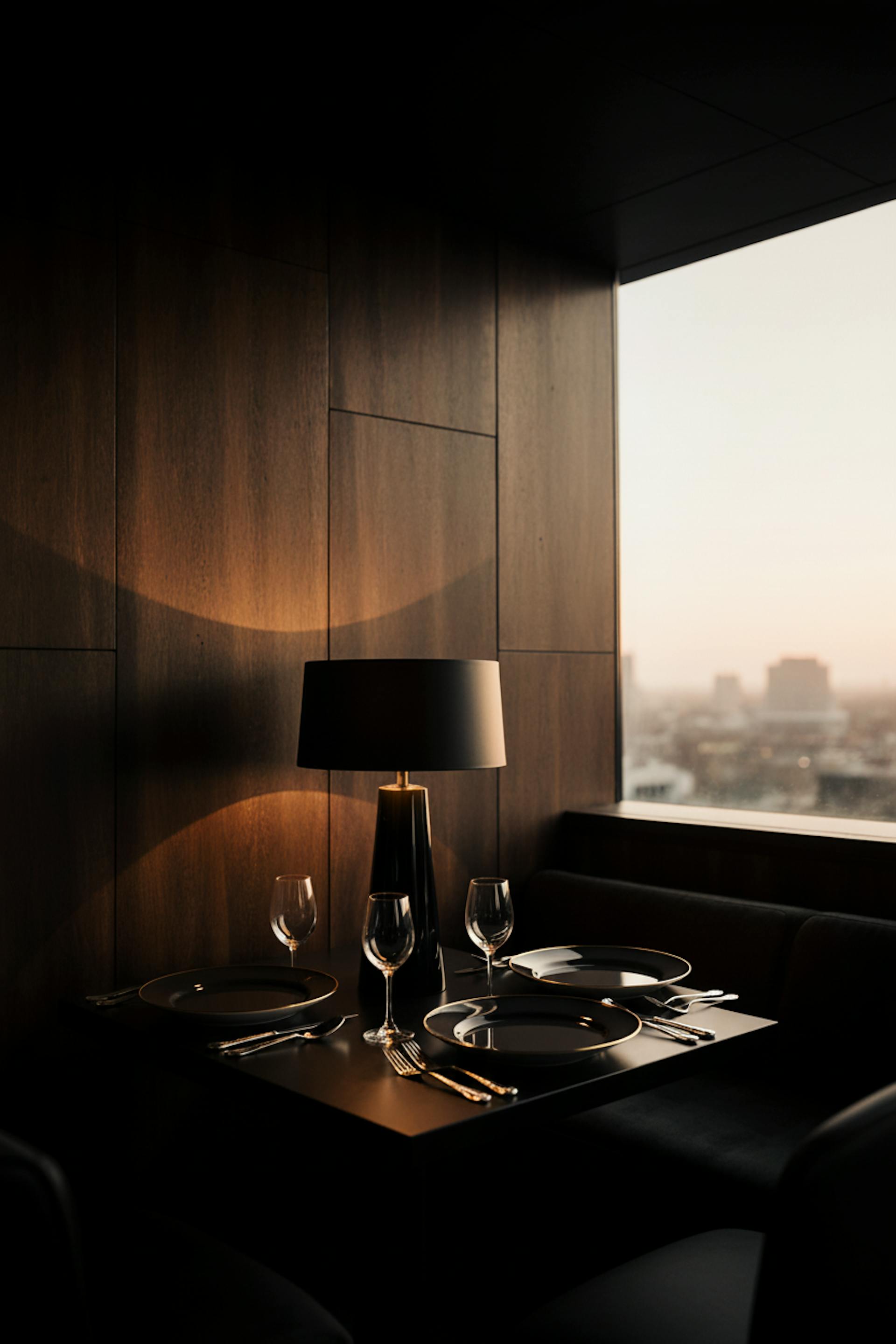 sophisticated rooftop lounge interior branding, moody wood panel walls, black designer table lamp, wine glasses arranged, dim sunset lighting, minimal luxury design, editorial magazine aesthetic, cinematic shadows, refined atmosphere