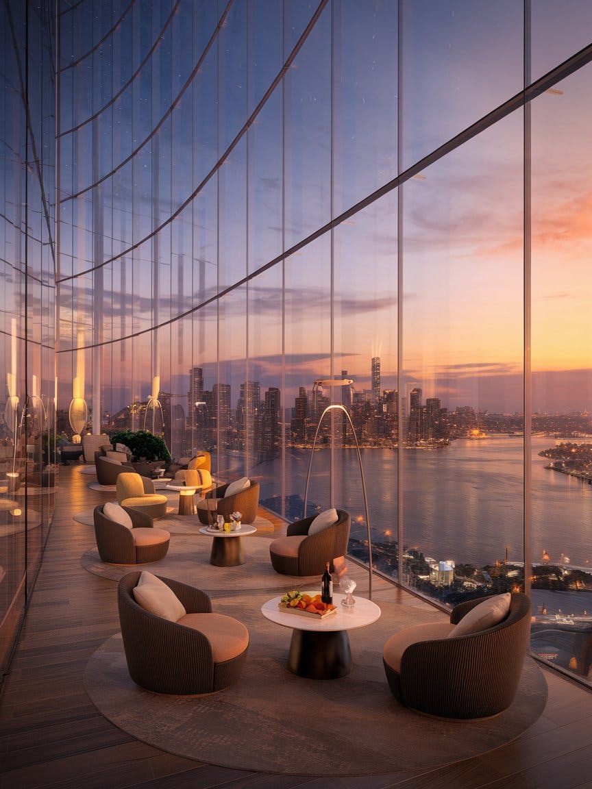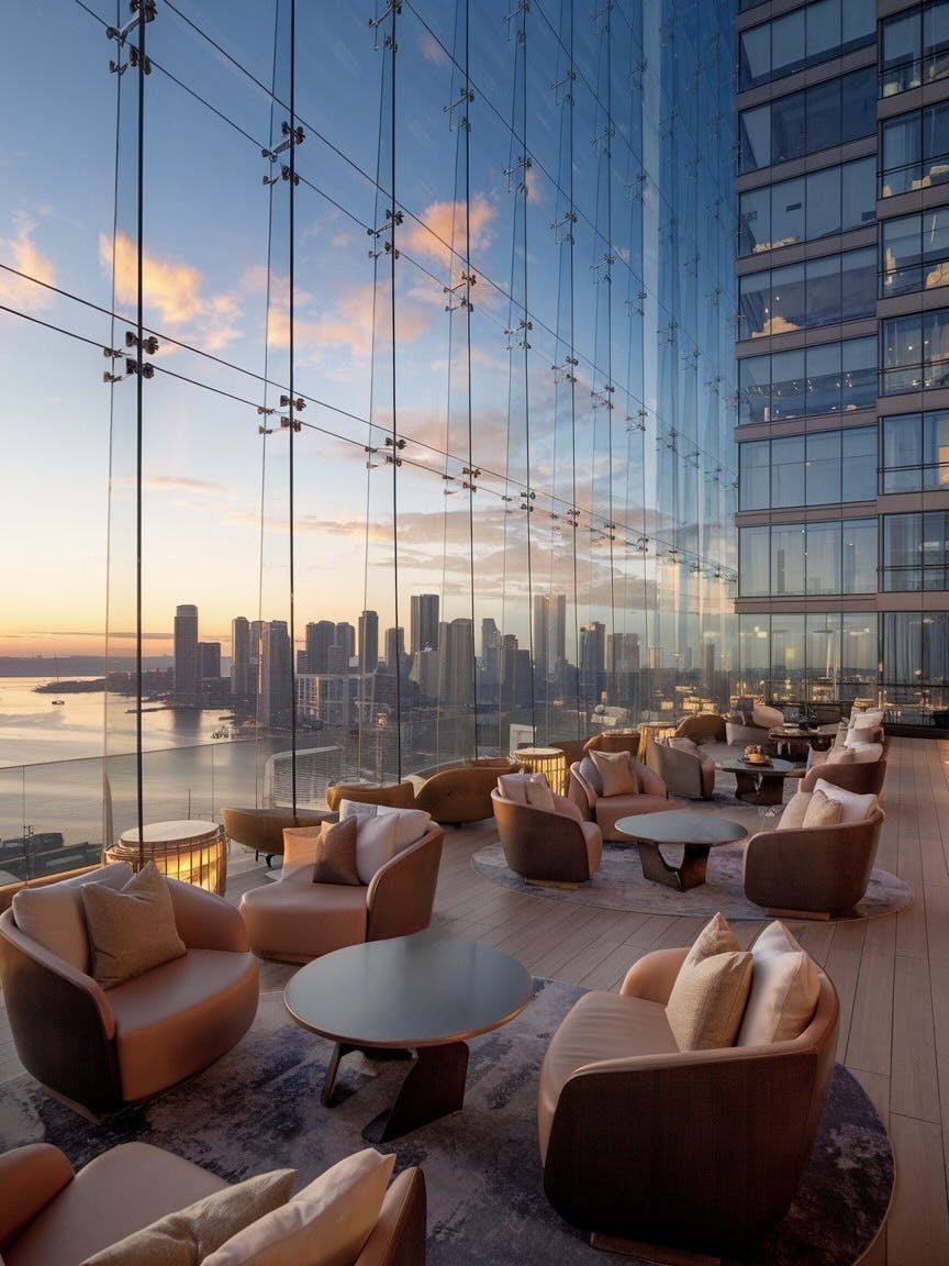 Luxury high-rise lounge, floor-to-ceiling glass windows, breathtaking city skyline and waterfront view, golden hour sunset casting warm hues, modern minimalist interior, sleek wooden flooring, cozy lounge chairs, stylish round tables with elegant decor, ambient lighting, soft and relaxing atmosphere, a bottle of wine and fruit on the table, panoramic view of twinkling city lights, tranquil and sophisticated vibe, perfect for unwinding, cinematic aesthetic, ultra-HD, highly detailed, realistic lighting.