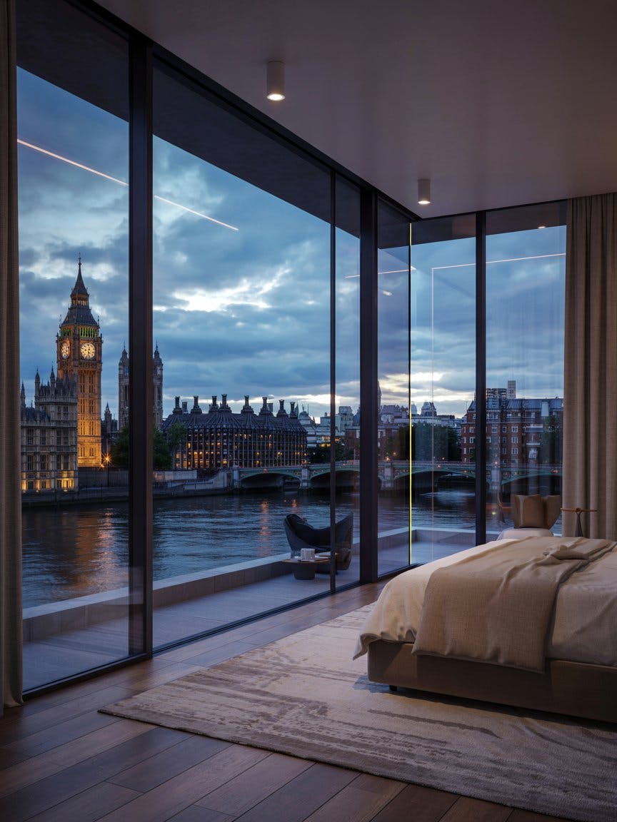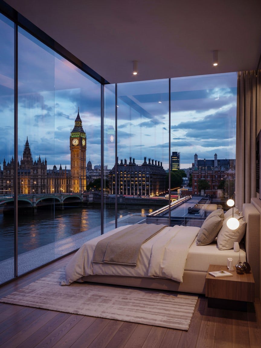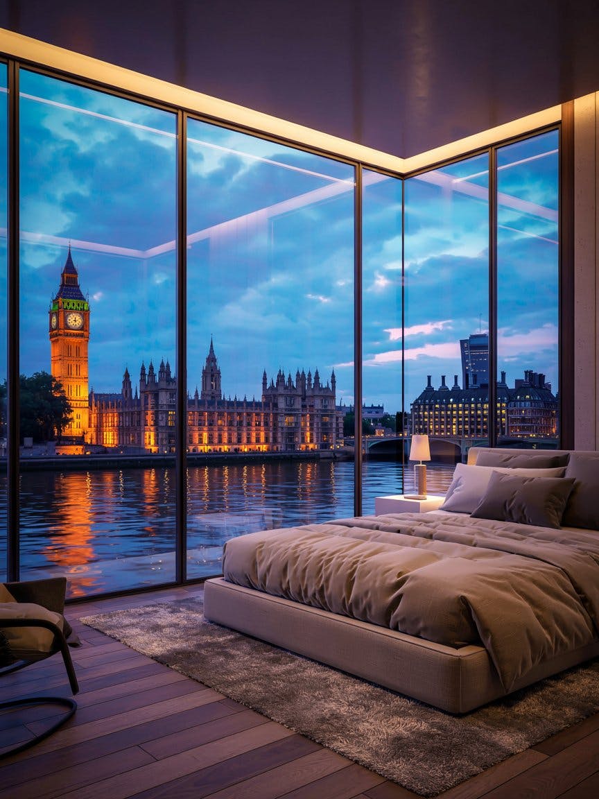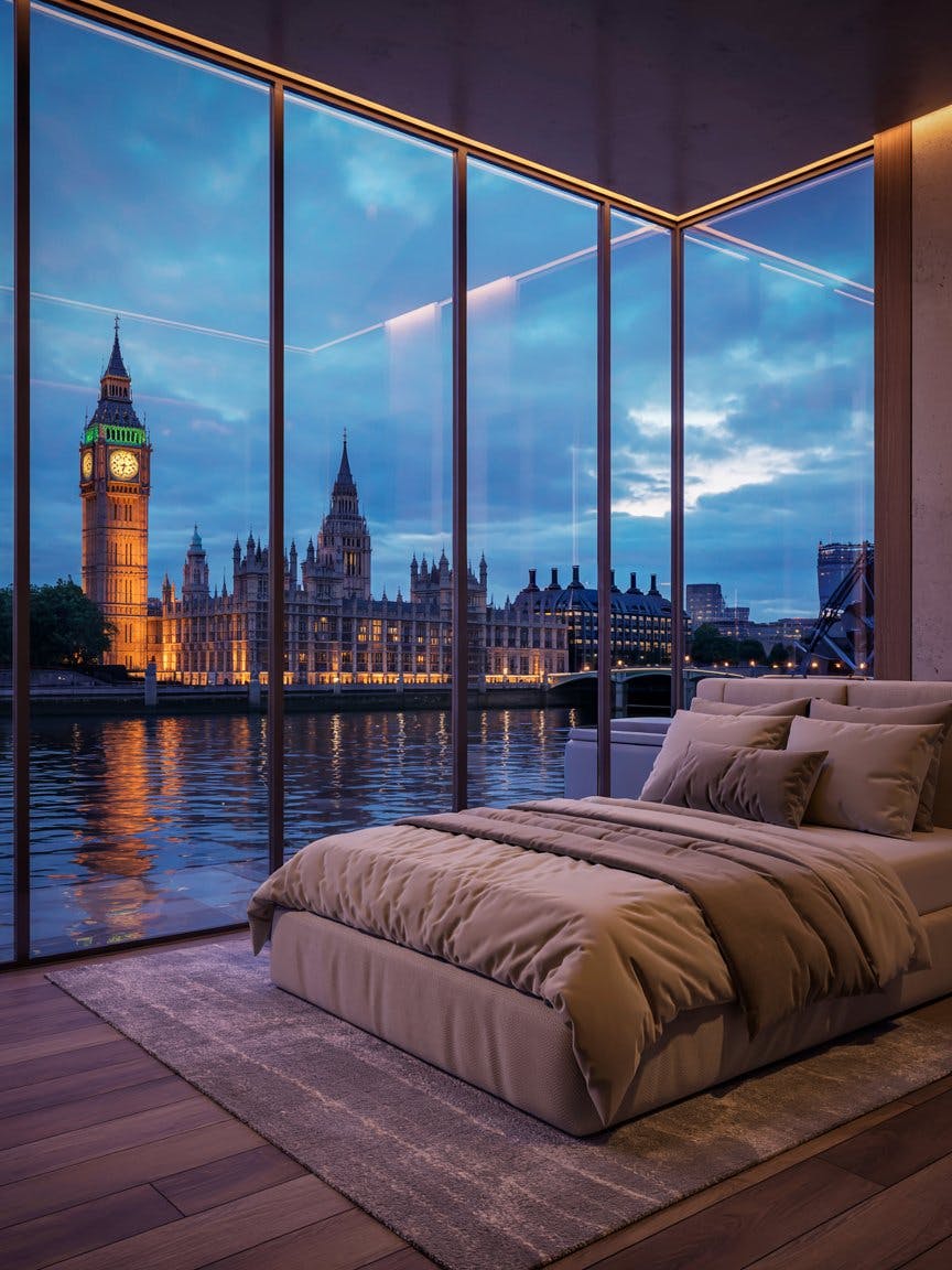 Luxury modern bedroom, floor-to-ceiling glass windows with panoramic view of Big Ben and the River Thames at dusk, warm ambient lighting, cozy beige and taupe bedding, wooden interior accents, soft rug on hardwood floor, elegant contemporary design, reflections of city lights on the water, moody blue evening sky with scattered clouds, sophisticated urban atmosphere, cinematic lighting, high-end apartment aesthetic, peaceful and serene mood, ultra-realistic details, architectural photography style, high-definition rendering, golden hour glow
