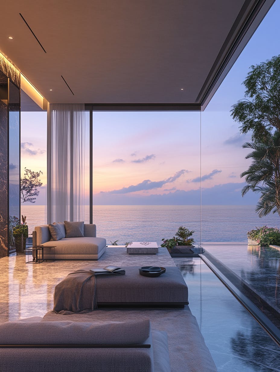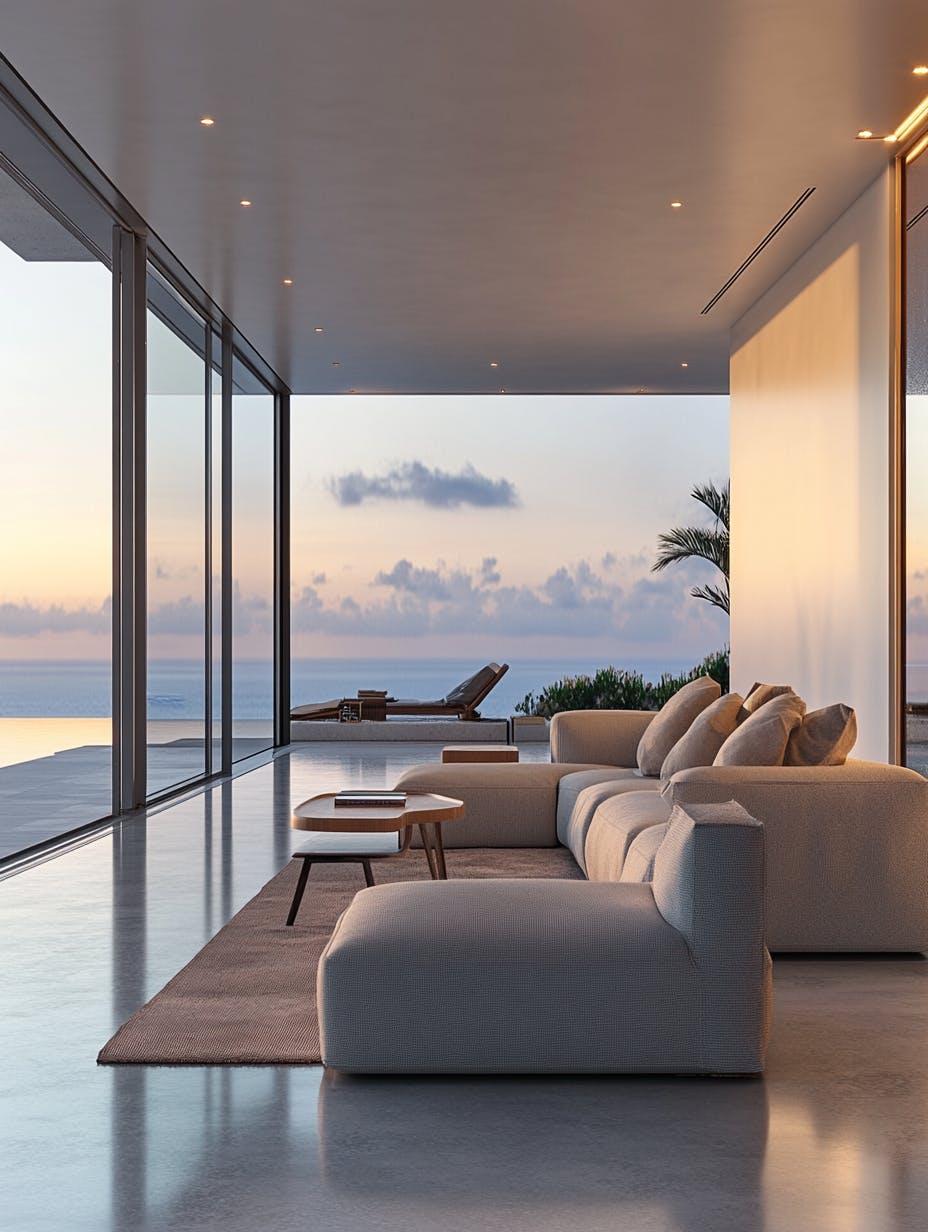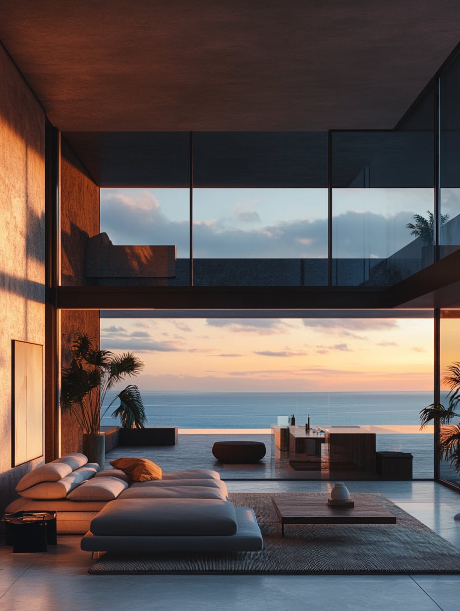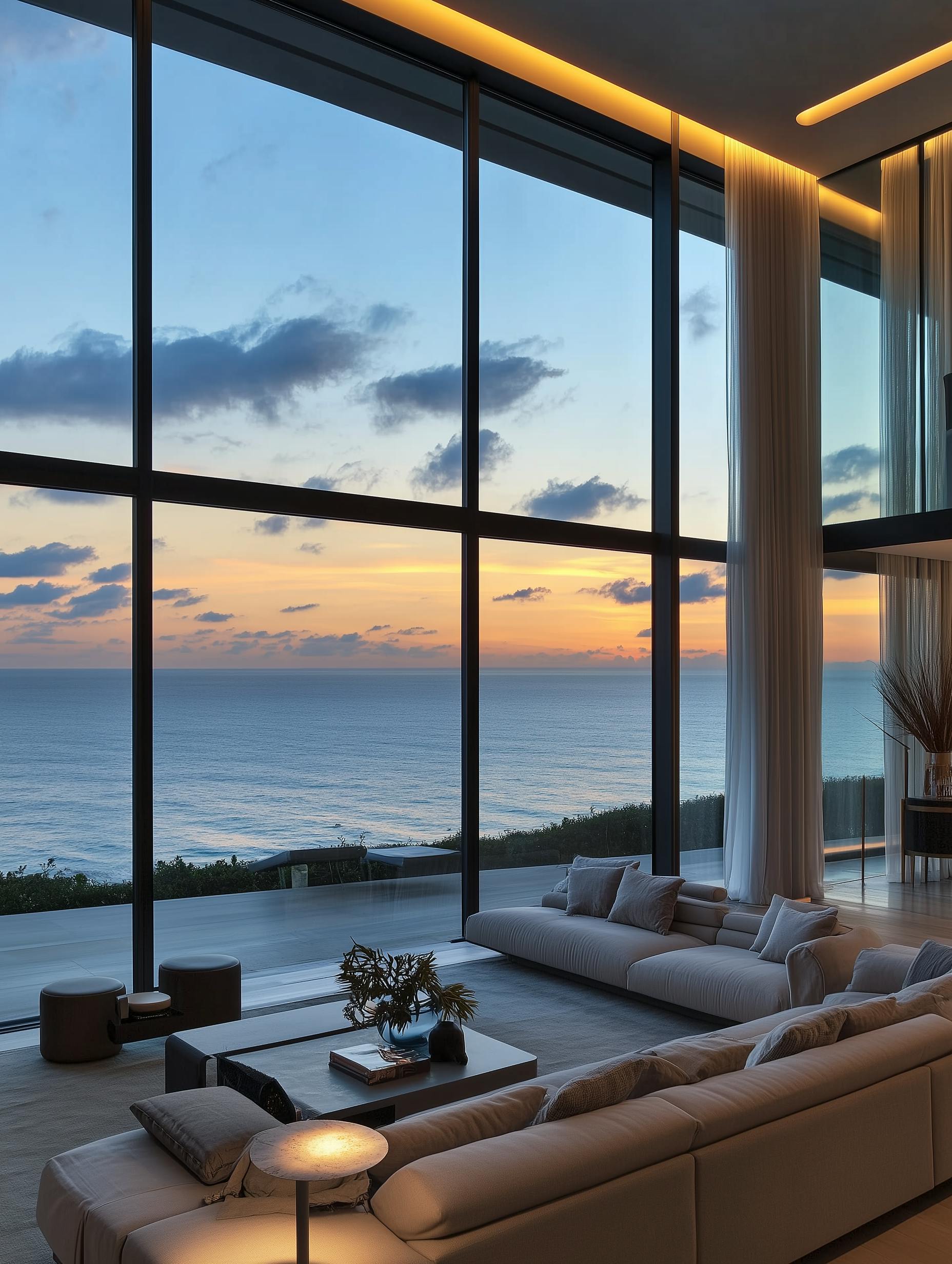 Luxury modern living room with floor-to-ceiling glass walls, a panoramic ocean view, soft sunset lighting, minimal decor, ultra-realistic Nikon photography --no blur, out of focus, overexposure, under-saturated, noise, artifacts --chaos 10 --ar 3:4 --v 6.1