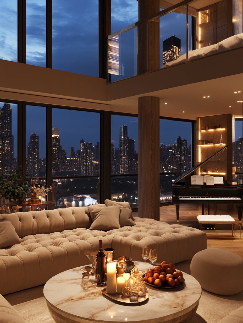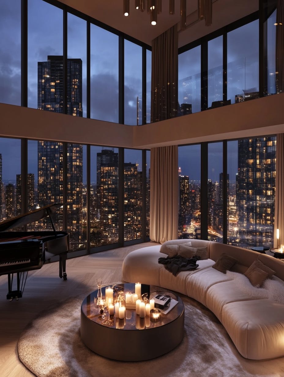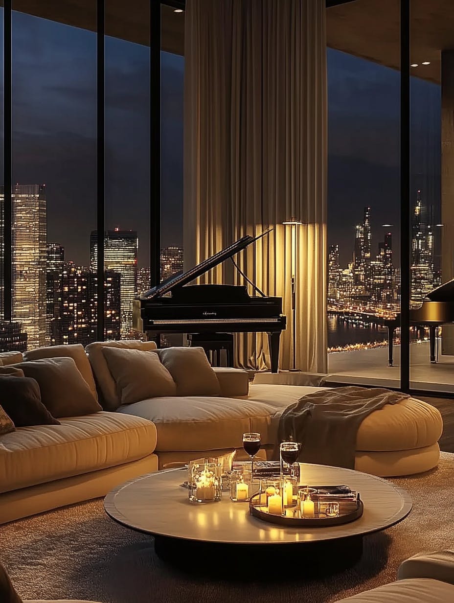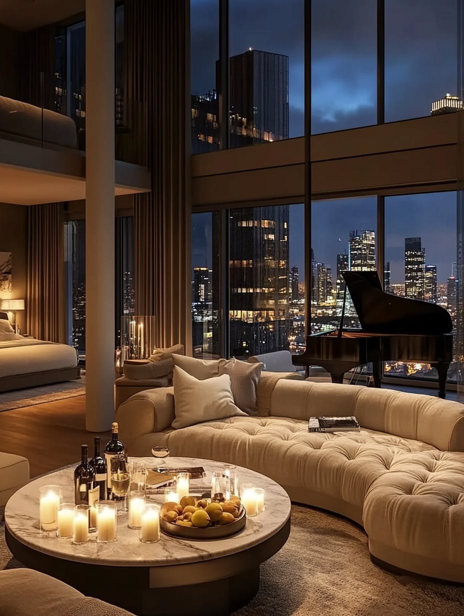 Luxury penthouse with floor-to-ceiling glass windows, breathtaking city skyline view at night, warm ambient lighting, modern minimalist interior, plush beige furniture, elegant round coffee table with lit candles and wine, cozy bedroom area with a king-sized bed, soft draped curtains, stylish chandelier, sophisticated decor, a grand piano near the window, romantic and intimate atmosphere, high-end urban lifestyle. --ar 3:4