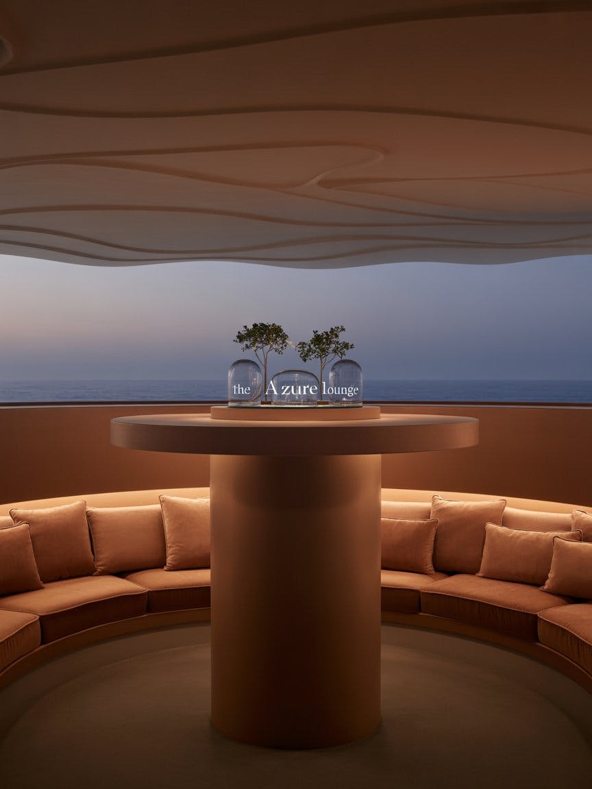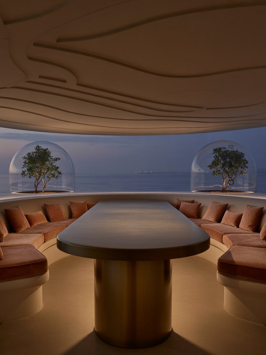 Curved bar lounge in matte bronze, circular sunken seating with velvet cushions in sand and clay tones, subtle indirect lighting along the walls. Ceiling with flowing wave-like patterns, small tree installations in glass domes, overlooking twilight ocean skyline. High-end, quiet sophistication, moody but minimal luxury ambiance.