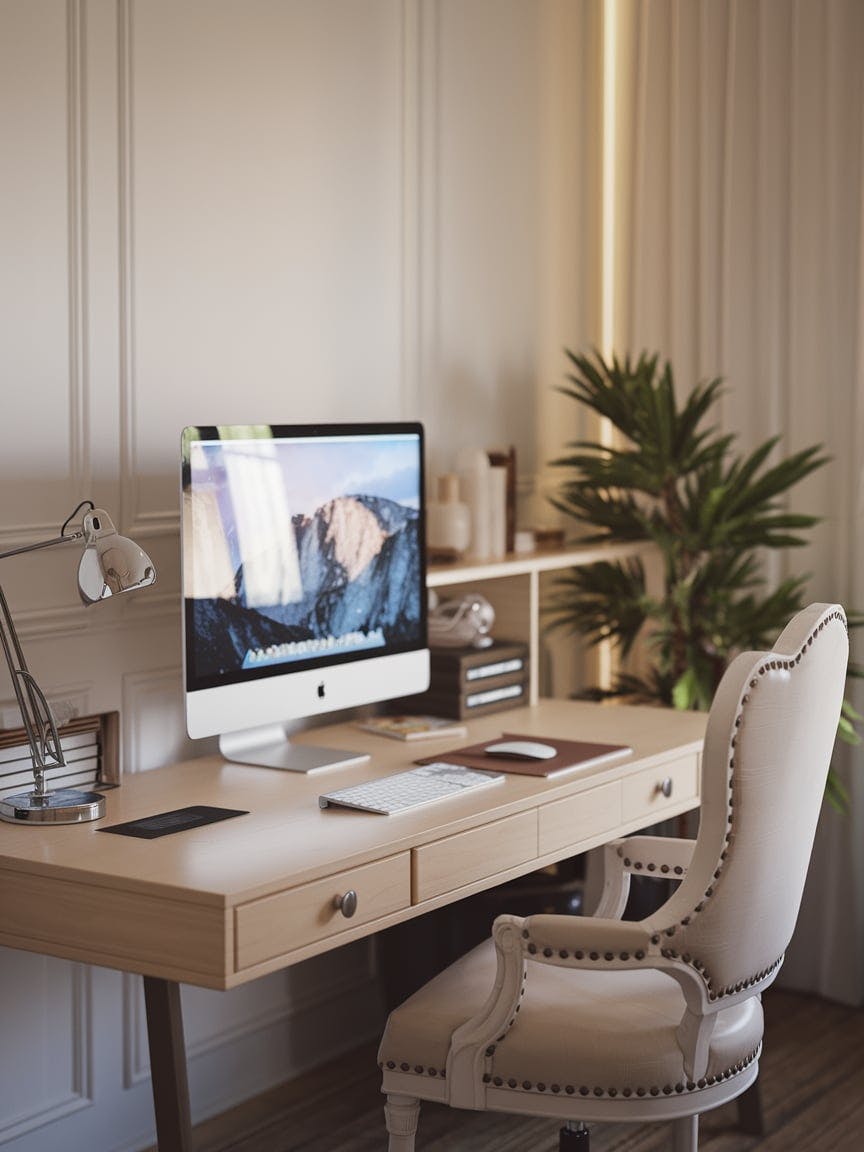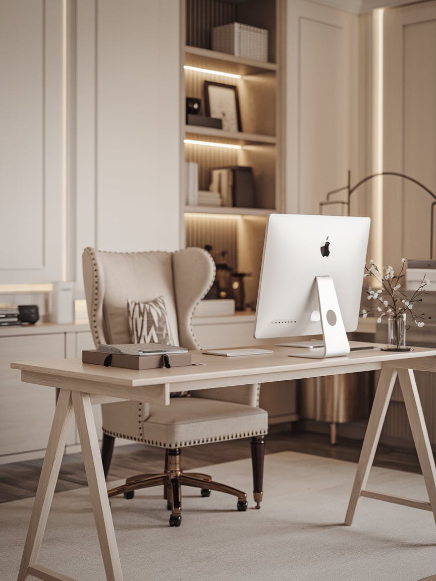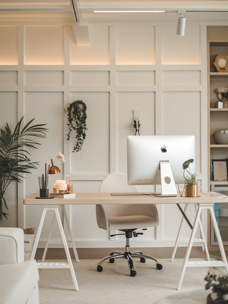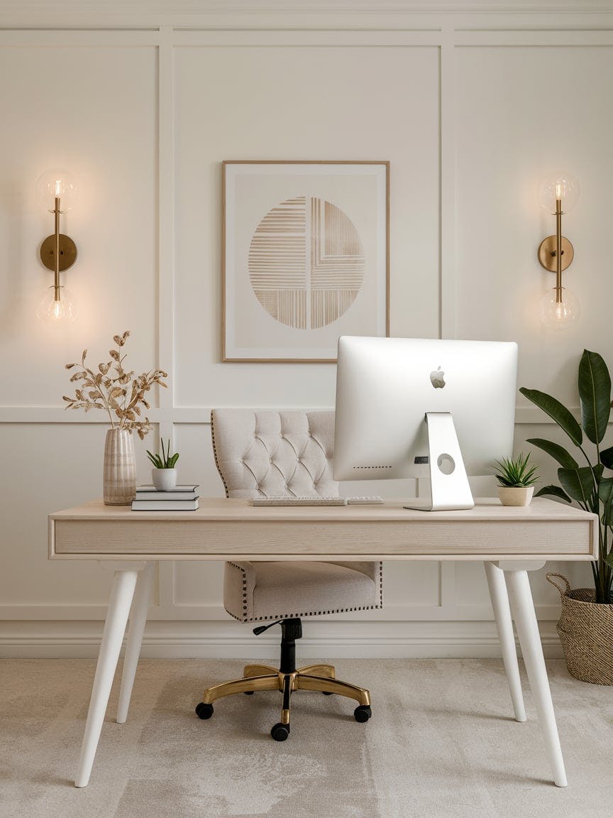 Minimalist home office setup, light wood desk with an Apple iMac, neutral color palette, soft beige and white tones, elegant studded office chair, cozy and organized workspace, modern and stylish decor, white panel walls, soft lighting, aesthetic productivity setup, high-definition details, warm and inviting ambiance, Scandinavian-inspired design, high-resolution photography.