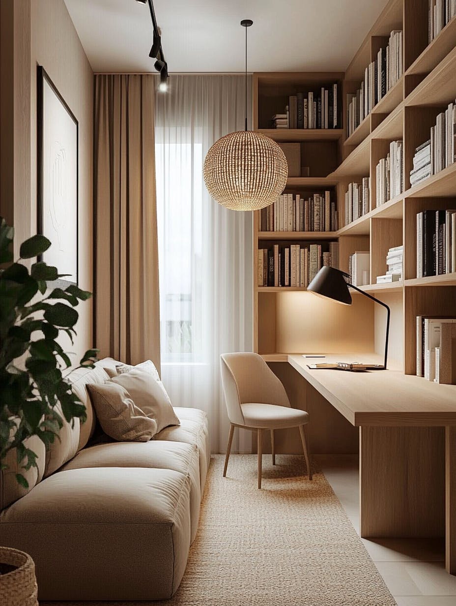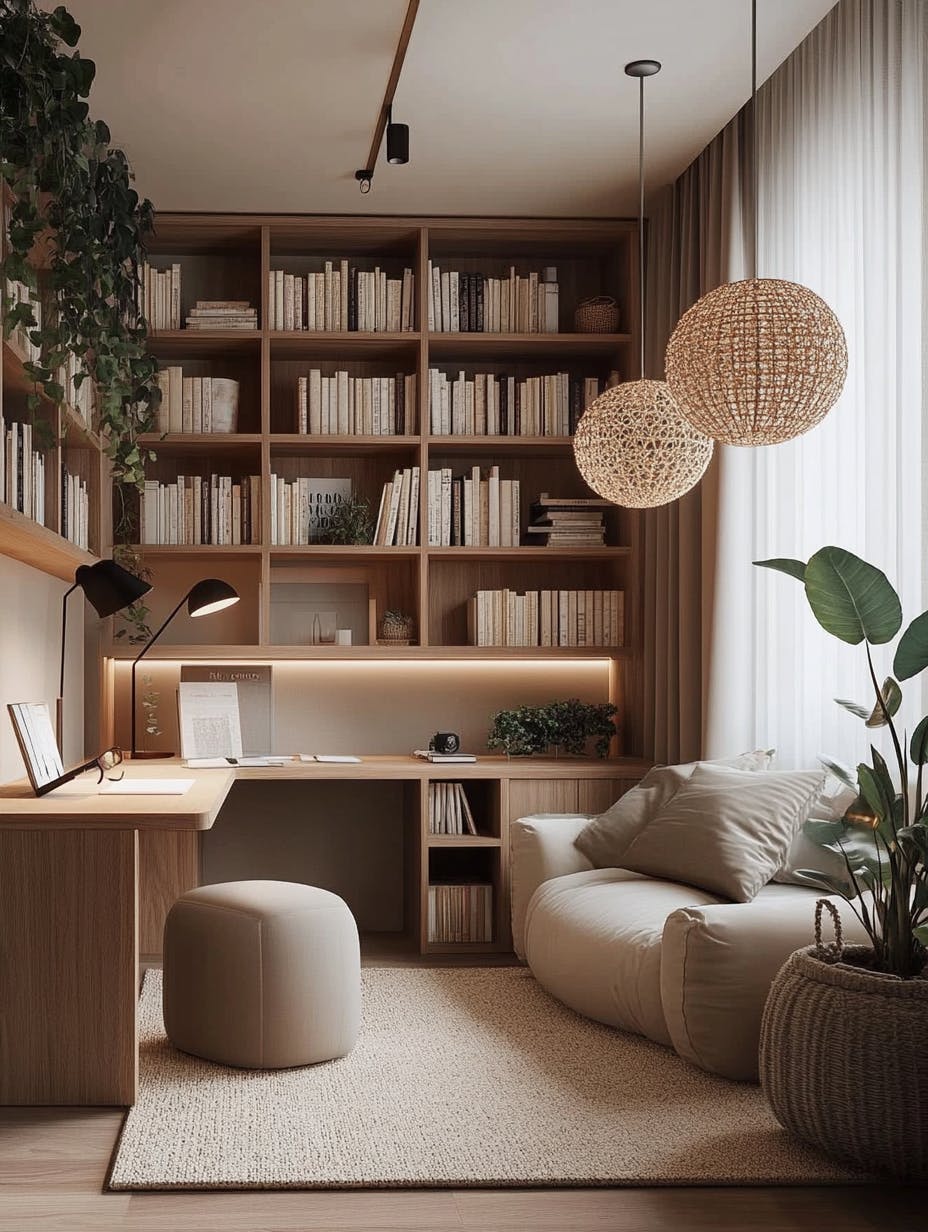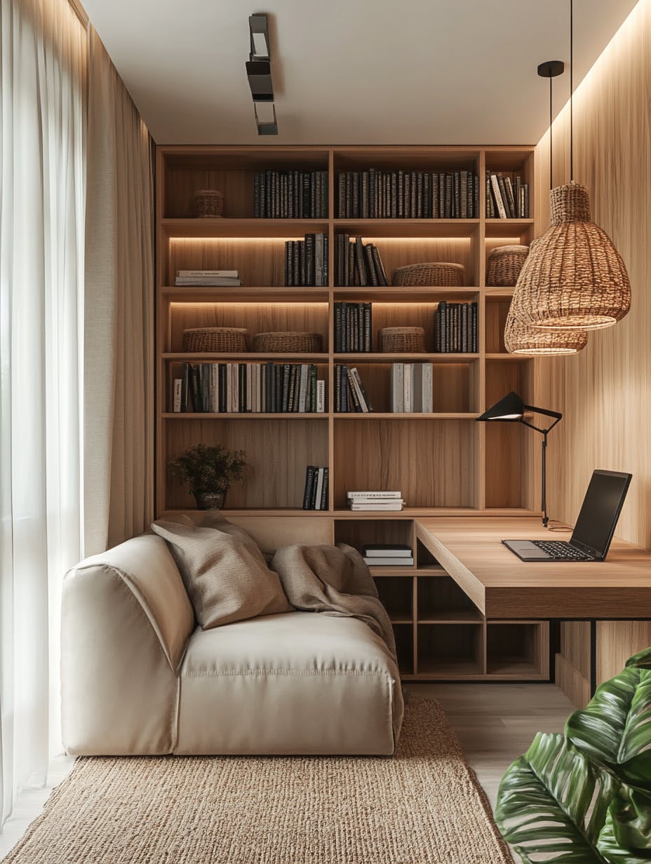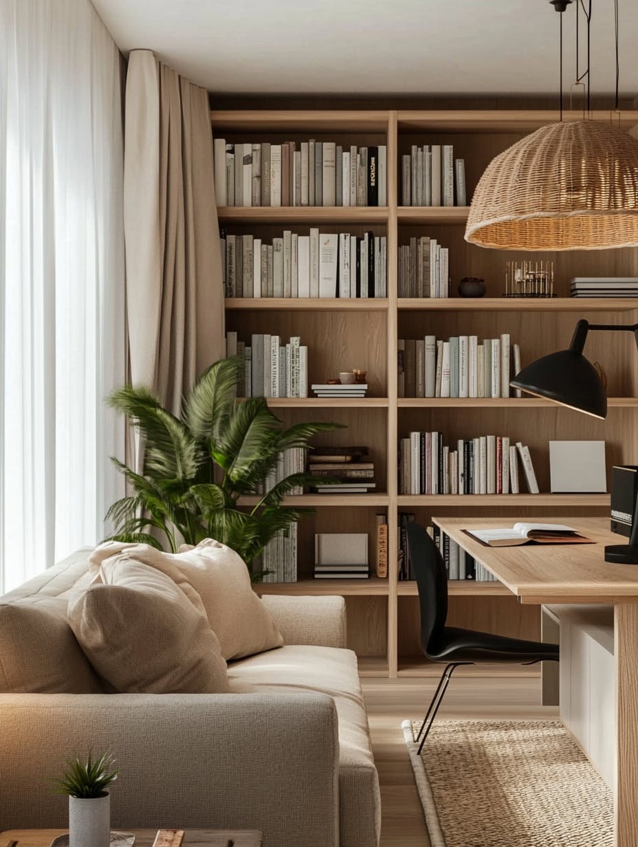 Minimalist Scandinavian home office, warm neutral tones, built-in wooden bookshelves filled with books, sleek wooden desk with modern black lamp, soft ambient lighting, cozy beige sofa with plush pillows, woven pendant lights, natural fiber rug, potted green plants adding freshness, boho-chic decor, soft curtains filtering natural light, tranquil and inviting atmosphere, ultra-HD, photorealistic, cinematic lighting --ar 3:4