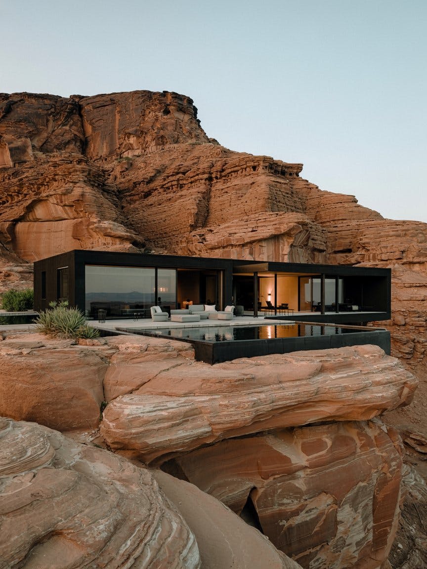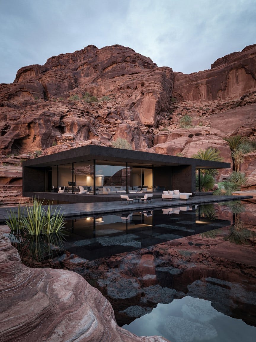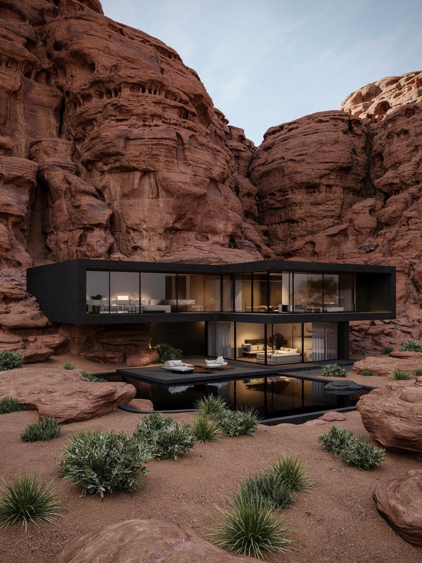 Minimalistic black villa embedded in desert cliffs, sleek modern architecture with large glass windows, sharp geometric lines, luxury minimalist design, dramatic contrast between black structure and warm red rock formations, serene reflecting pool in front of the villa, desert landscape with sparse vegetation, elegant outdoor lounge area, clean lines, architectural photography style, soft natural lighting, tranquil atmosphere, high-definition, ultra-realistic rendering, cinematic composition, futuristic yet organic design