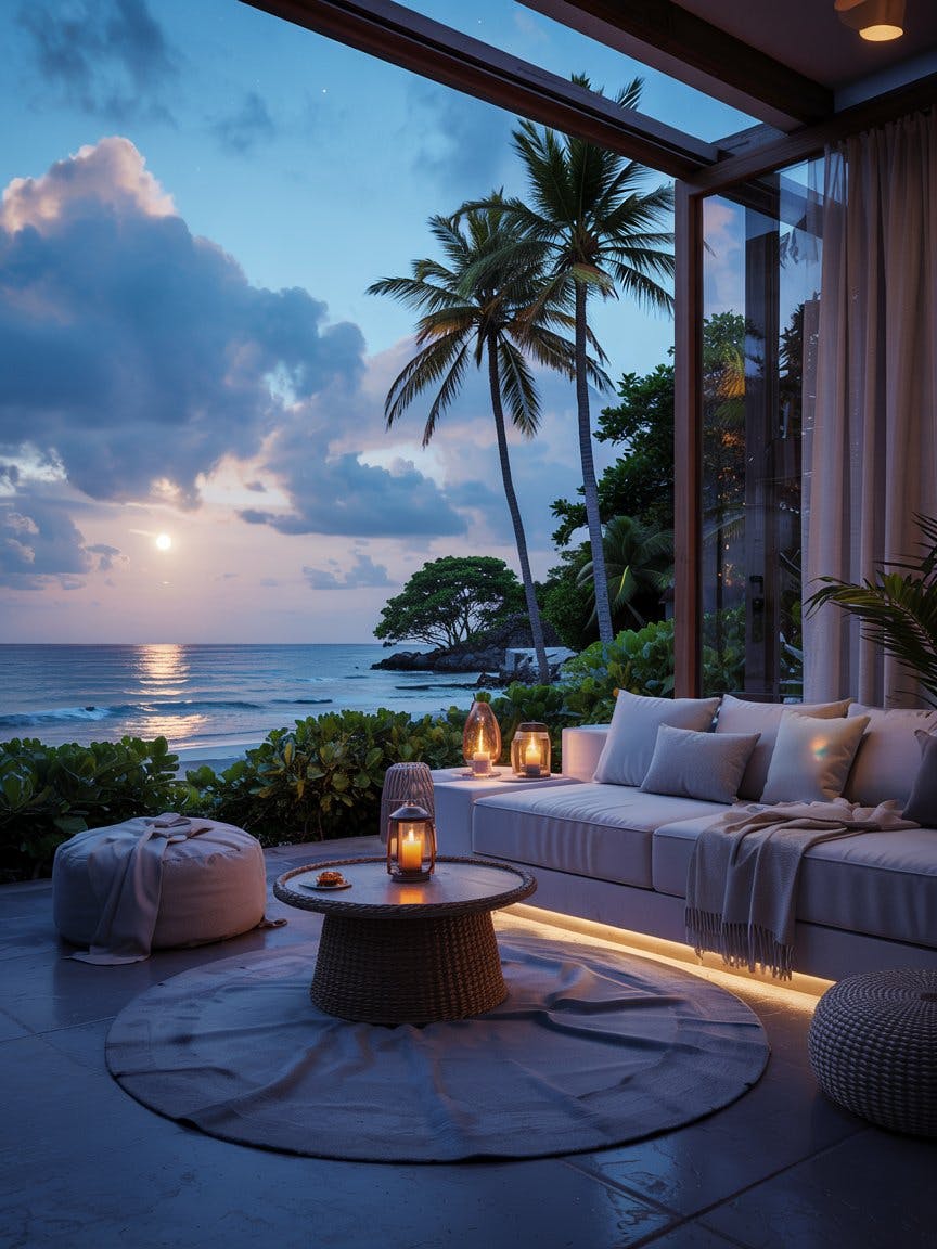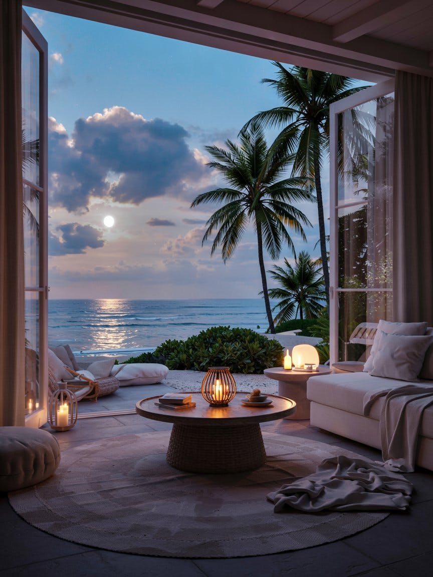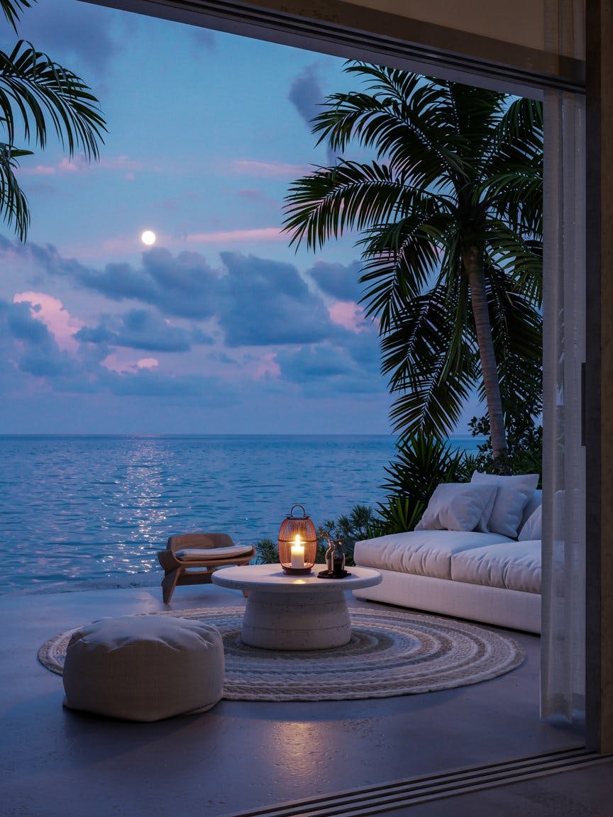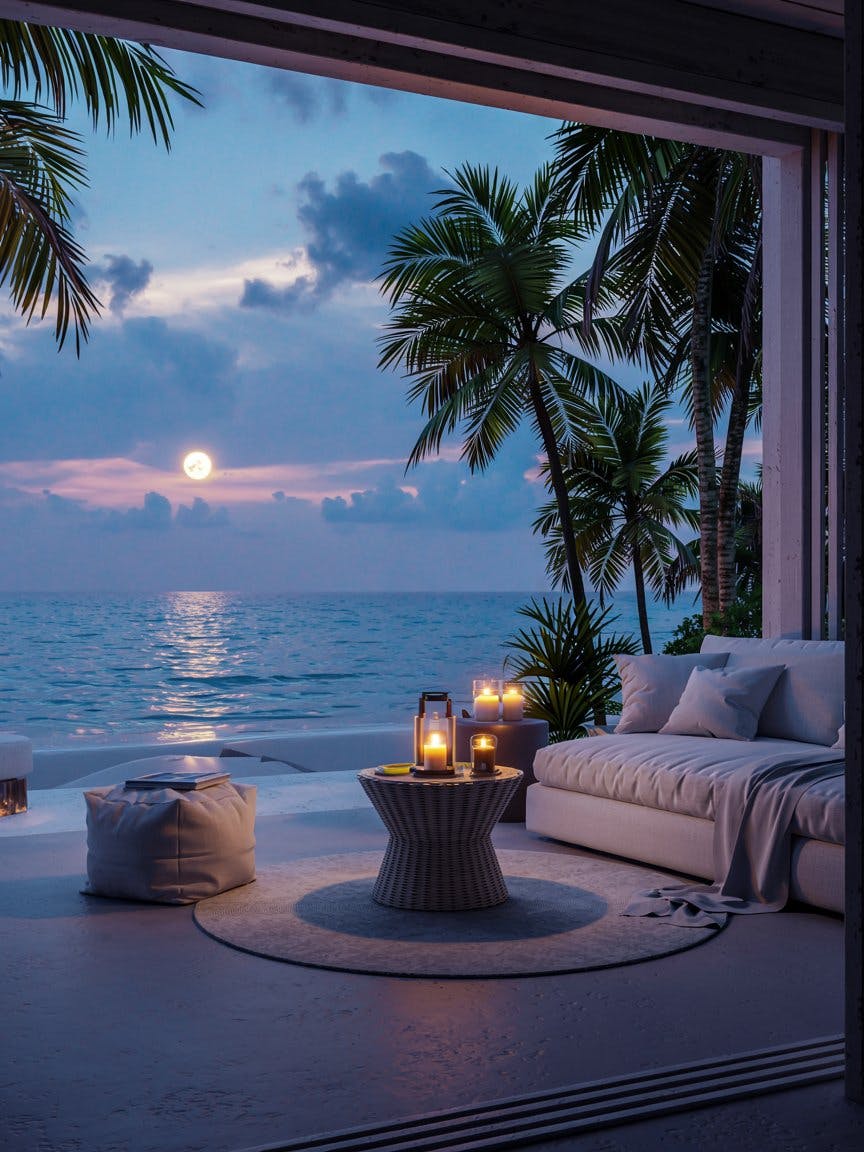Modern beachfront villa interior, cozy white sofa with soft cushions, round woven table with lit candle lantern, plush cream rug and fabric pouf, open glass walls revealing moonlit ocean view, full moon low in the sky, dramatic clouds, tall palm trees swaying gently, ambient candlelight glow, serene and romantic nighttime atmosphere, luxury tropical retreat, soft lighting, high-definition textures, photorealistic rendering, tranquil coastal vibes