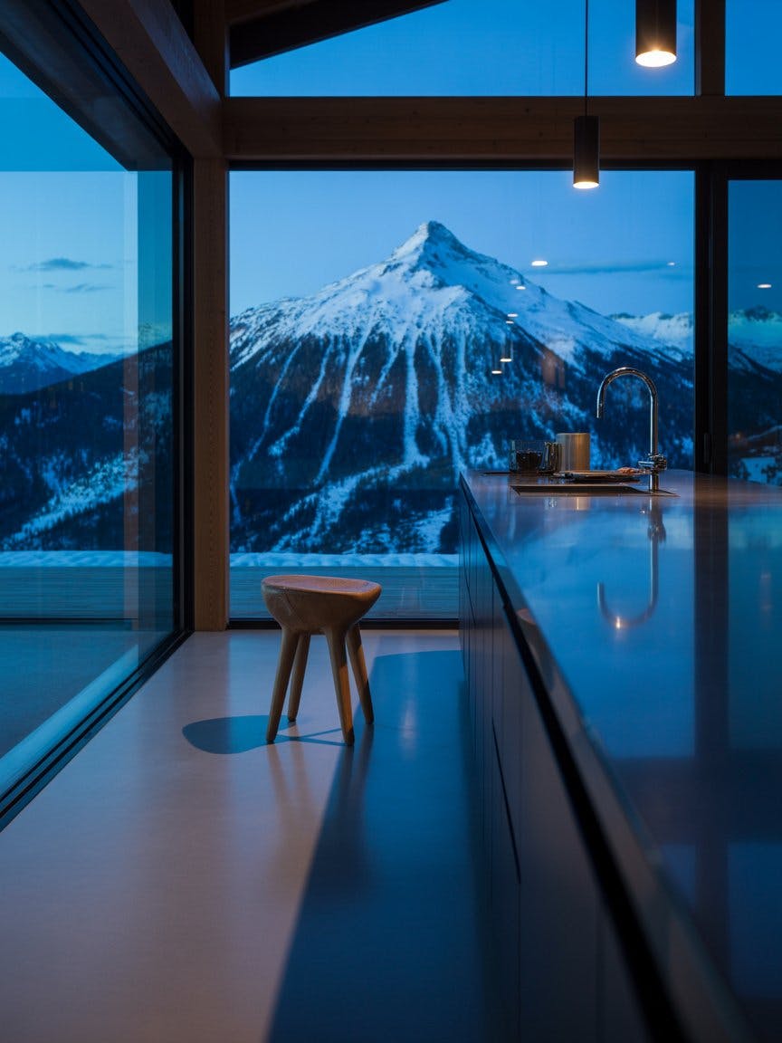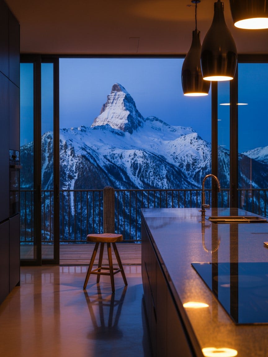 Modern luxury kitchen interior, floor-to-ceiling glass windows, dramatic view of snow-covered mountain peak, twilight blue ambiance, warm pendant lighting, sleek dark countertops, wooden stools, contemporary alpine chalet style, cozy and elegant, minimalist high-end design, moody reflections on polished floor, mountain lodge atmosphere, tranquil winter evening, scenic panoramic window view, architectural symmetry, refined rustic elements, serene mountain retreat