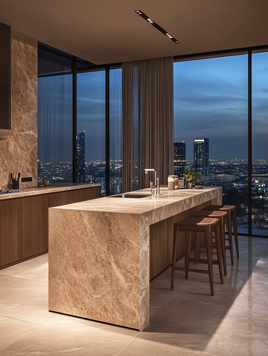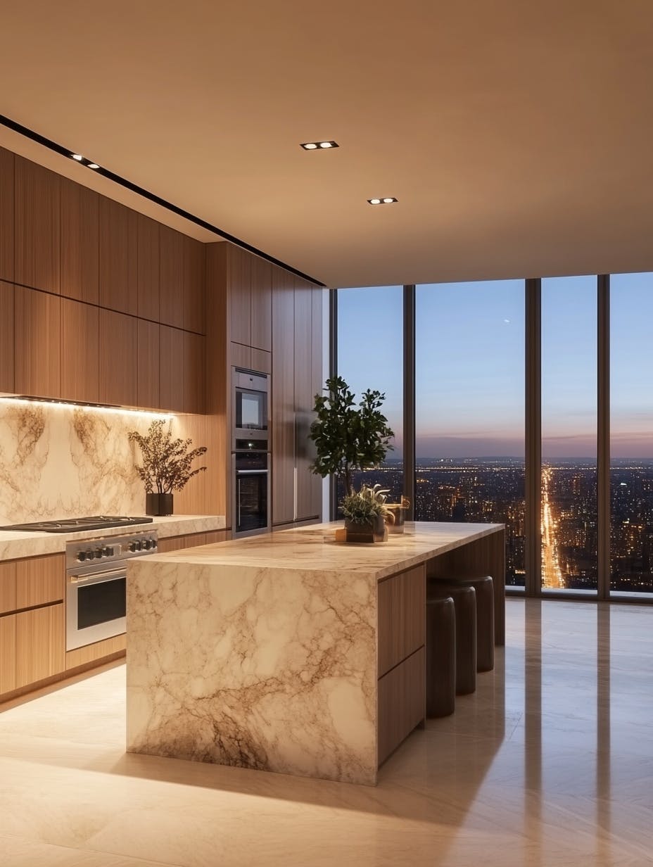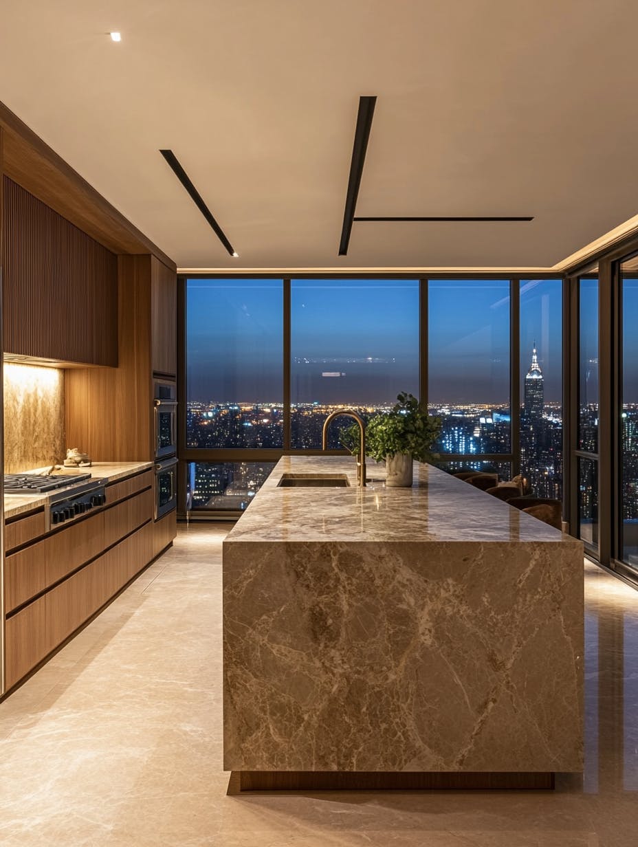 Modern minimalist kitchen interior, soft beige marble island with clean lines, warm wooden cabinetry, brushed stainless steel appliances, floor-to-ceiling panoramic windows showcasing a stunning night cityscape view, twinkling city lights in the distance, gentle reflections on polished stone floors, cozy pendant lighting, natural textures and neutral tones, open and airy atmosphere, calm and refined design, subtle luxury, seamless indoor-outdoor connection, soft ambient lighting, serene and cinematic setting