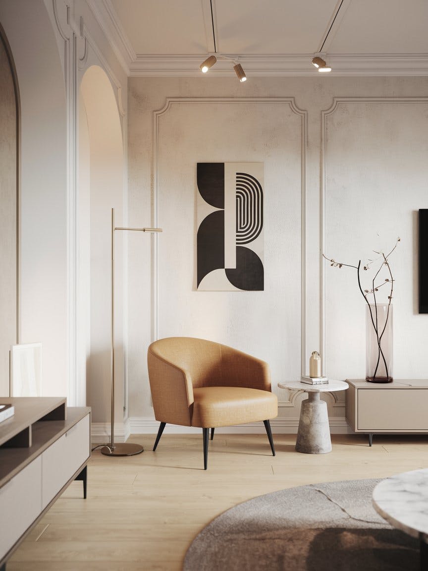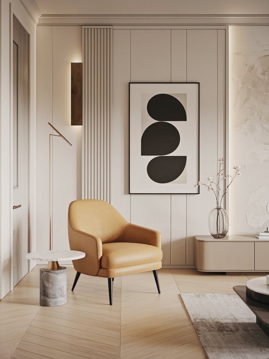 Modern minimalist living room, mustard beige armchair with sleek black legs, abstract geometric wall art in black and white, tall brass floor lamp with clean lines, light wood flooring, white walls with subtle texture, small round marble side table with concrete base, tall glass vase with minimalist flowering branches, neutral-toned media console, soft natural lighting, Scandinavian design elements, cozy and elegant atmosphere, high-definition interior render, harmonious color palette
