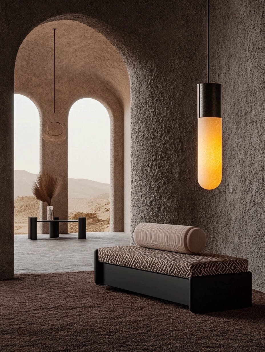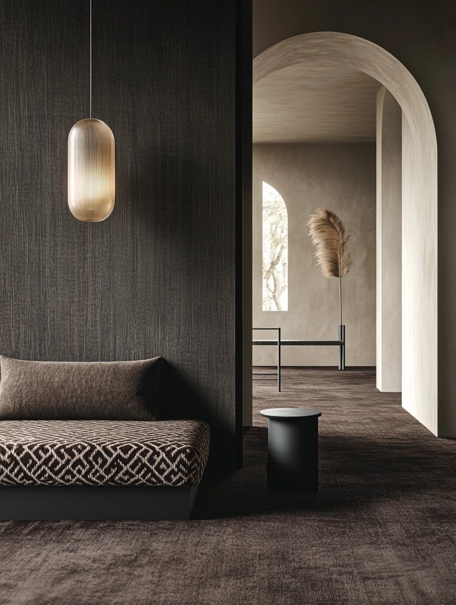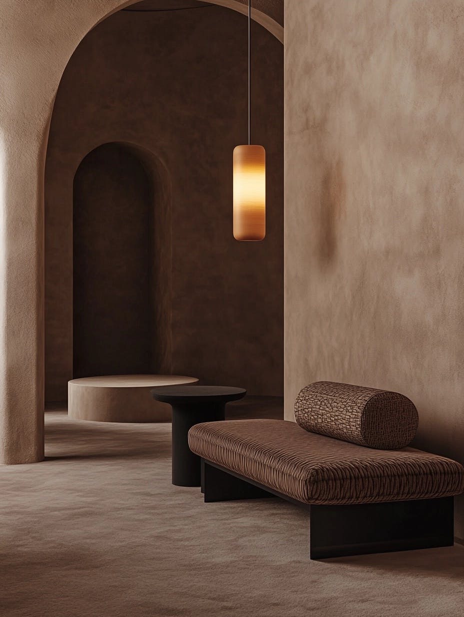 Modern aesthetic minimalist lounge interior, dark earthy tones, brown textured carpet, geometric patterned bench with a cylindrical pillow, sleek black side table, low-hanging pendant light with soft yellow glow, textured gray walls with archways, matte surfaces, muted lighting, subtle industrial vibe, warm and cozy atmosphere, luxurious and sophisticated ambiance, rich materials like stone and fabric, clean lines and smooth finishes, a blend of contemporary and classic design elements --chaos 10 --ar 3:4 --v 6.1
