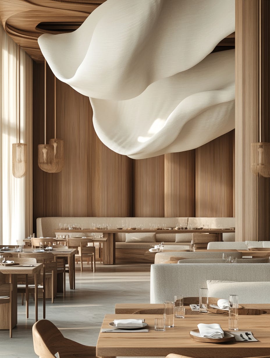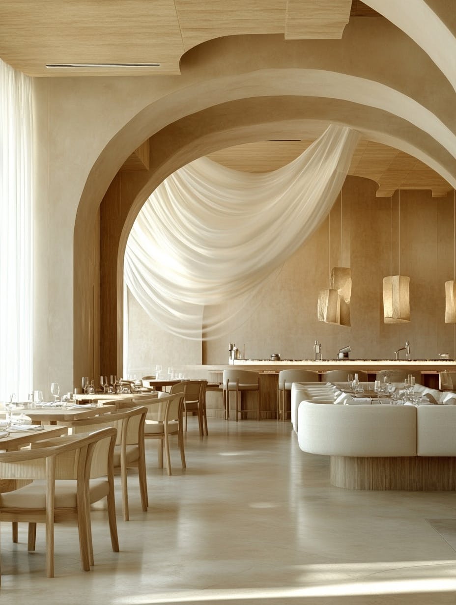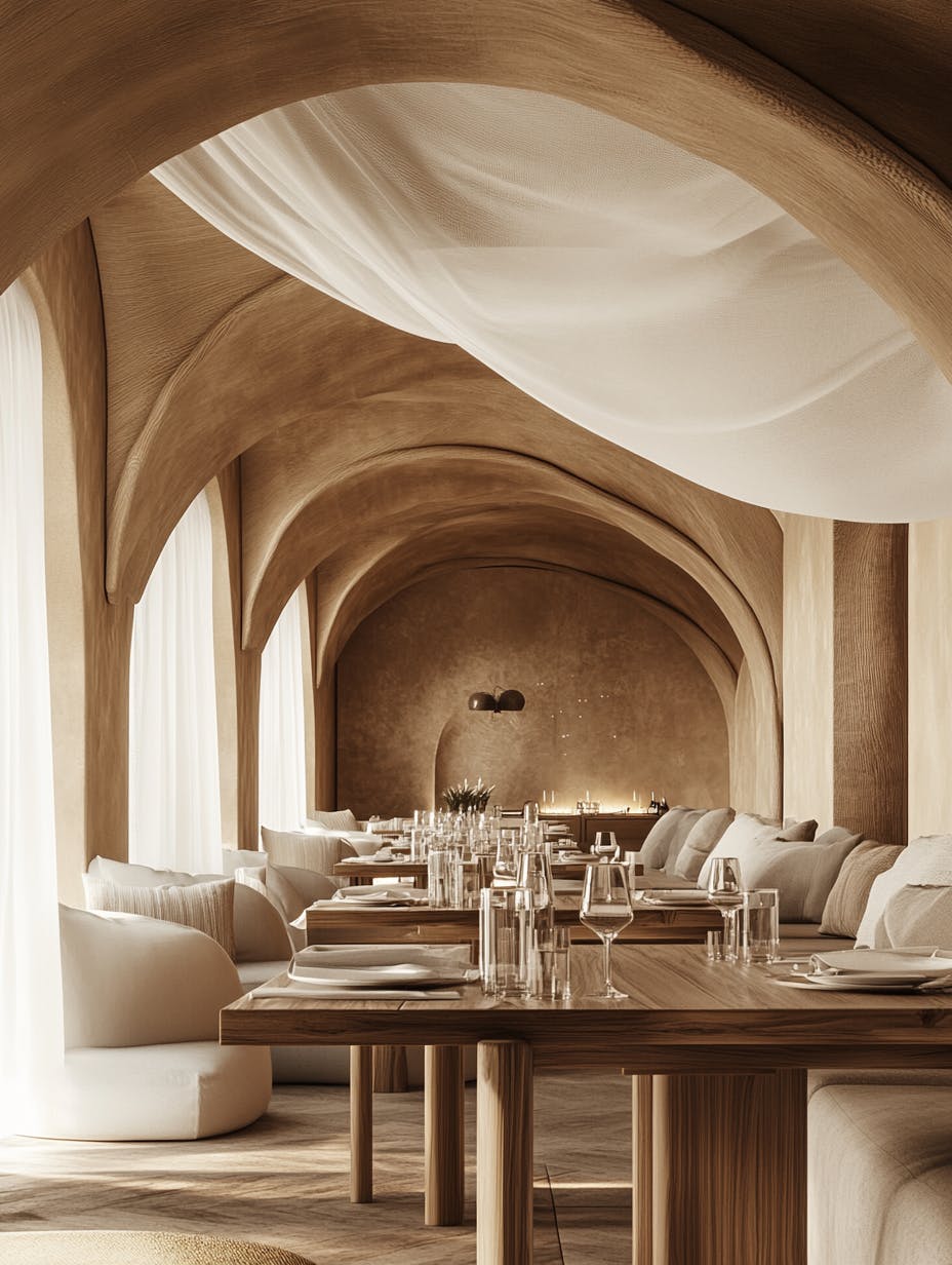 Modern minimalist restaurant interior, earthy beige tones, curved wooden arches, high ceilings, flowing white fabric art installation, warm natural lighting, smooth textured walls, elegant wooden furniture with clean lines, large communal dining table set with glassware, neutral-toned sofas with soft upholstery, serene and luxurious atmosphere, organic design, high-end dining experience, artistic architectural details, Scandinavian-inspired style, calm and inviting ambiance, high-definition, photorealistic render, soft shadows, 8k resolution --chaos 10 --ar 3:4 --v 6.1