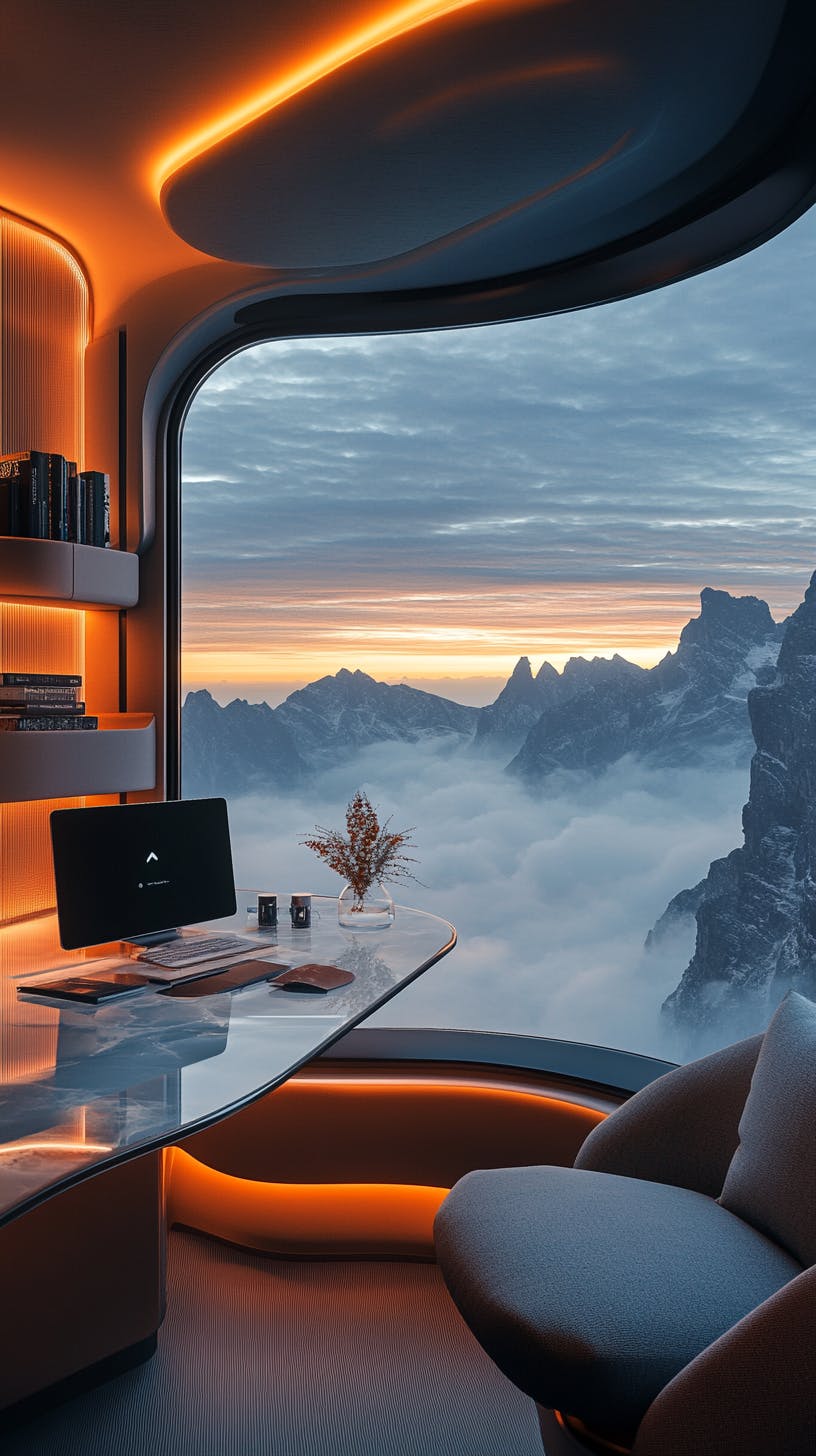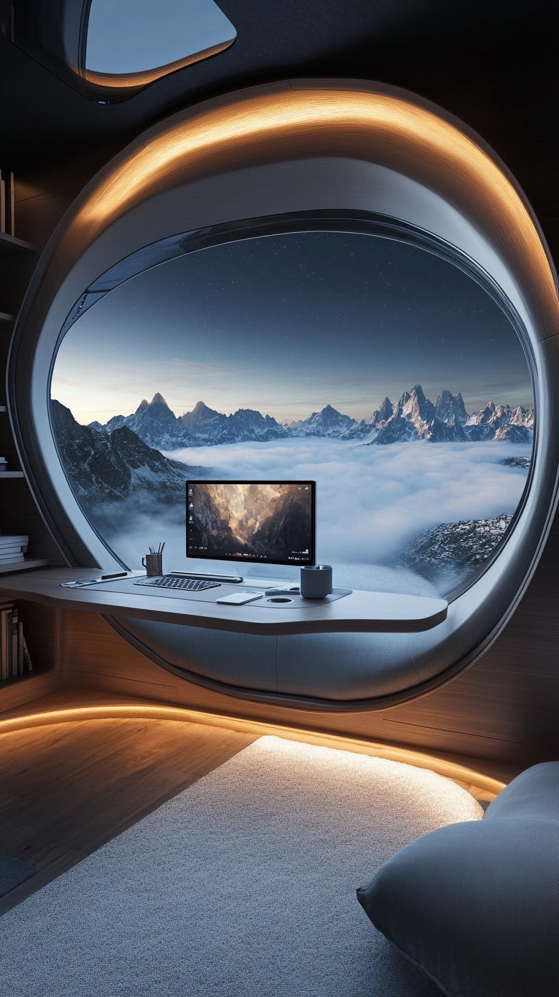 Modern workspace inside a luxury capsule loft above the clouds, floating desk with transparent surface and hidden OLED screen, ergonomic seating with memory foam, acoustic panels for silence, wraparound views of foggy mountain peaks, curved bookshelves with ambient lighting, zen-inspired interior with minimalist decor, integrated coffee station and mood lighting, perfect for meditation or creative work, futuristic tech meets calming natural views, ultra-detailed and serene environment --ar 9:16 --raw