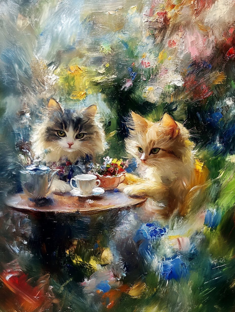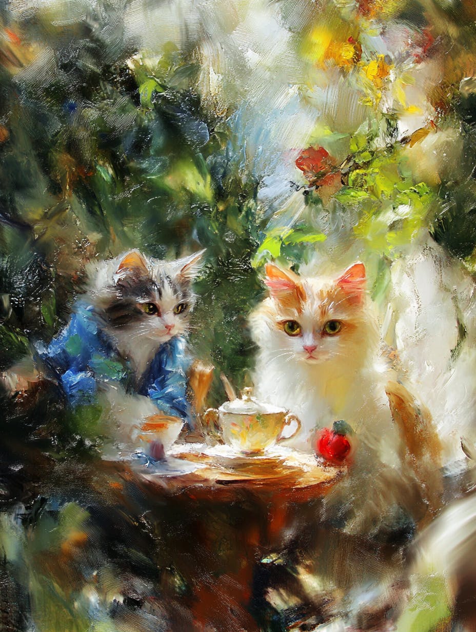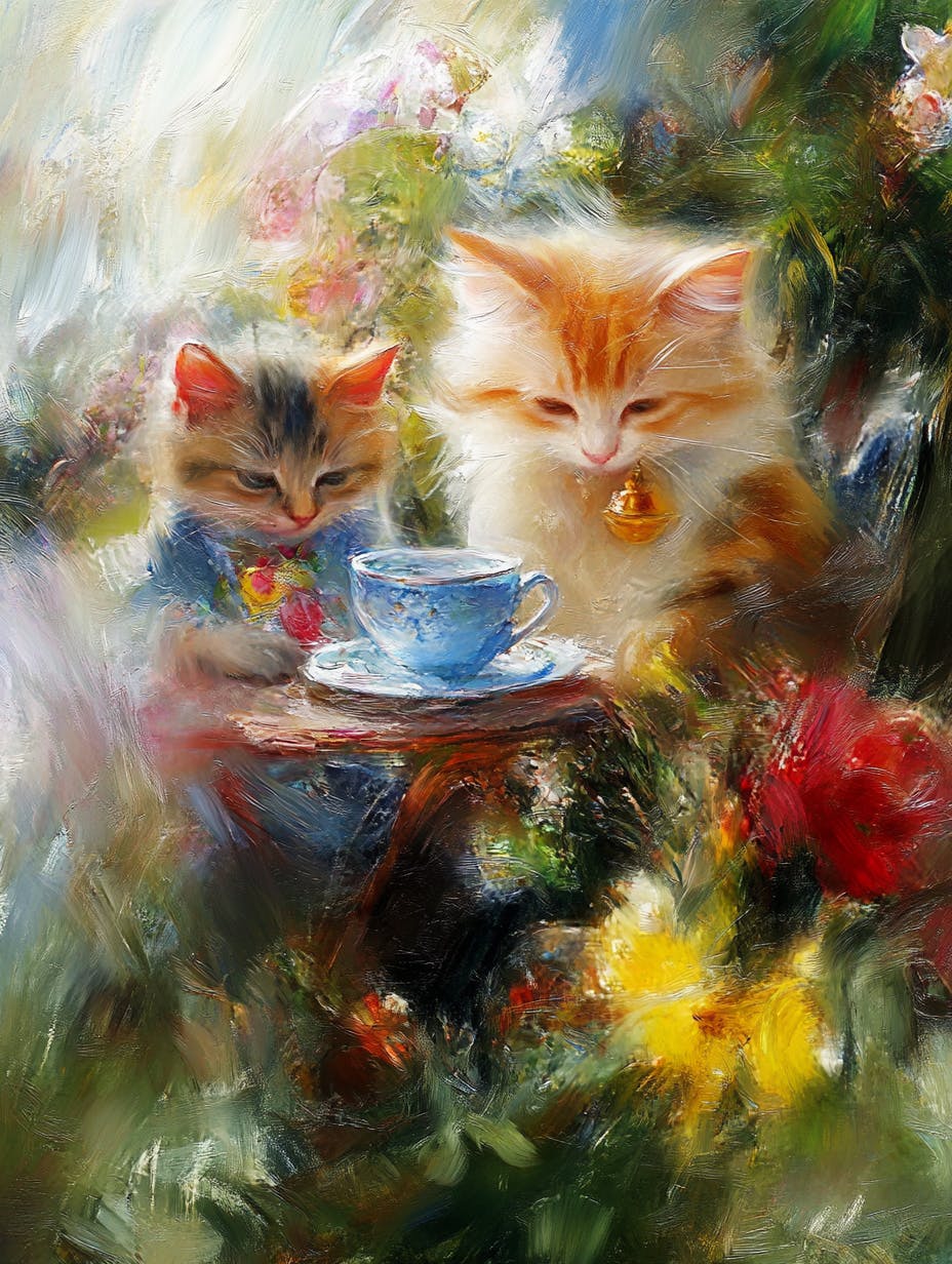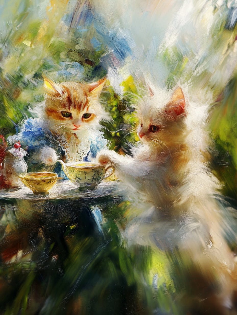 illustration, 2 cats having a tea party, wearing tiny outfits, seated at a tiny table, surrounded by an enchanted garden, whimsical details, magical realism, soft pastels, ultra-detailed fur and accessories, warm and inviting atmosphere --ar 3:4 --sref 2390036421