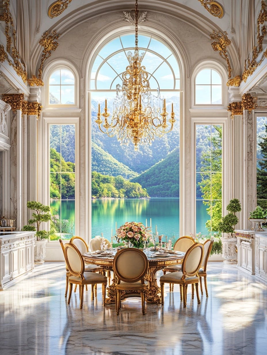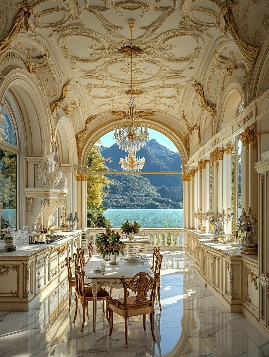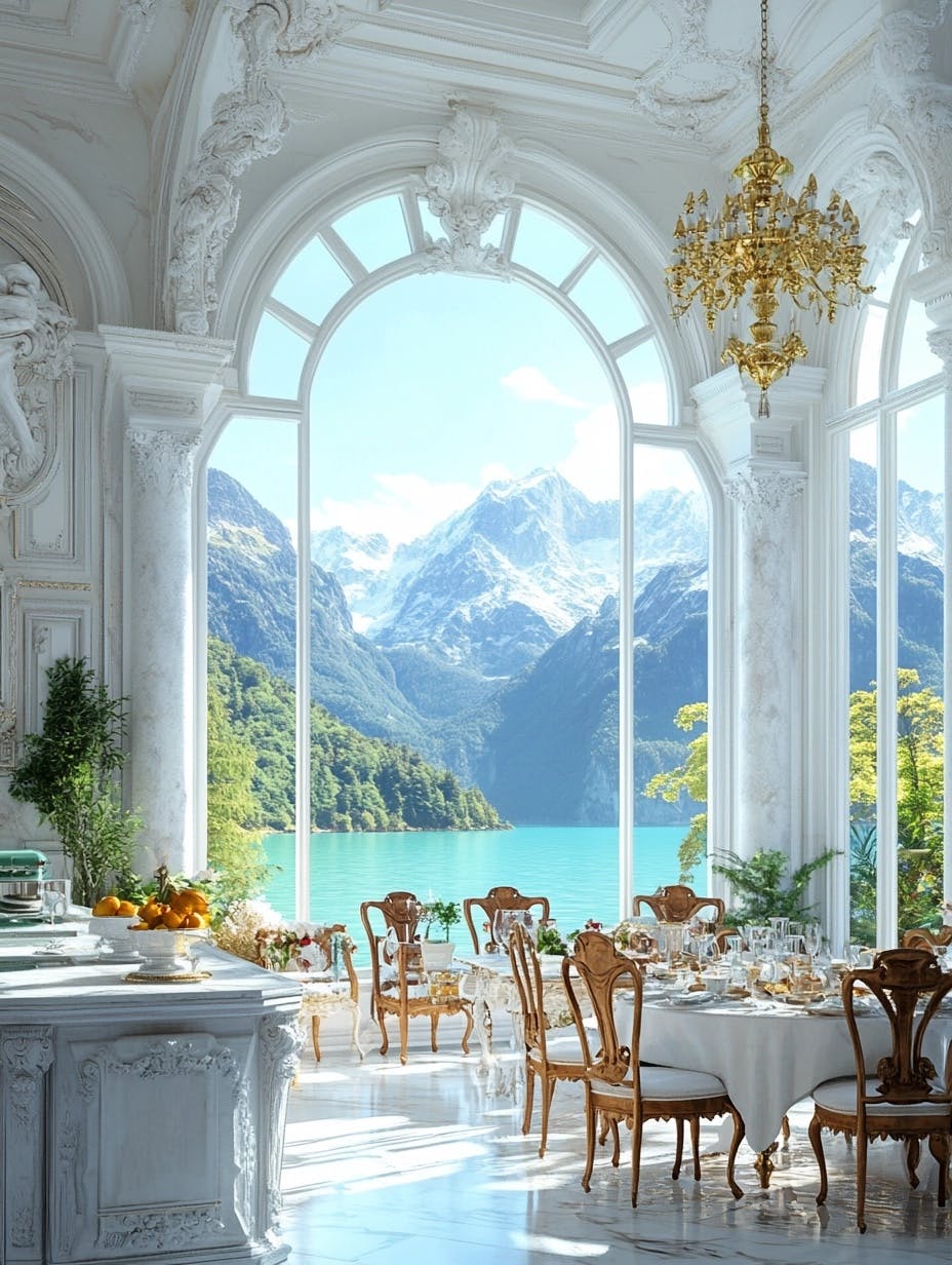 Ultrarealistic, photorealistic, ultra high resolution Luxurious, old-money style mansion kitchen with grand arched windows, modern, overlooking a serene turquoise lake and majestic mountain range, intricate classical architecture with marble columns, gold chandeliers hanging from a high vaulted ceiling, elegant cream and white tones, antique wooden chairs with ornate carvings around a dining table, natural sunlight pouring in, lush greenery outside, a peaceful and opulent atmosphere, a mix of Renaissance and neoclassical design elements, polished marble floors reflecting light, detailed moldings and trim, high-end European aesthetics, spacious, bright, and airy, surrounded by nature --chaos 10 --ar 3:4 --v 6.1