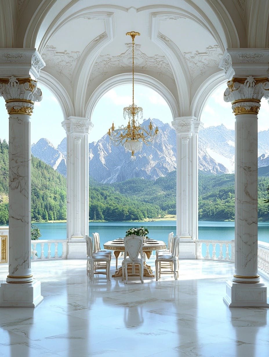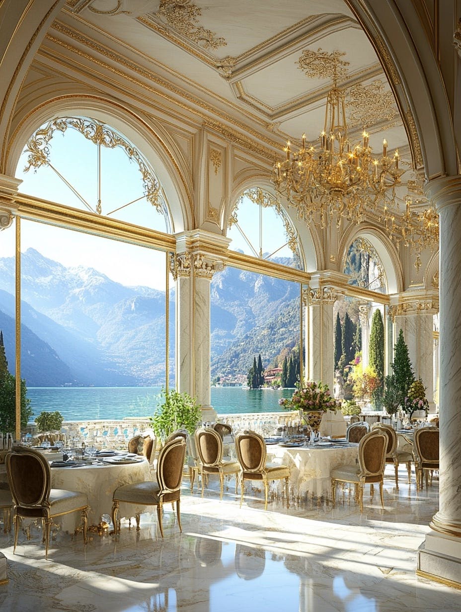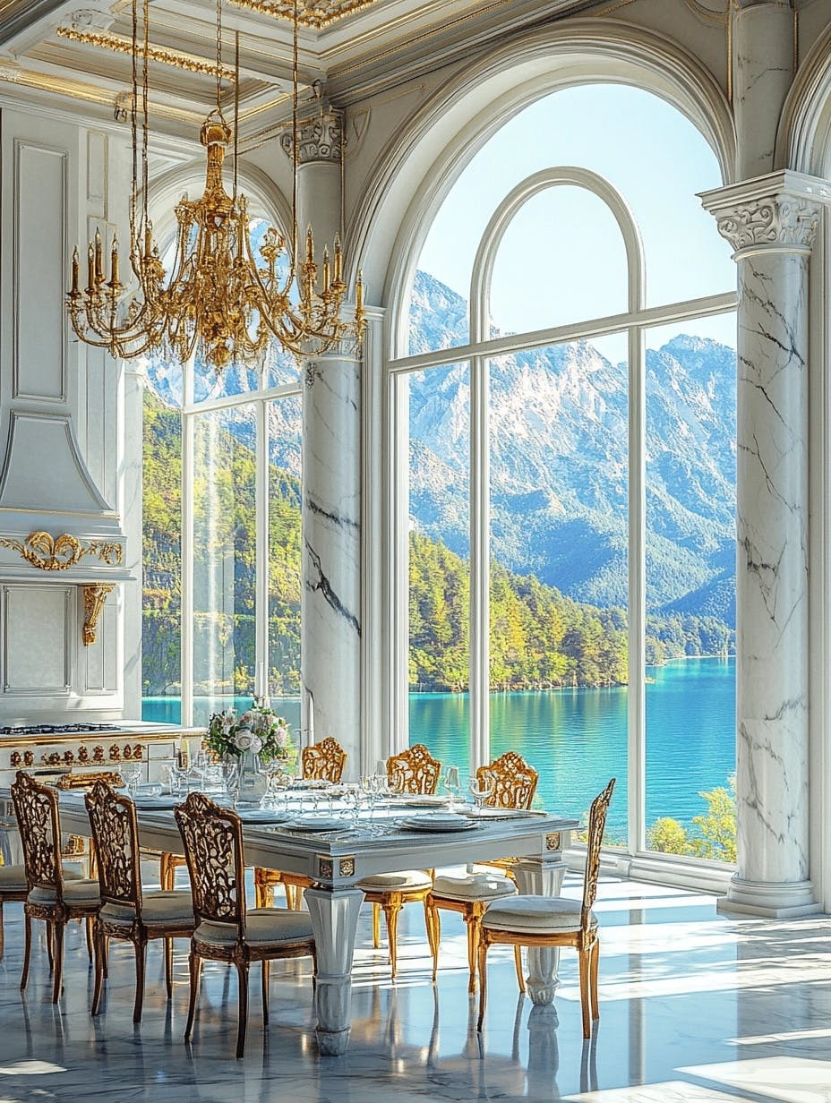 Ultrarealistic, photorealistic, ultra high resolution Luxurious, old-money style mansion kitchen with grand arched windows, modern, overlooking a serene turquoise lake and majestic mountain range, intricate classical architecture with marble columns, gold chandeliers hanging from a high vaulted ceiling, elegant cream and white tones, antique wooden chairs with ornate carvings around a dining table, natural sunlight pouring in, lush greenery outside, a peaceful and opulent atmosphere, a mix of Renaissance and neoclassical design elements, polished marble floors reflecting light, detailed moldings and trim, high-end European aesthetics, spacious, bright, and airy, surrounded by nature --chaos 10 --ar 3:4 --v 6.1