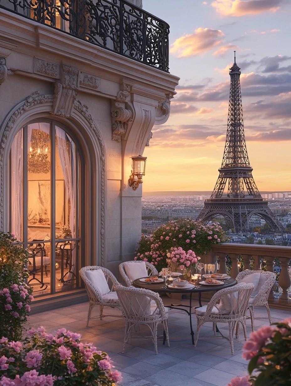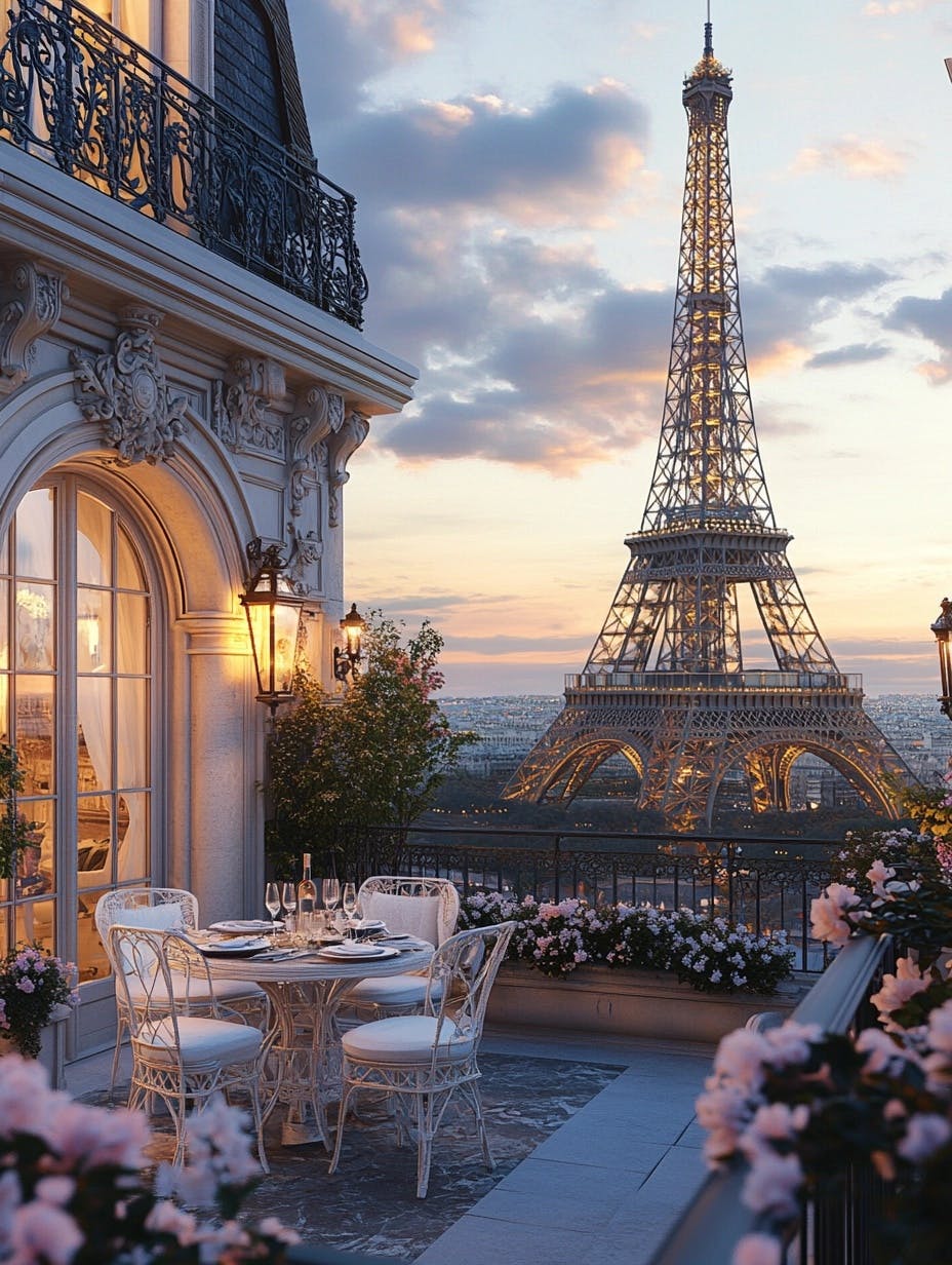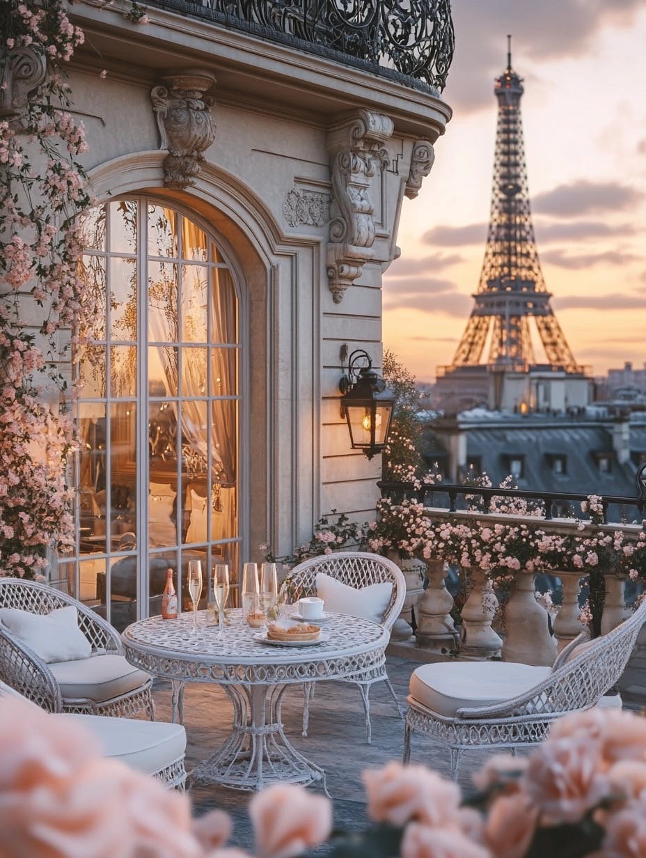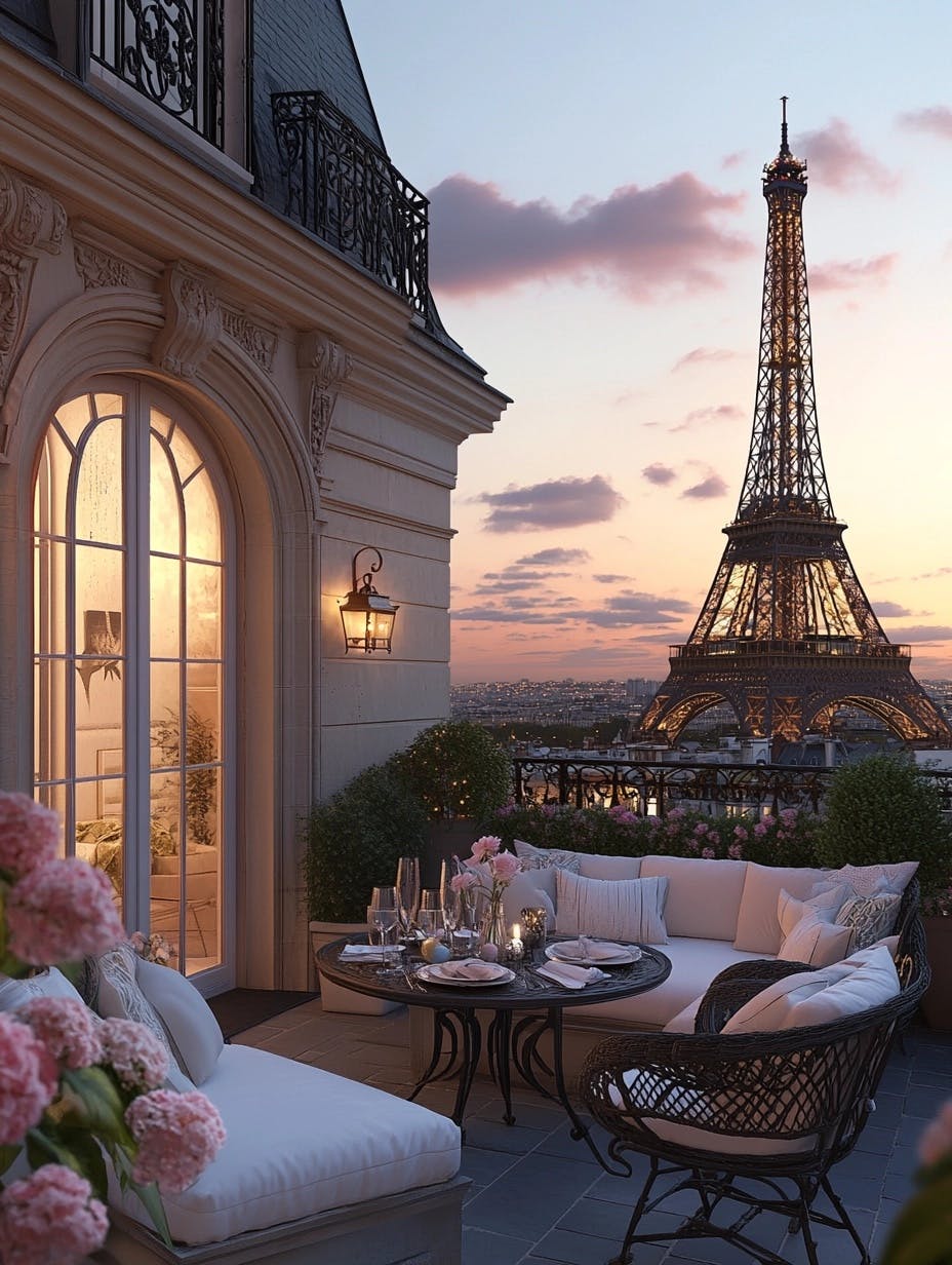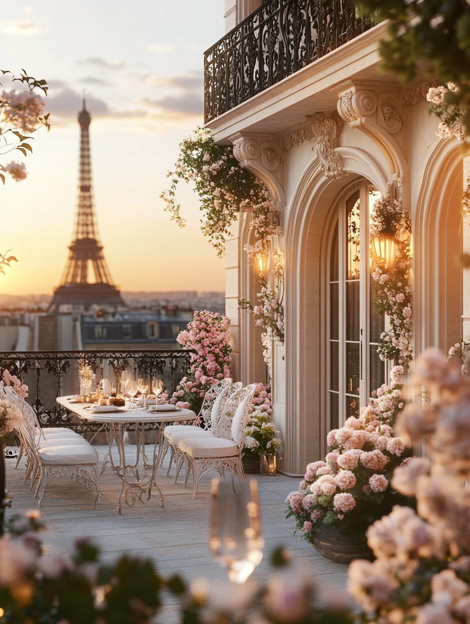 photorealistic, aesthetic, taken with Canon EOS, Elegant Parisian rooftop terrace, sunset view of the Eiffel Tower in the background, classic Haussmann architecture with ornate stone details, arched windows with wrought-iron balconies, cozy outdoor seating area with white cushioned chairs and a dining table, delicate pink and white flowers adorning the terrace, soft warm lighting from vintage-style lanterns, luxurious yet inviting ambiance, pale beige and cream tones, slate rooftop, a serene autumn evening, golden hues in the sky, champagne glasses and a meal set on the table, capturing the essence of modern Parisian elegance and comfort. --chaos 10 --ar 3:4 --v 6.1