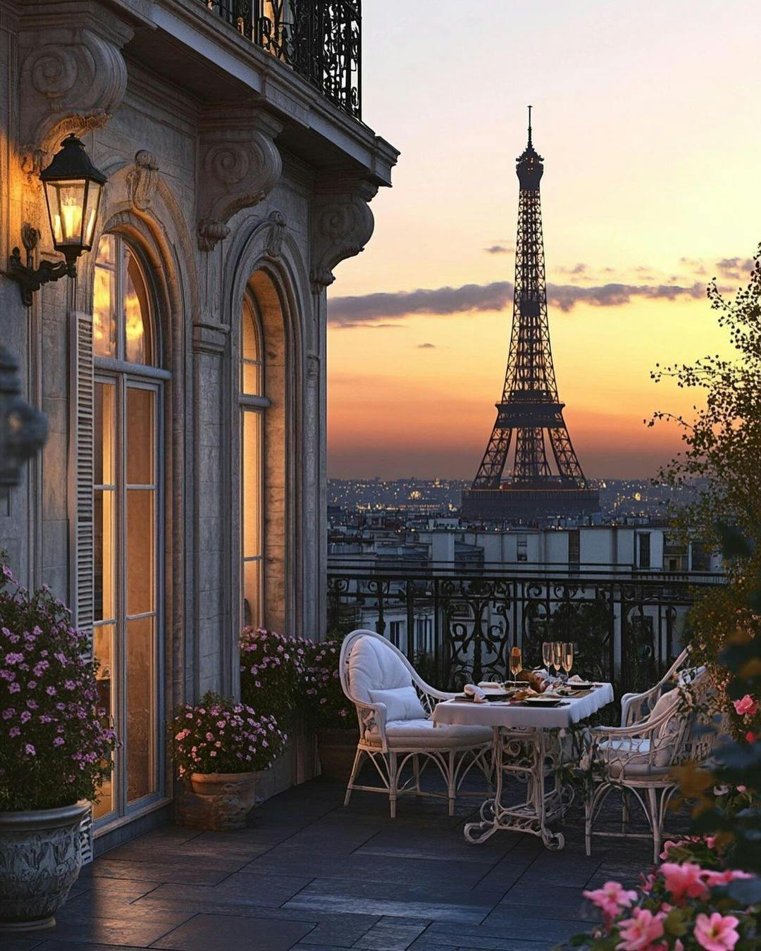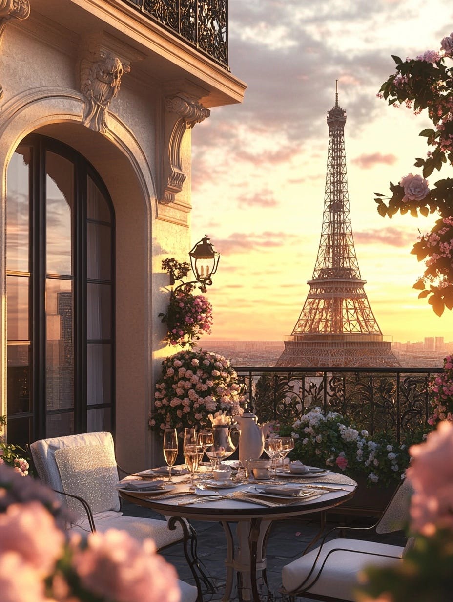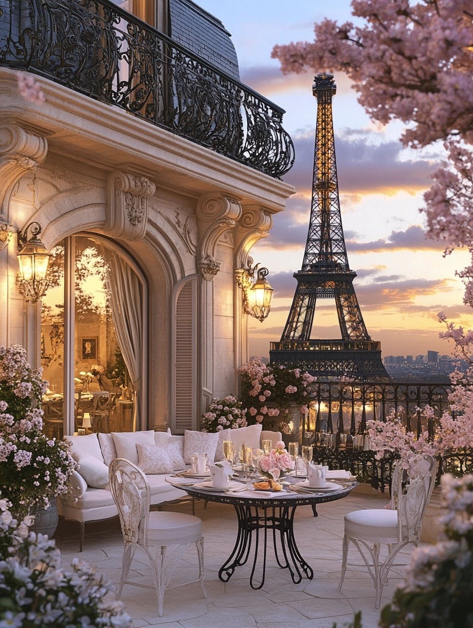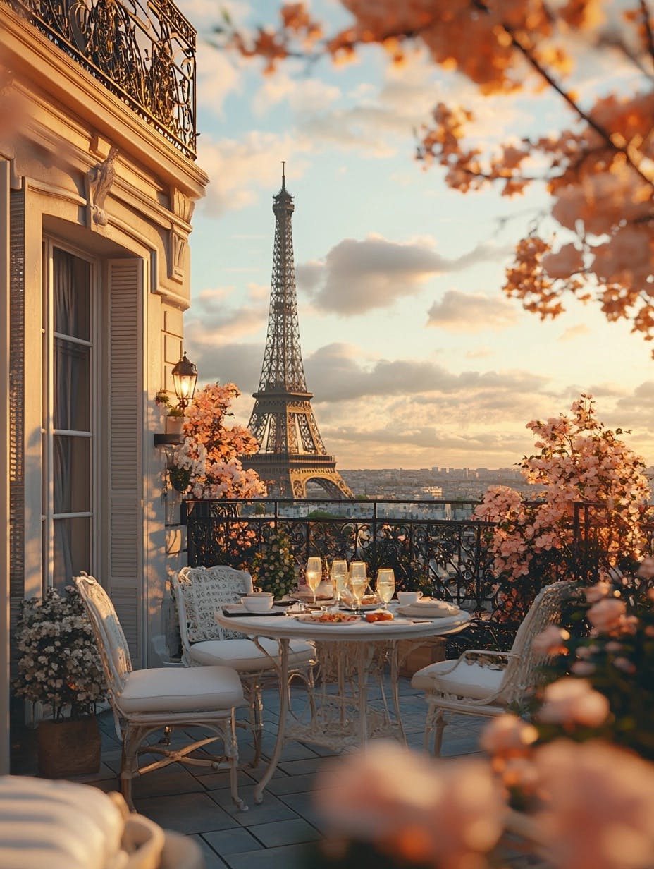 photorealistic, aesthetic, taken with Canon EOS, Elegant Parisian rooftop terrace, sunset view of the Eiffel Tower in the background, classic Haussmann architecture with ornate stone details, arched windows with wrought-iron balconies, cozy outdoor seating area with white cushioned chairs and a dining table, delicate pink and white flowers adorning the terrace, soft warm lighting from vintage-style lanterns, luxurious yet inviting ambiance, pale beige and cream tones, slate rooftop, a serene autumn evening, golden hues in the sky, champagne glasses and a meal set on the table, capturing the essence of modern Parisian elegance and comfort. --chaos 10 --ar 3:4 --v 6.1