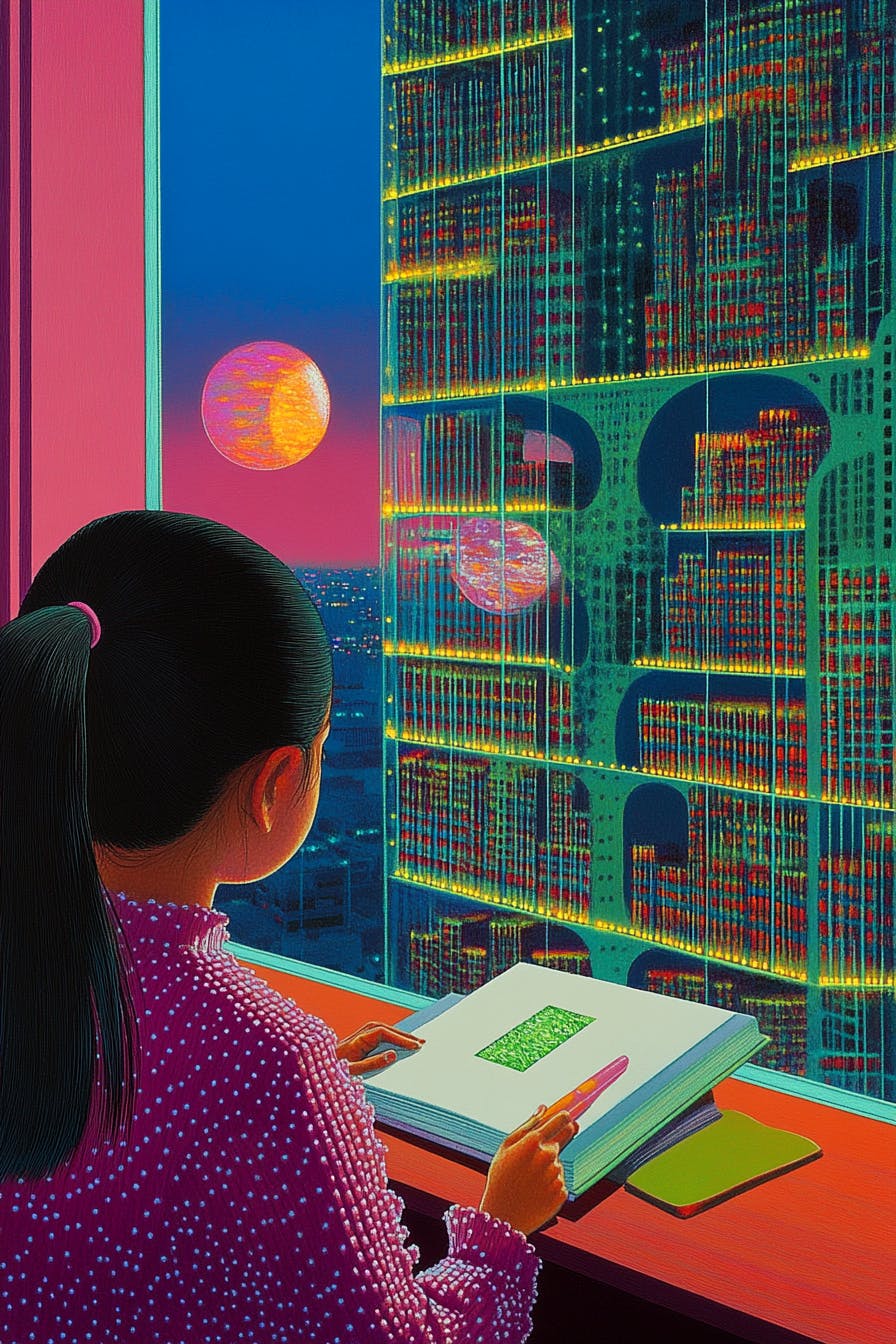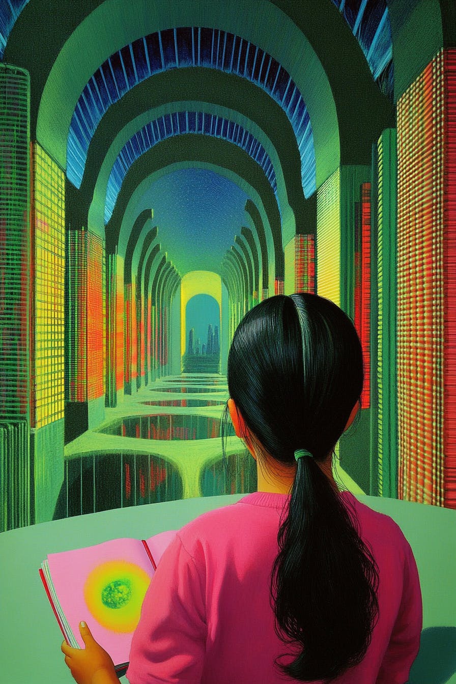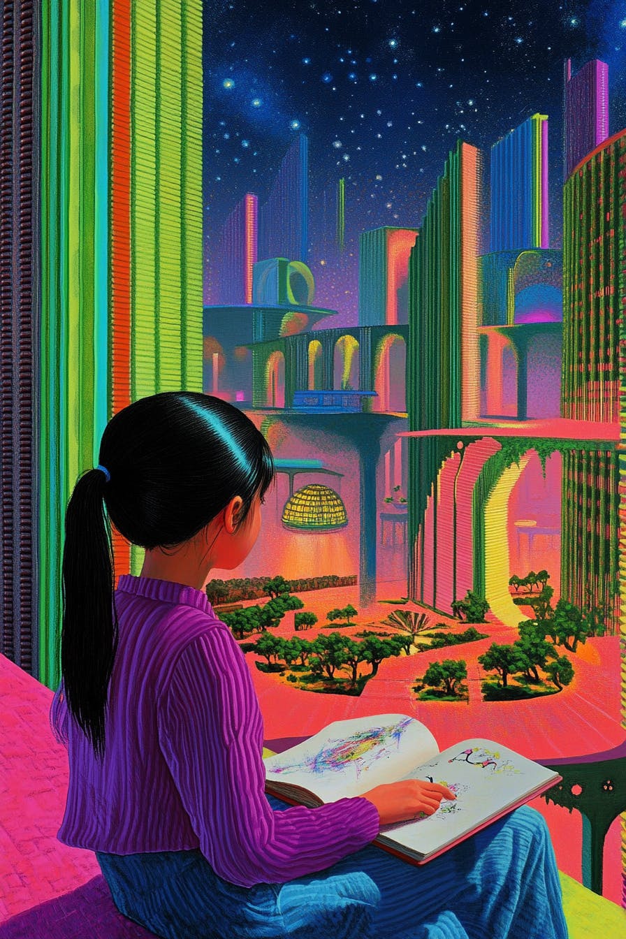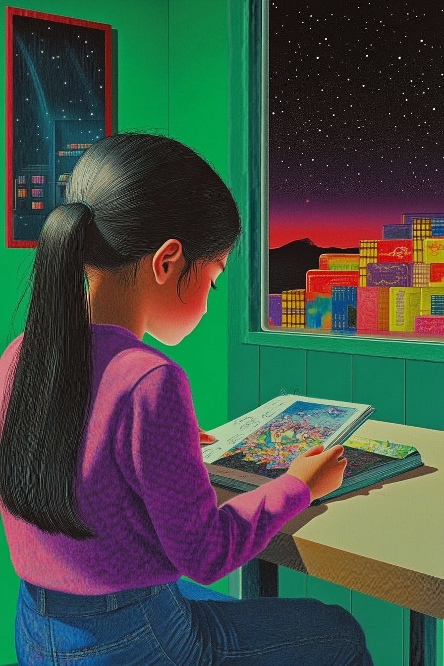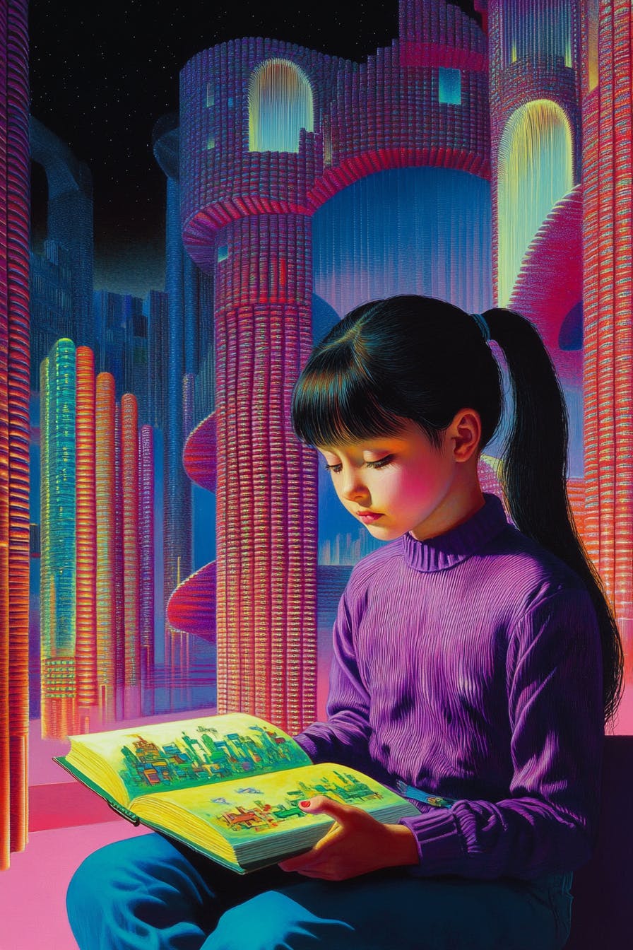 (6 year old girl, black ponytail, purple shirt and jeans) sitting alone, staring at her sketchbook, deep in thought. The scenes of her dreams that she has drawn appear faintly before her eyes, In the background, the interior of the Dream Library: dreams are stacked like glowing books, futuristic, futuristic --chaos 10 --ar 2:3 --sref 680572301 --v 6.1