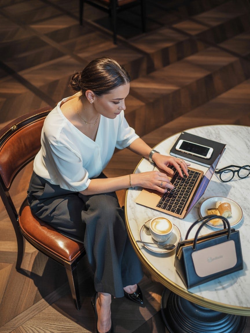 A beige cozy European-style cafe interior, top-down view, marble round table with a woman working on a laptop, wearing a white loose blouse and black pants, sitting on a classic dark wooden chair with brown leather seat, cup of cappuccino, small pastry plate with fork, black notebook, stylish small black handbag with beige interior detail, dark herringbone wood flooring, elegant warm lighting, sophisticated and realistic photography style, depth of field, lifestyle editorial photo, beige theme,