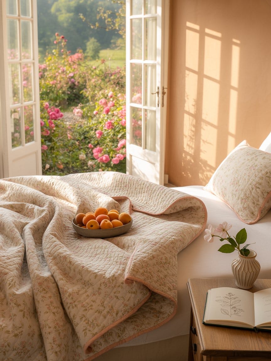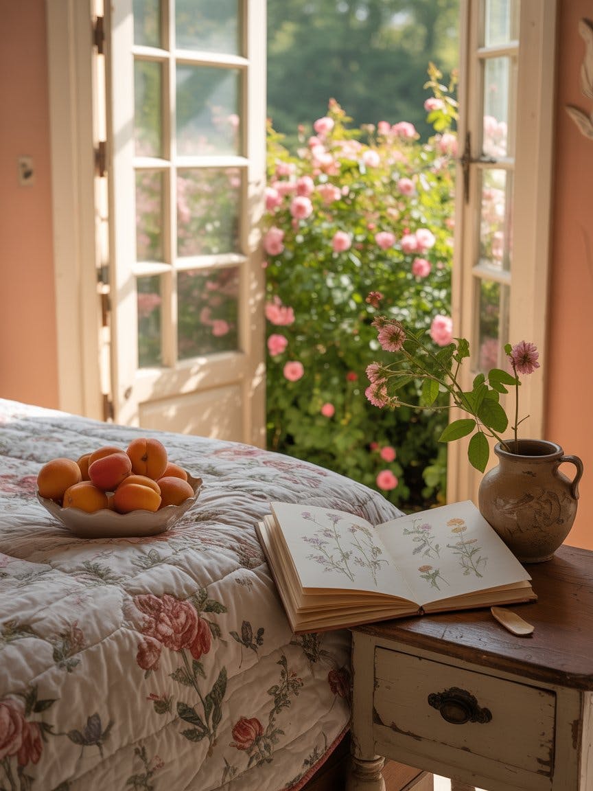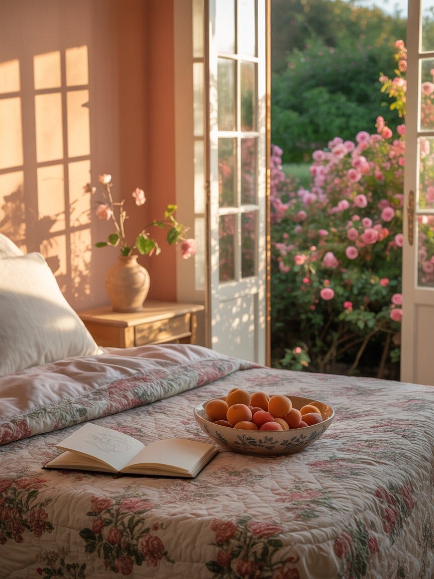 Romantic country bedroom, open French doors to blooming spring garden, warm sunlight and soft shadows, floral quilt bedspread, fresh apricot bowl on bed, open sketchbook , wooden nightstand with ceramic flower vase, peach walls, pink flowering roses outside the window, cozy and tranquil atmosphere, cottagecore interior, natural textures, golden hour light, tranquil morning moment, rich greenery and pale pink flowers, charming rustic furnishings