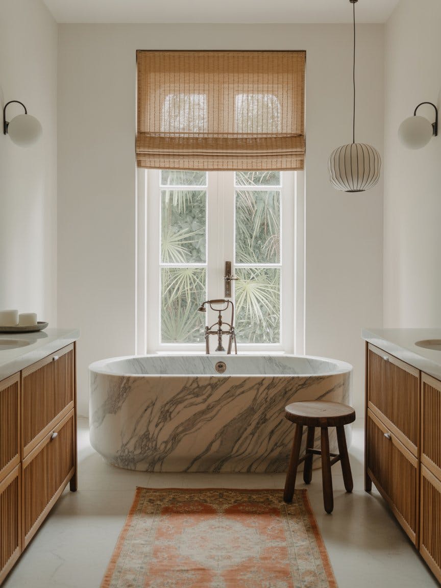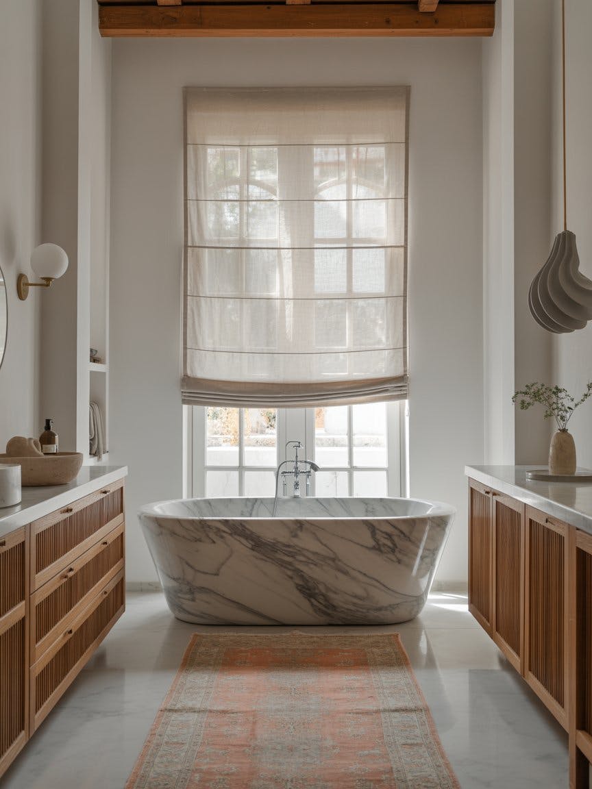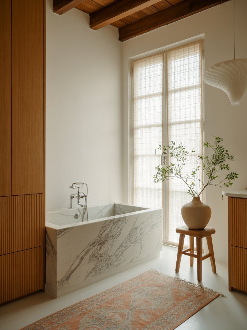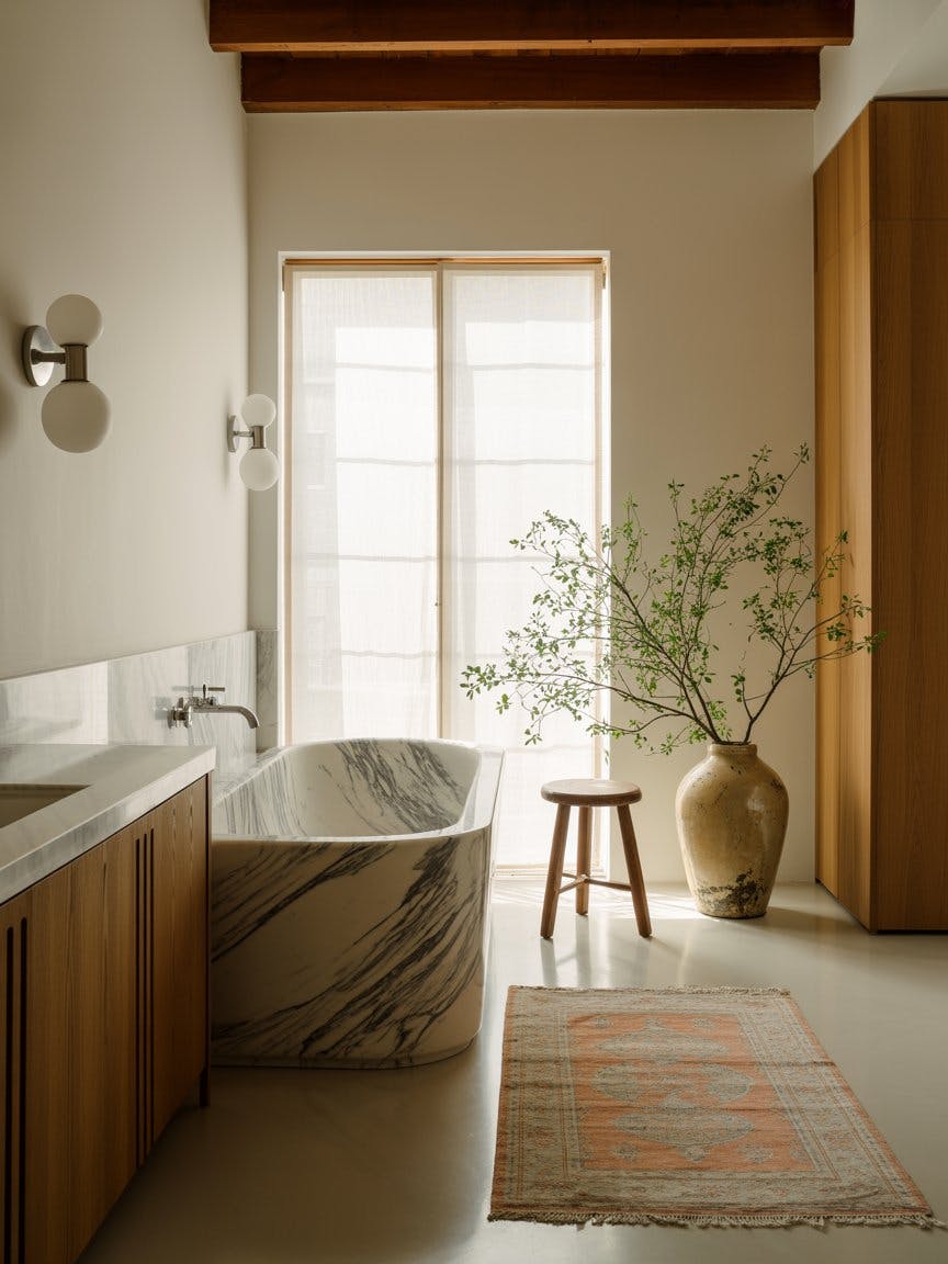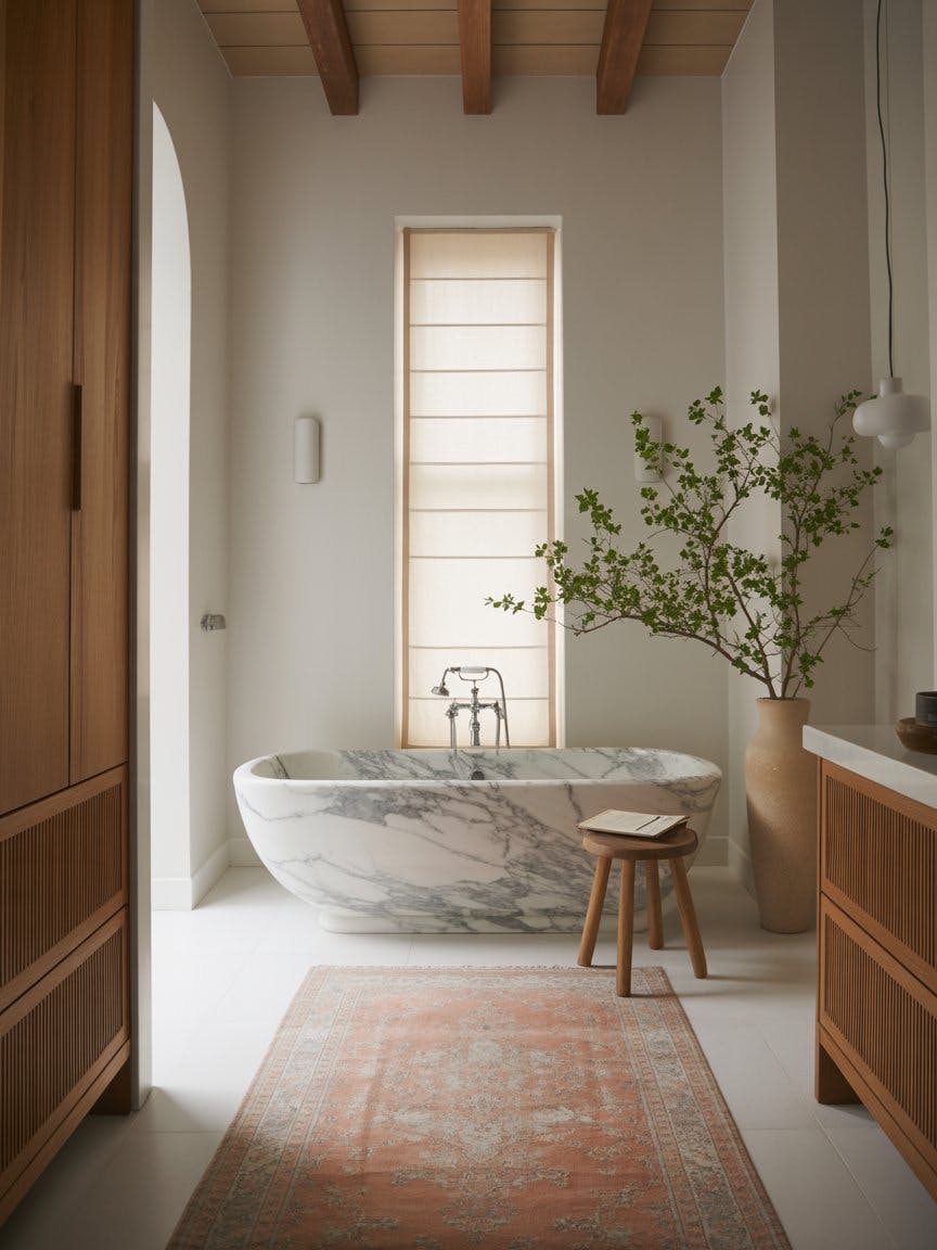 Minimalist luxury bathroom, Scandinavian and Mediterranean fusion interior, natural oak cabinetry with vertical grooves, white marble countertops and marble-wrapped bathtub with dramatic veining, soft filtered light through a tall French door with Roman shade, warm wooden ceiling beams contrasting against crisp white walls, vintage Persian runner rug in faded peach and cream tones, wall-mounted sconces with white globe shades, modern pendant light with sculptural white fabric shade, simple wooden stool next to the tub, large ceramic vase with leafy green branches, serene and refined ambiance, natural materials, soft color palette, high-definition interior design photography, airy and tranquil atmosphere.