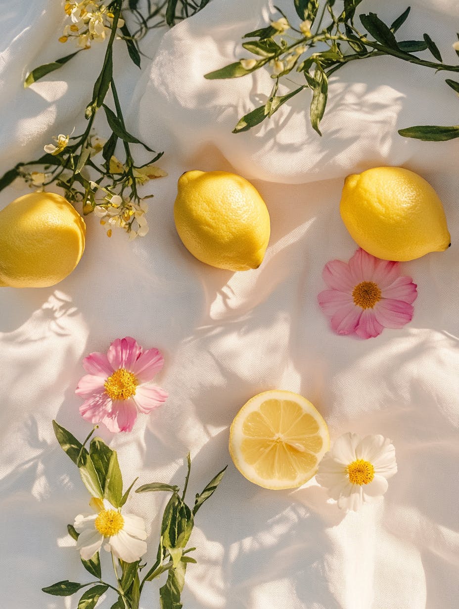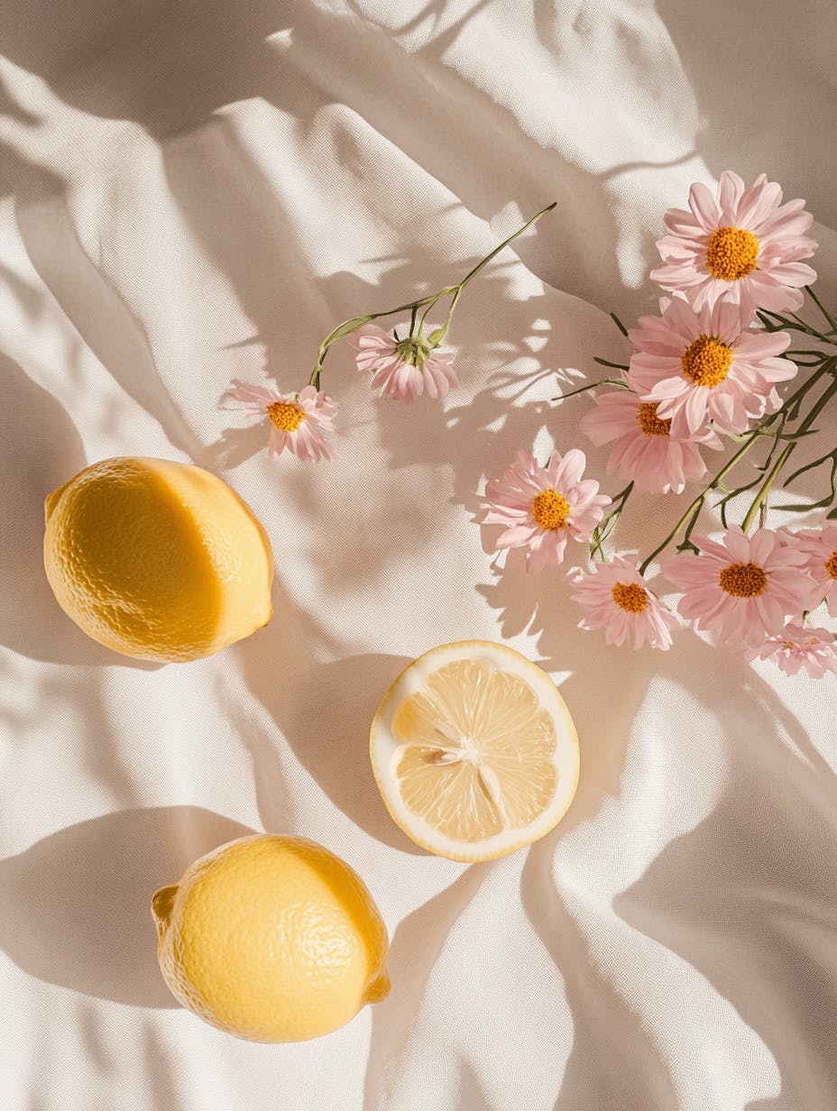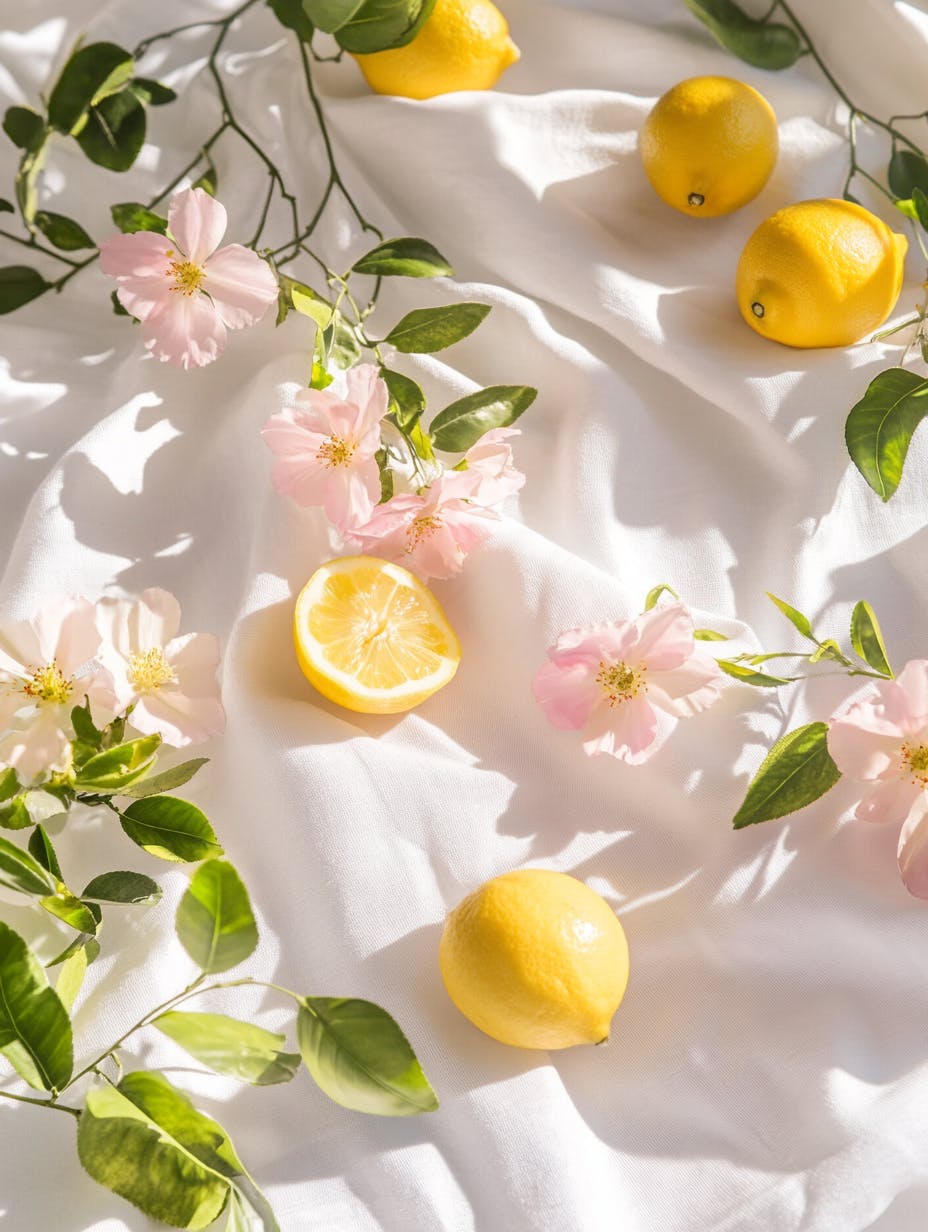 view from above, Soft summer aesthetic, fresh lemons, delicate pink wildflowers, white linen fabric, natural sunlight casting soft shadows, magazine with minimal typography, calm and serene vibe, warm tones, minimal composition, gentle textures, bright yellow and pastel pink color palette, relaxed and refreshing atmosphere, editorial style photography, high-definition details, natural