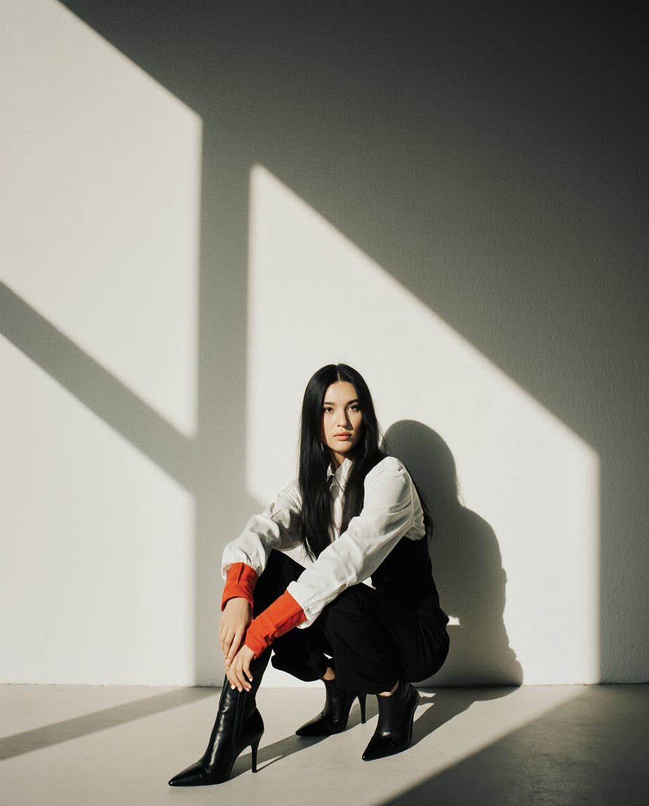Moody fashion editorial photography, minimalistic setting, dramatic natural light casting geometric shadows on a plain wall, woman in a black fitted dress with long sleeves, crouched pose, sleek long black hair, soft yet intense facial expression, accented by bright red sleeve cuffs, high-heeled ankle boots, high contrast lighting, cinematic composition, artistic and modern aesthetic, soft muted color palette.