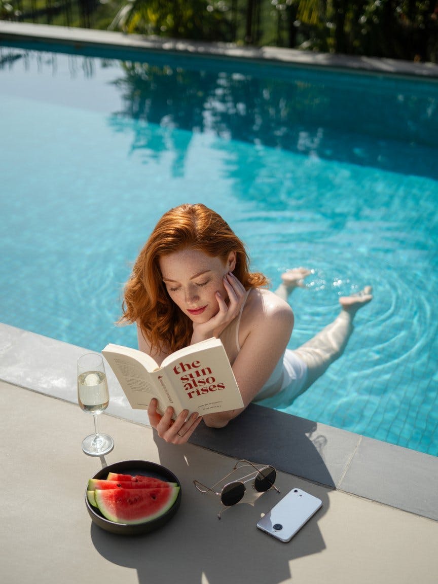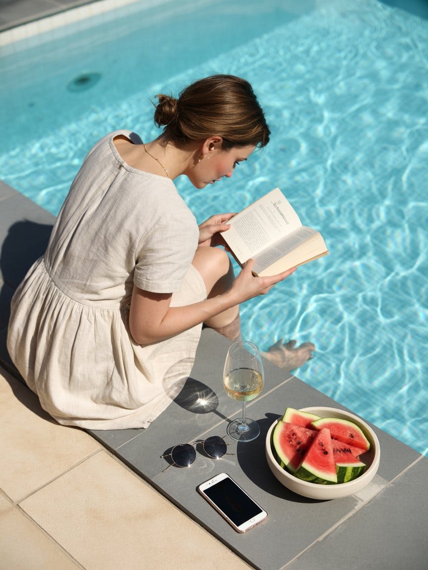 Top-down view of a lightly tanned, serene Zen-style woman reading a book at the edge of a swimming pool, her elbows resting on the poolside, upper body out of the water, head slightly bowed over the open book, calm expression, clear turquoise water with shimmering light reflections, a glass of chilled white wine beside her, a bowl of neatly sliced watermelon, iPhone and sunglasses on the grey stone surface, bright sunny day, relaxed summer atmosphere, minimal and modern lifestyle aesthetic, peaceful vacation vibe, crisp shadows, high-definition textures, serene tropical setting