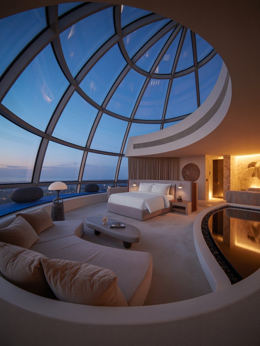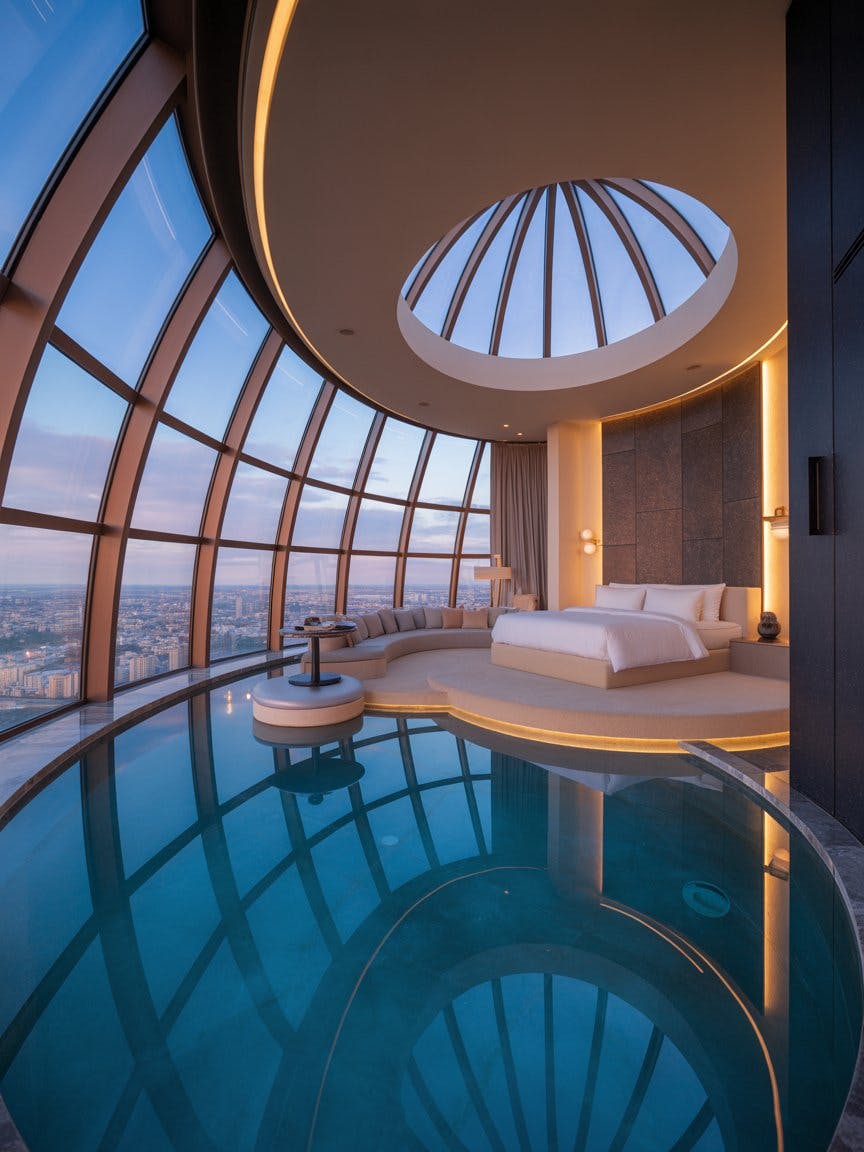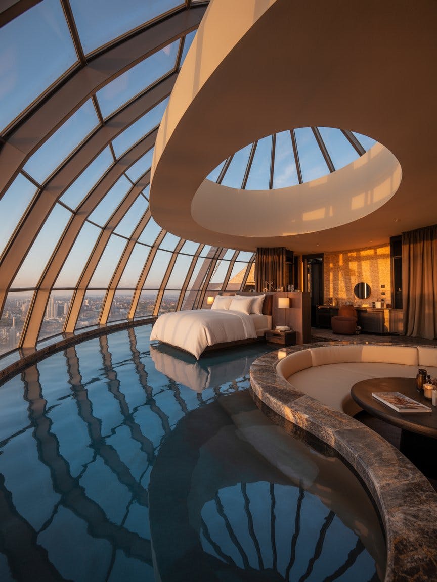 Top-floor suite with spiral-shaped plan, private indoor pool, wrap-around curved glass walls, bronze and stone finishes, natural textures throughout. Master bed under a dome skylight, sunken seating area, private dining enclave, spa-style bathroom with ambient lighting. World-class sophistication, natural luxury at its peak.