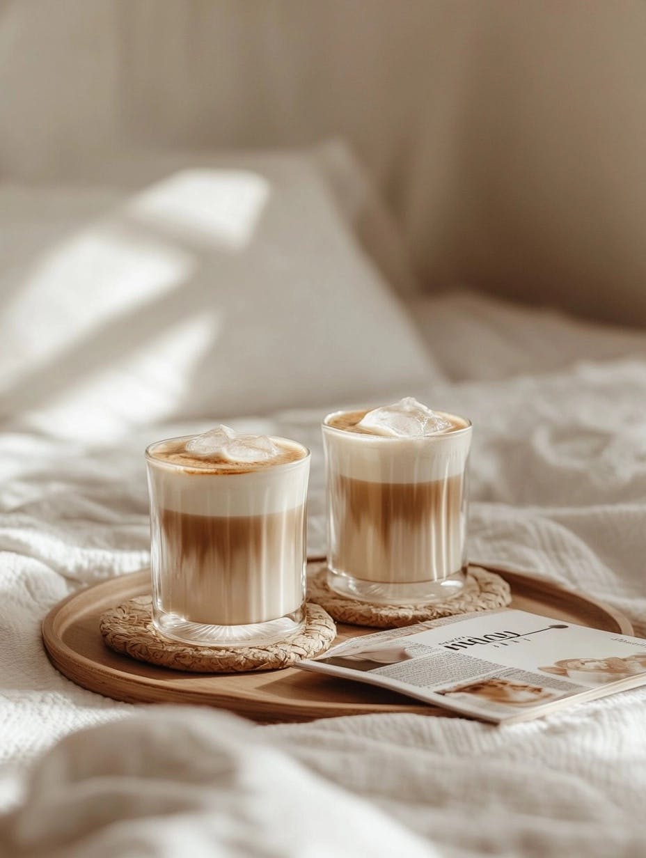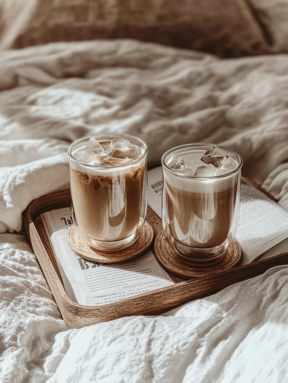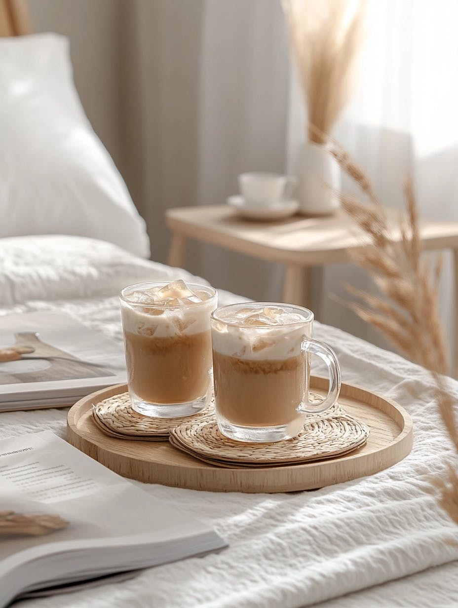 Round wooden tray with two iced lattes in glass cups, modern coasters, minimalistic aesthetic, soft natural lighting, cozy white bed linens, neutral tones, relaxing morning ambiance, lifestyle magazines with minimalist typography, gentle and serene atmosphere, warm and inviting setup, Scandinavian-inspired design, high-definition details --chaos 10 --ar 3:4 --v 6.1
