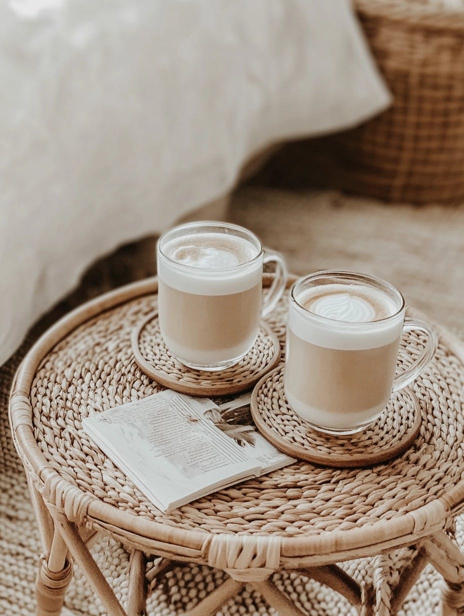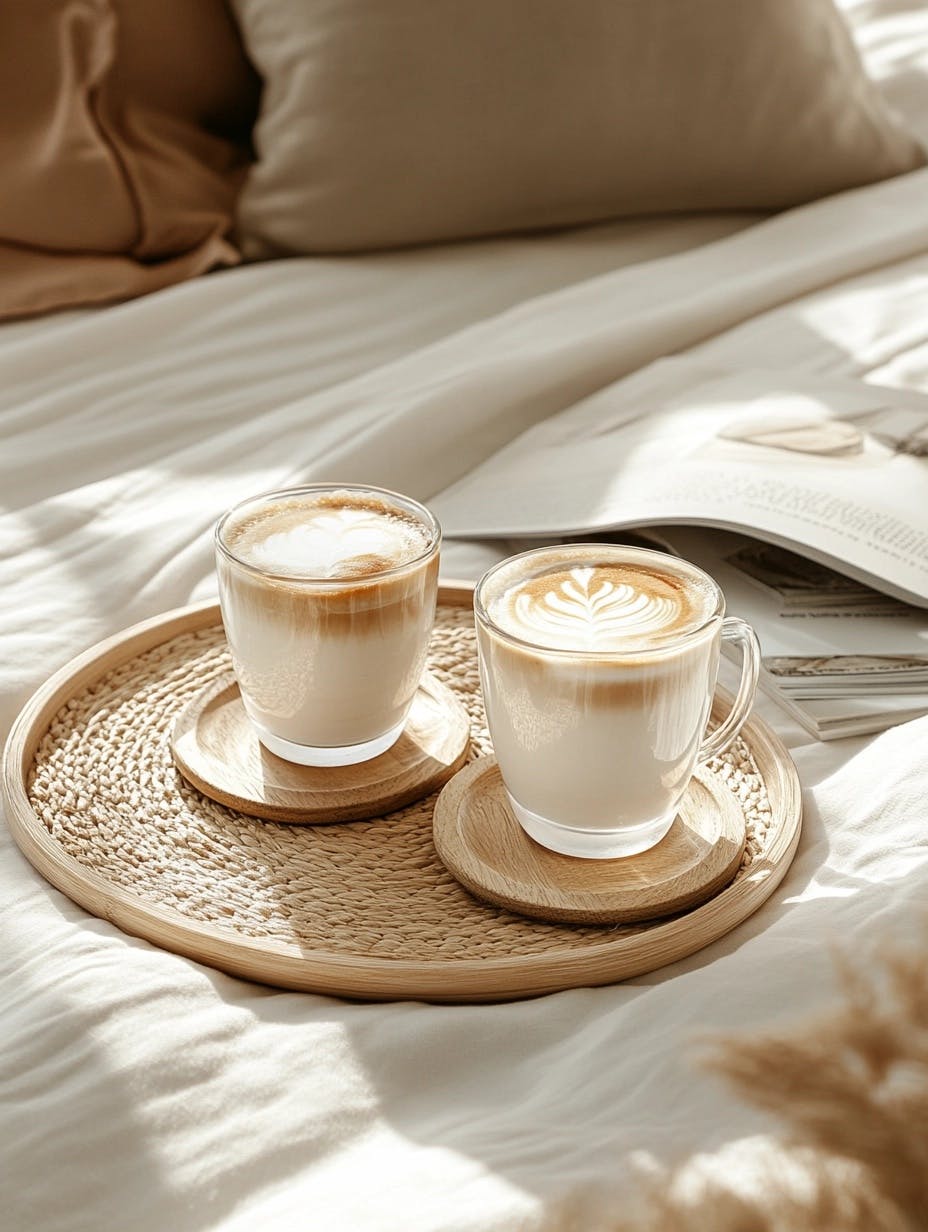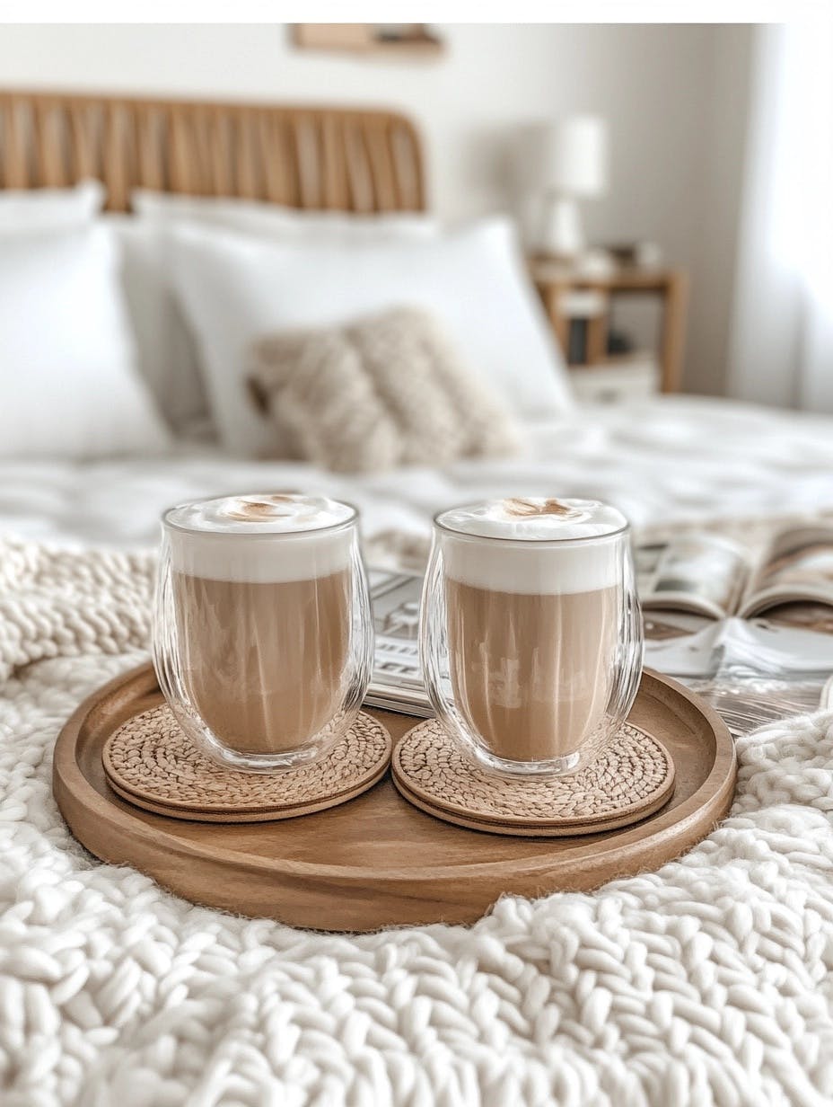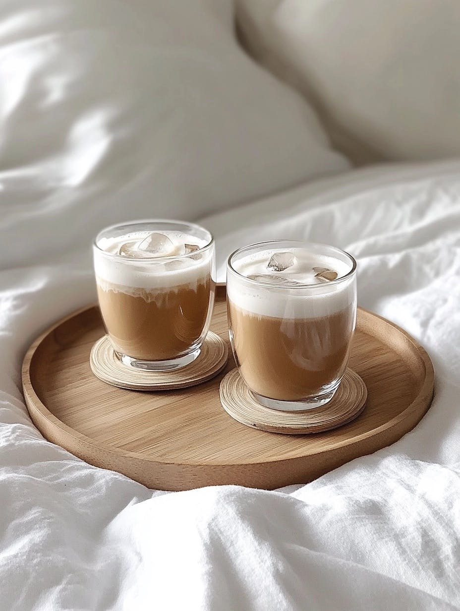 Round wooden tray with two iced lattes in glass cups, modern coasters, minimalistic aesthetic, soft natural lighting, cozy white bed linens, neutral tones, relaxing morning ambiance, lifestyle magazines with minimalist typography, gentle and serene atmosphere, warm and inviting setup, Scandinavian-inspired design, high-definition details --chaos 10 --ar 3:4 --v 6.1
