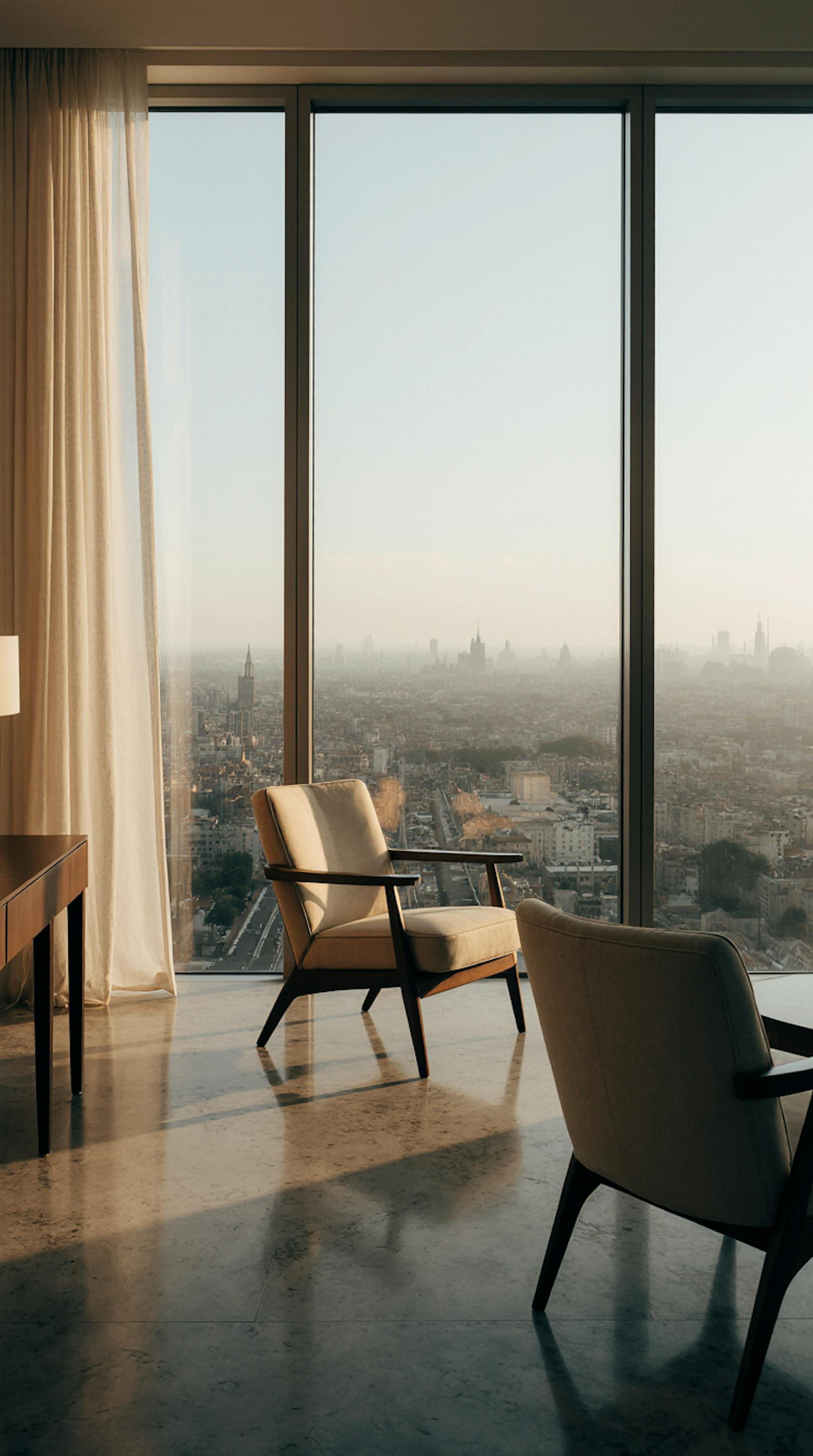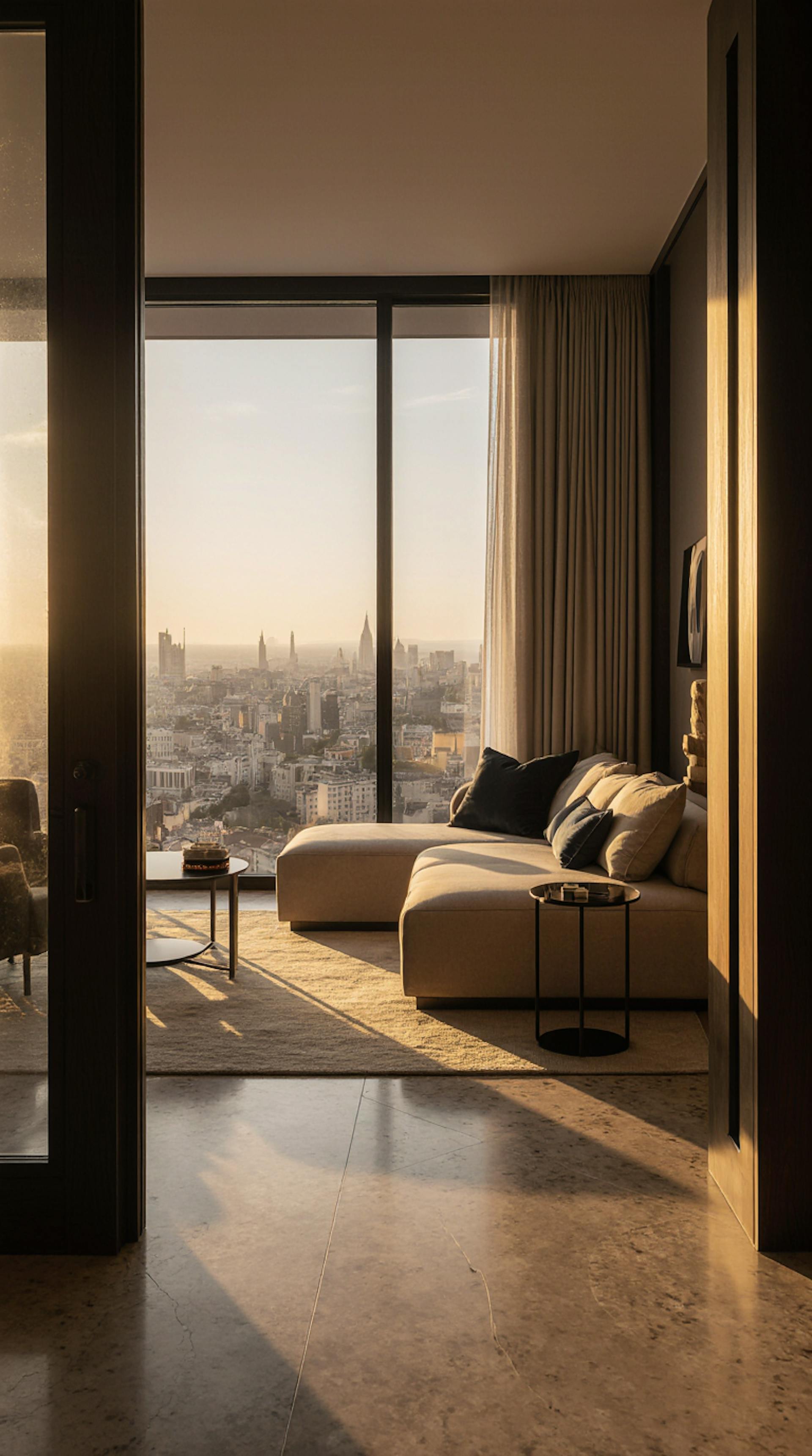 ultra-luxury hotel tower suite, panoramic floor-to-ceiling windows overlooking a glowing European city skyline at dusk, warm beige and deep walnut tones, marble flooring, soft ambient lighting, refined modern minimalism, high-end editorial style