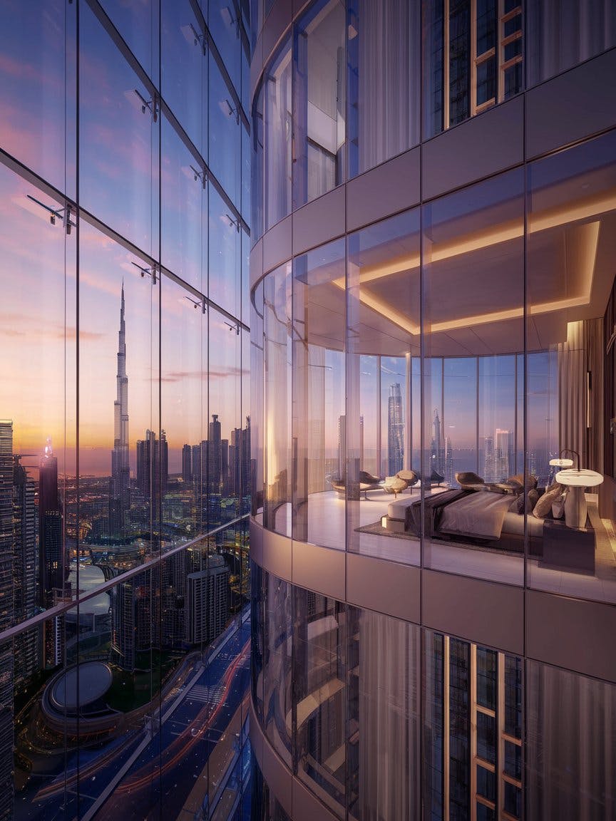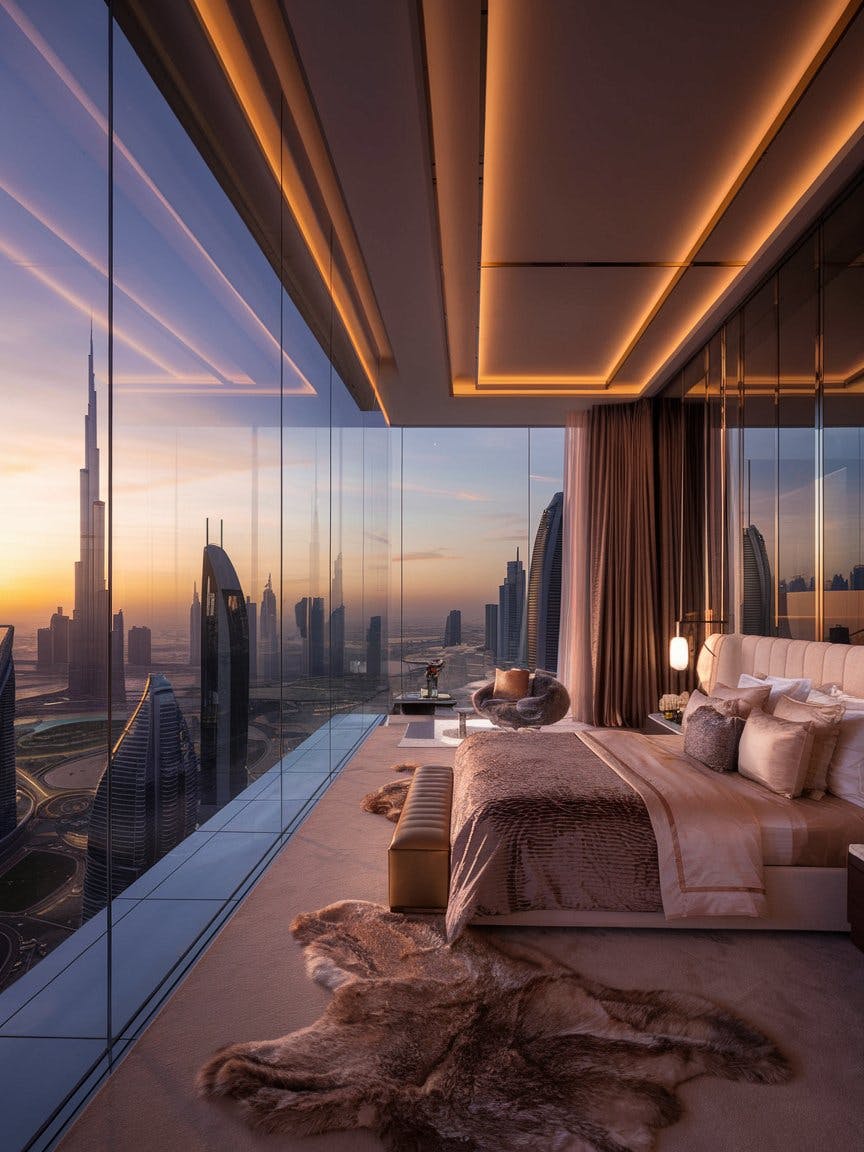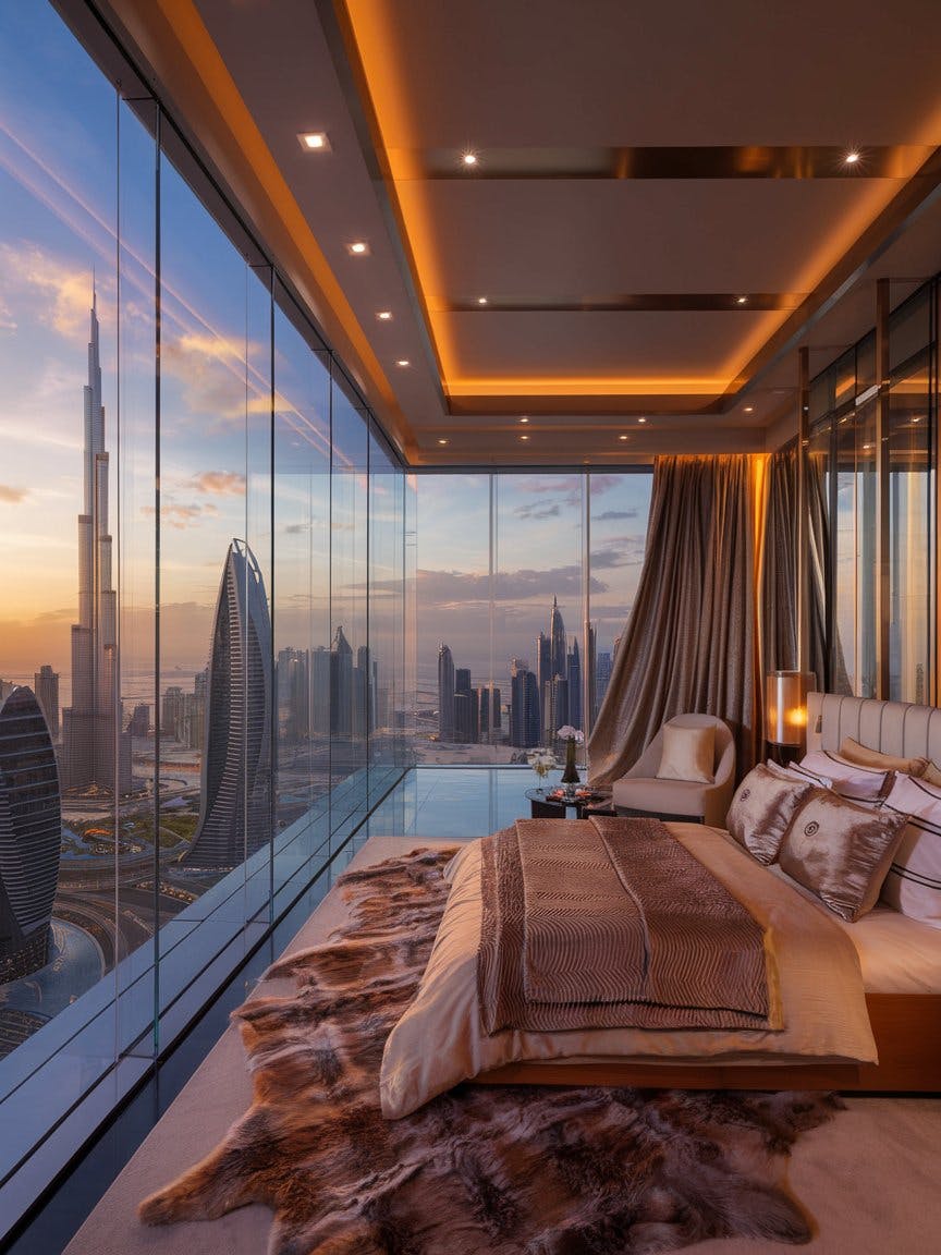 Ultra-luxury modern bedroom in a high-rise skyscraper, floor-to-ceiling glass windows showcasing a breathtaking city skyline at sunset, view of futuristic Dubai-style architecture including Burj Khalifa, warm ambient lighting with recessed ceiling lights, soft golden hour glow reflecting on the glass buildings, elegant minimalist interior design, king-size bed with neutral tones and plush pillows, velvety textured brown and beige bedding, large cozy fur rug, sleek furniture in warm wood and bronze accents, sophisticated curtains flowing from ceiling to floor, tranquil atmosphere, cinematic lighting, ultra-realistic, high-definition details, luxury urban lifestyle, dreamy panoramic view