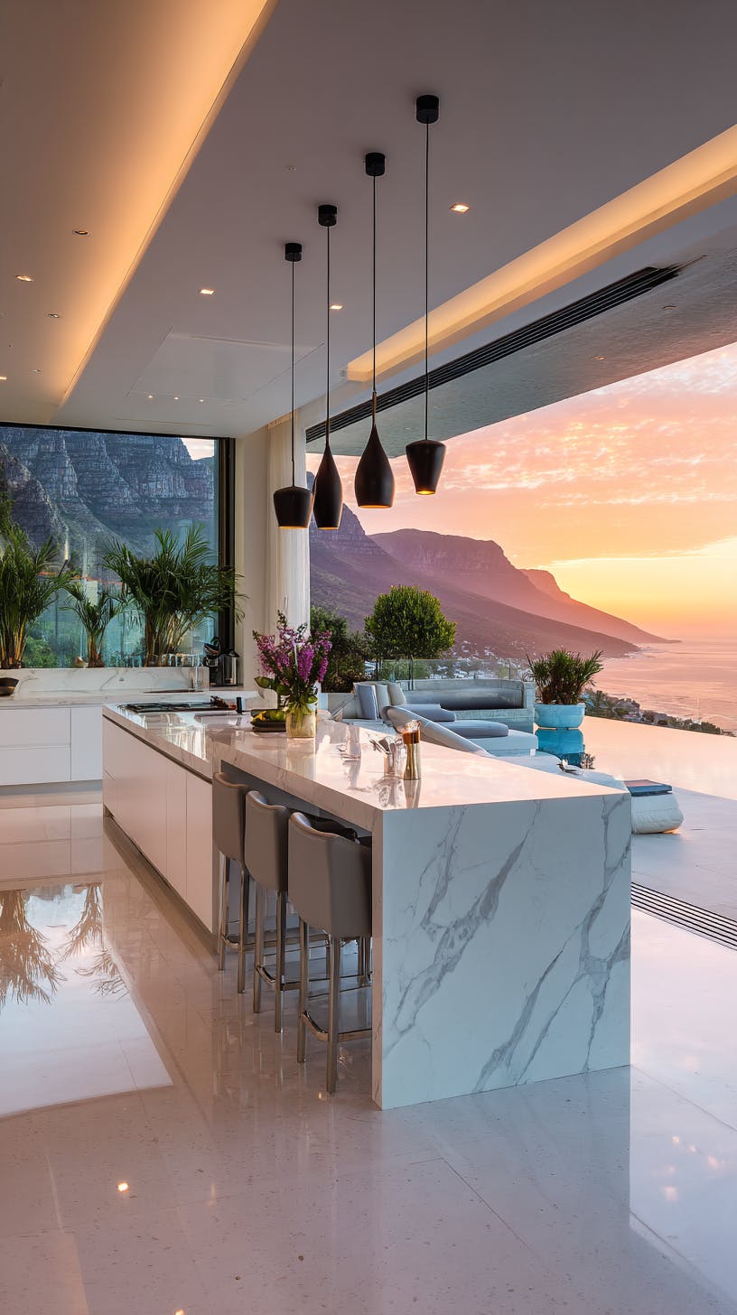 Ultra-modern open-plan kitchen set at golden-hour light, floor-to-ceiling glass wall overlooking the same rugged mountain-and-sea panorama and infinity pool as in the reference image, polished white marble flooring extending outdoors, waterfall quartz island with integrated cooktop and breakfast bar, handle-less matte-white cabinetry against a glass backsplash reflecting warm sunset hues, sculptural black pendant lights suspended from a recessed cove ceiling with hidden LED strips, minimal brass hardware, a row of sleek gray leather counter stools, lush potted palms at the perimeter, seamless indoor-outdoor flow, serene high-end luxury aesthetic --ar 9:16 --raw