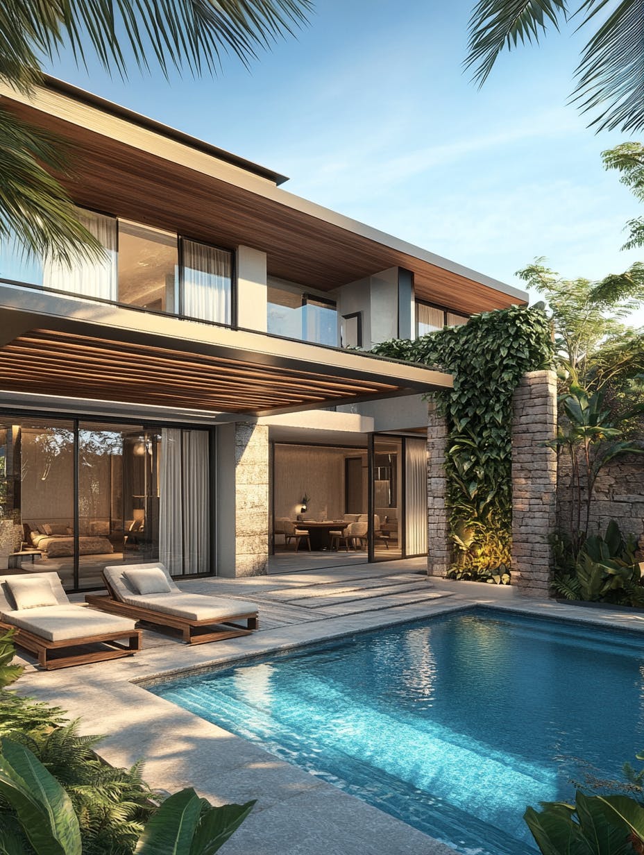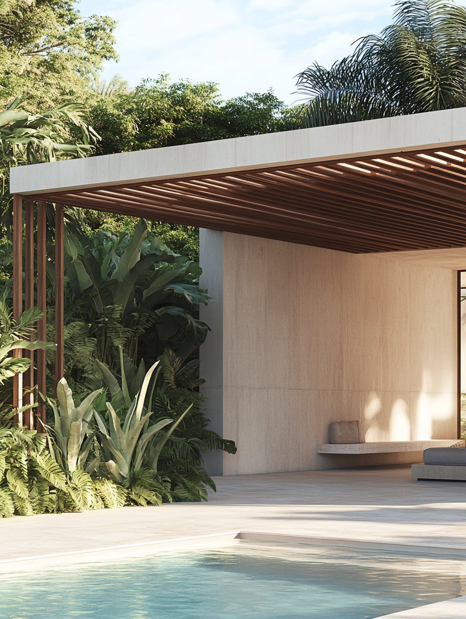 Ultra-modern tropical luxury home with minimalist design, open-plan layout seamlessly connecting indoor and outdoor living spaces, double-height ceiling, wooden slatted pergola roof, vertical garden wall, pool with light stone surround, lush green landscaping, elegant natural textures, floor-to-ceiling glass walls, soft natural daylight, Brazilian modernist influence, photorealistic, high-end architecture