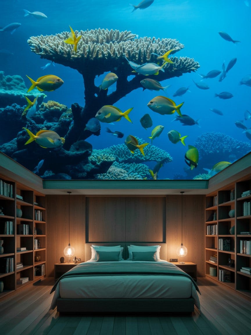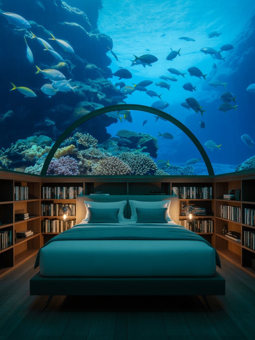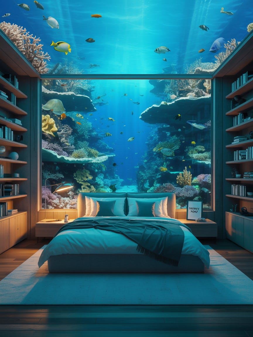 Underwater-themed bedroom with a massive floor-to-ceiling aquarium window, lush coral reefs and vibrant sea life visible through the glass, cozy modern interior with wooden bookshelves lining both walls, soft ambient lighting, minimalist bed with white and teal bedding, tranquil atmosphere, deep ocean blues and greens, serene and immersive design, luxury underwater living concept, cinematic lighting, photorealistic style, ultra-high detail, dreamlike composition