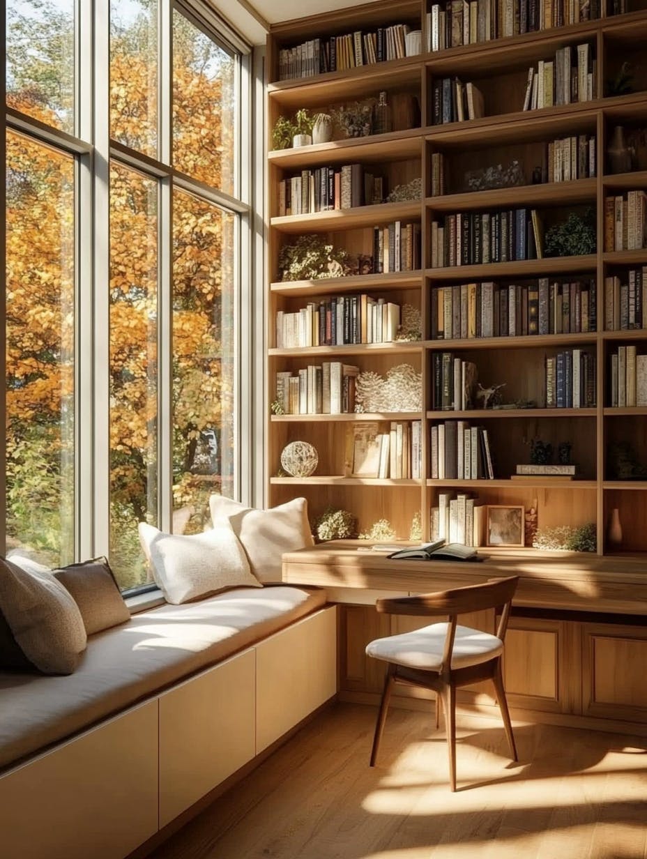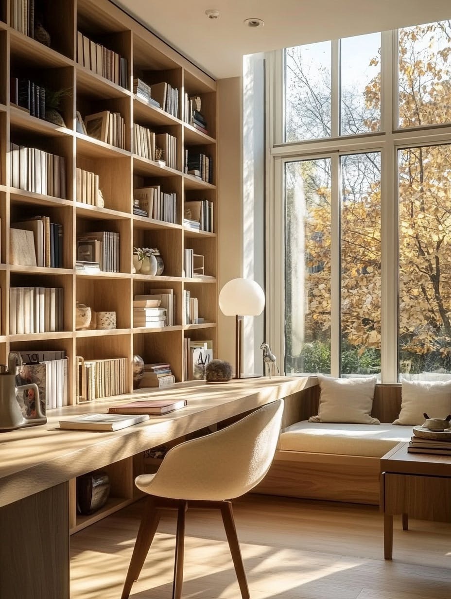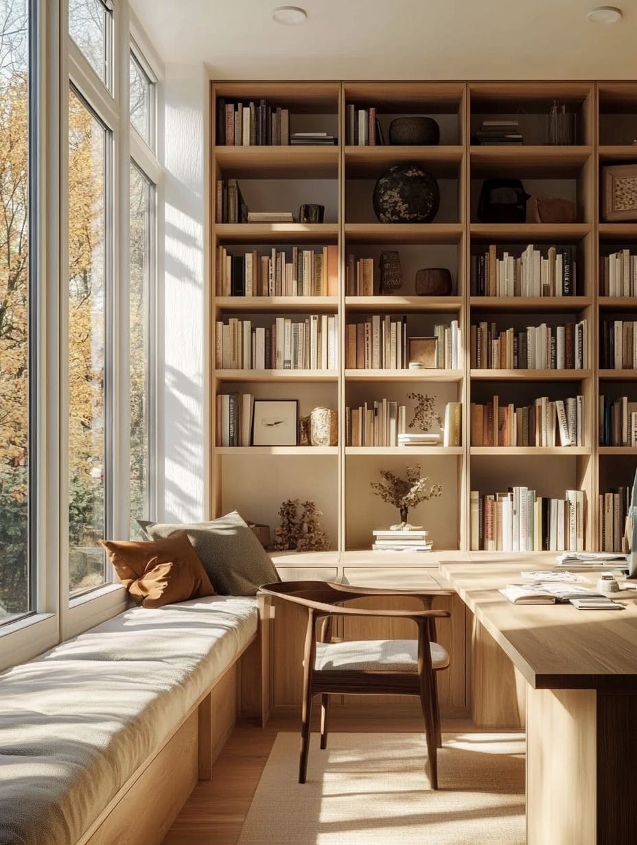Warm and inviting home library with a built-in wooden desk, floor-to-ceiling bookshelves filled with books and decorative elements, large windows allowing golden sunlight to stream in, cozy reading nook with plush cushions, earthy neutral tones, minimalist Scandinavian design, natural wood textures, soft shadows and warm lighting, peaceful and inspiring workspace, high-definition photography, cinematic ambiance, serene autumn afternoon setting. --ar 3:4