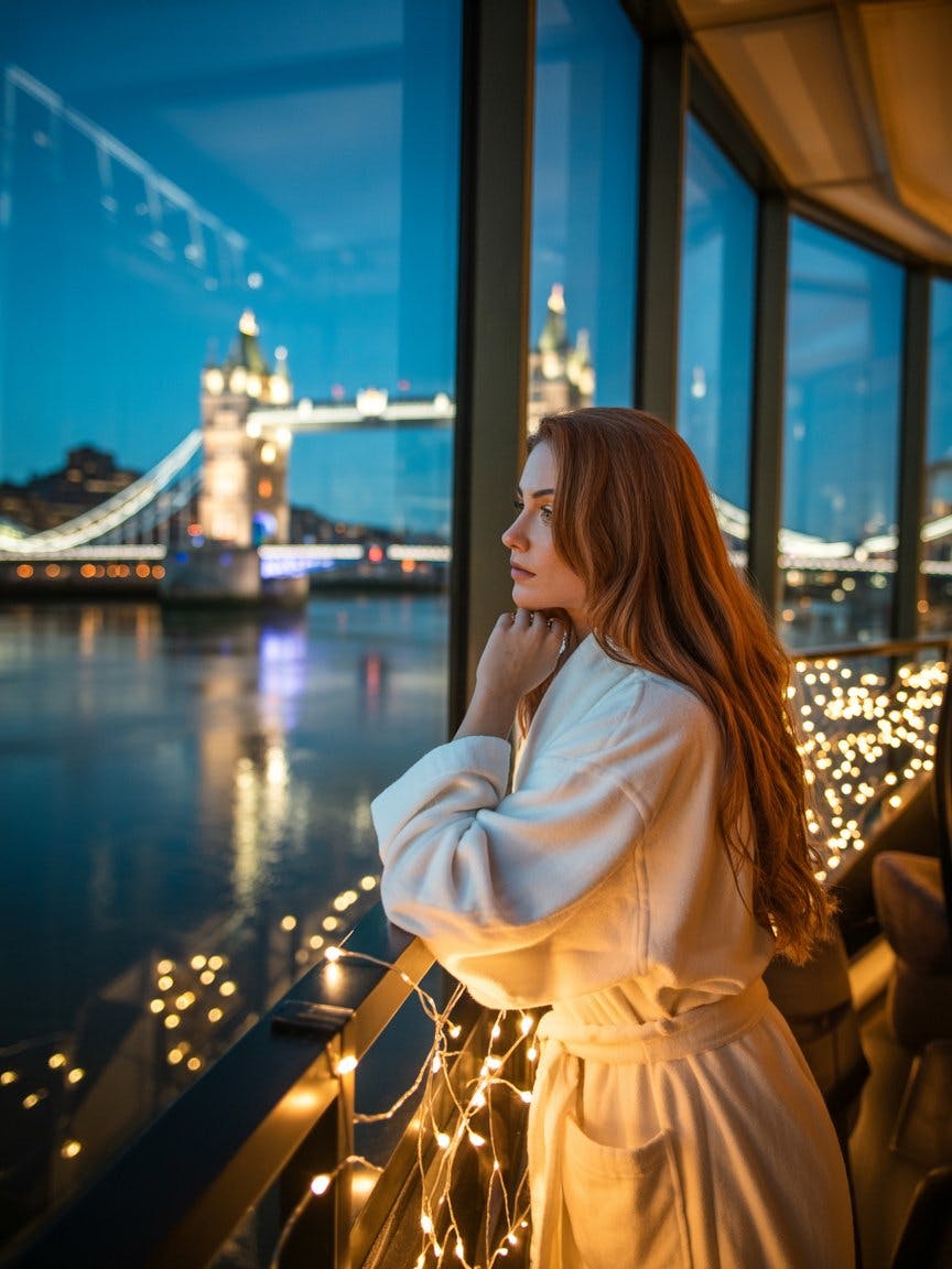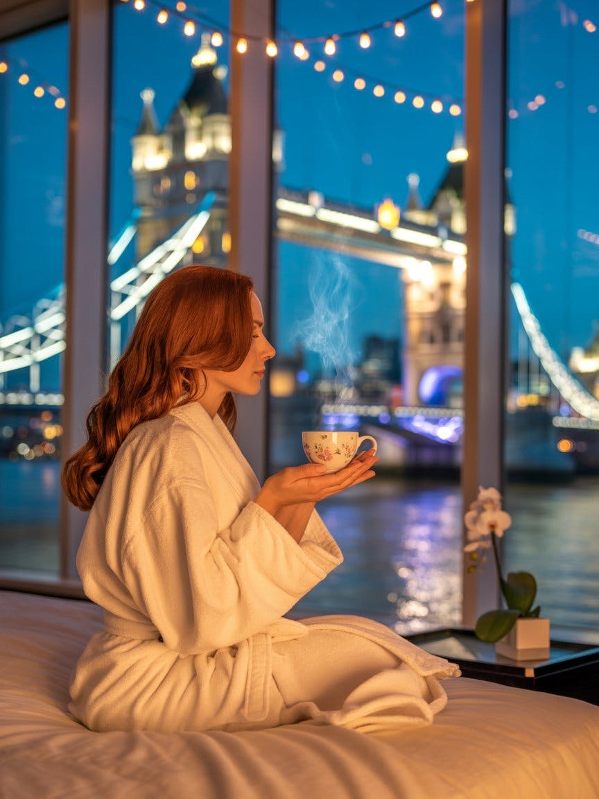 Woman in a cozy white bathrobe sitting on a bed, surrounded by warm fairy lights, holding a cup, looking out through large panoramic windows at the illuminated Tower Bridge at night, reflections on the River Thames, soft ambient glow from city lights, modern romantic hotel room interior, cinematic mood, dreamy cityscape view, peaceful night atmosphere, luxury travel aesthetic, London skyline backdrop, high-definition photography style
